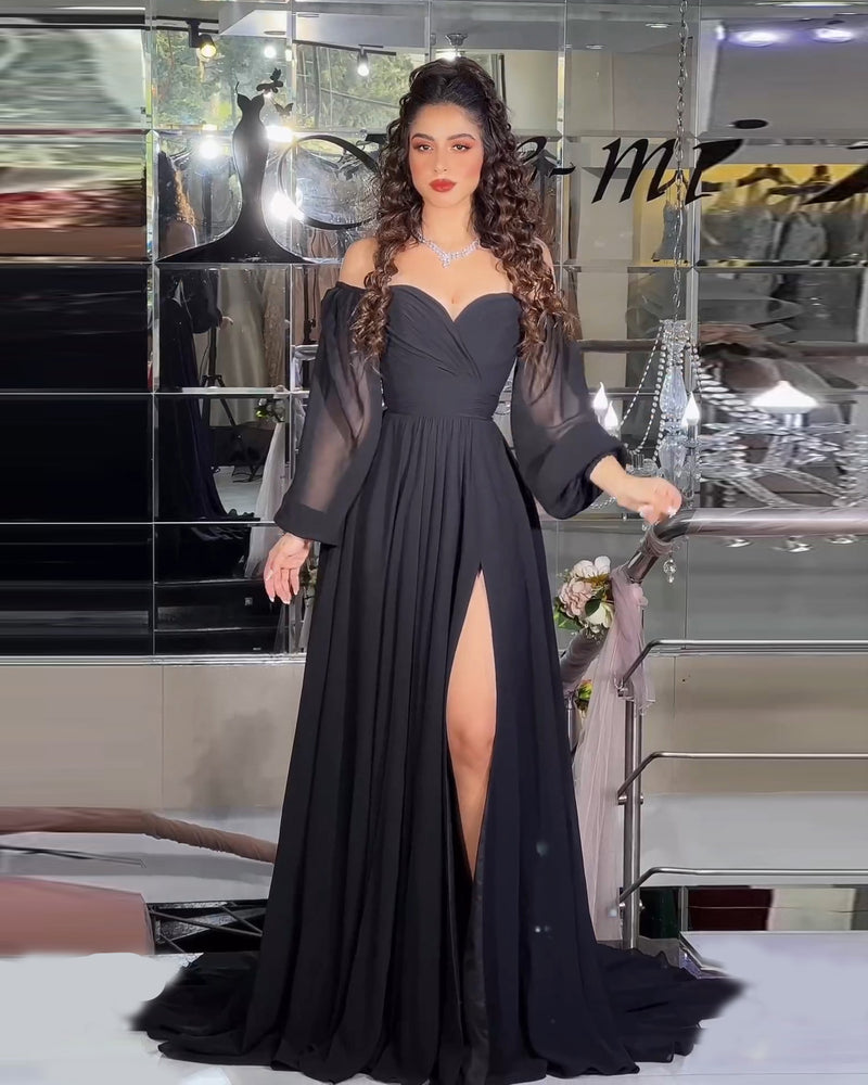 Elegant Black A-Line Long Sleeves Evening Dress with Slit SF045