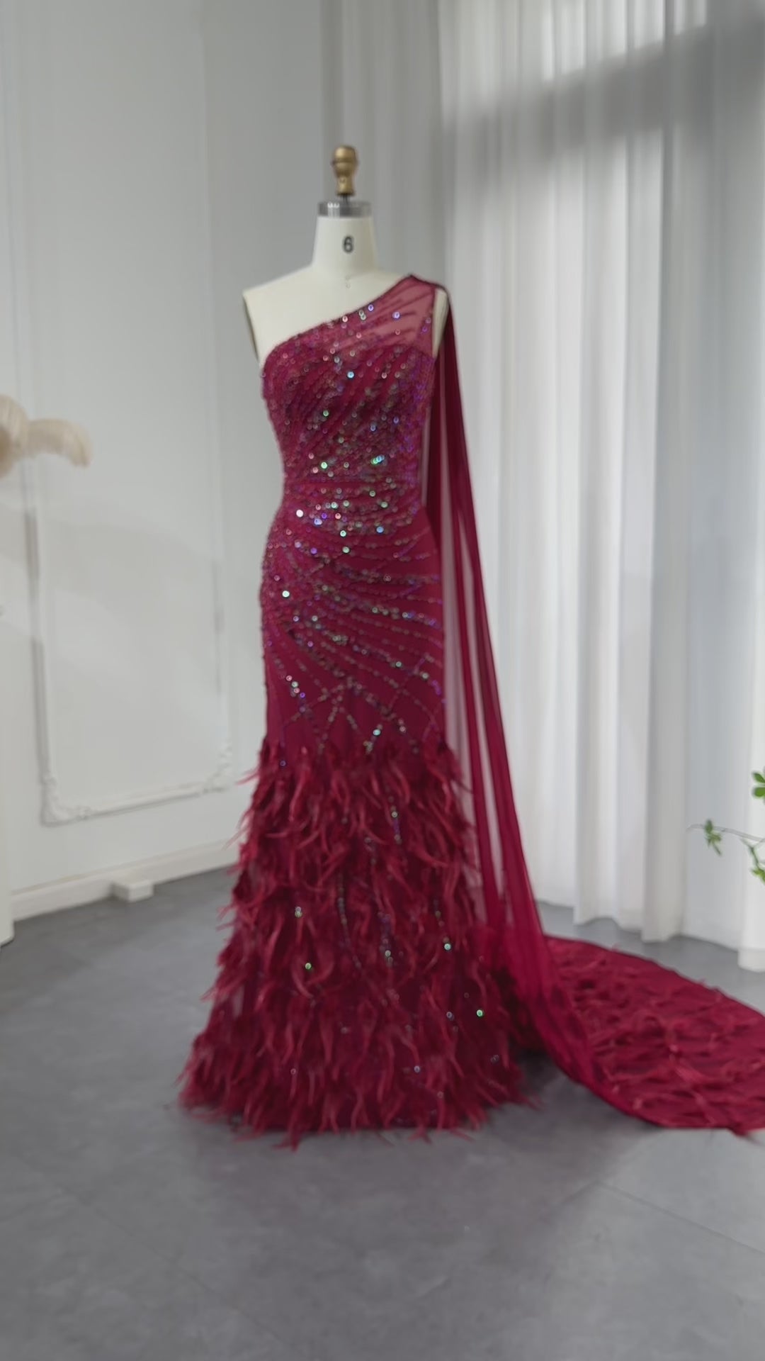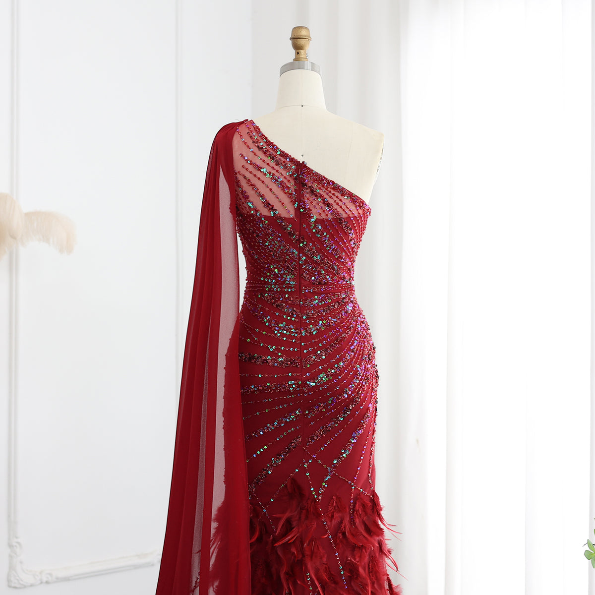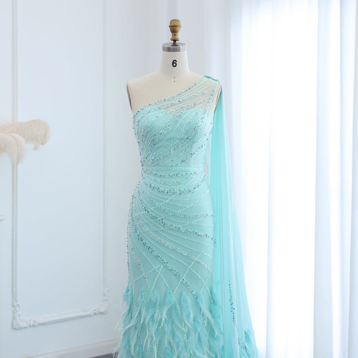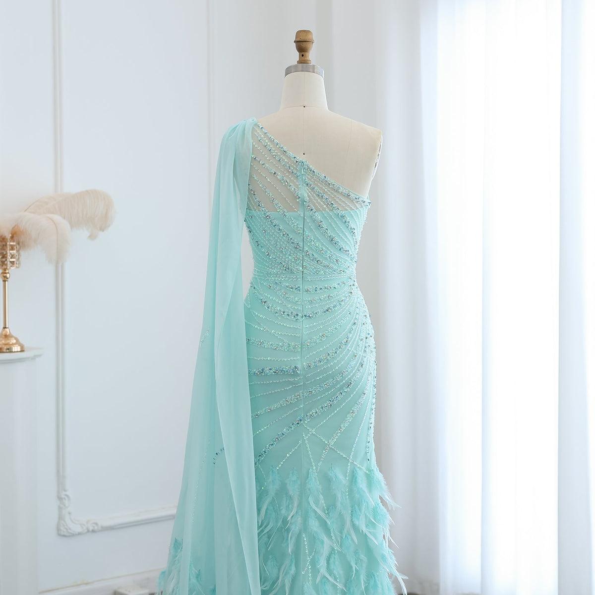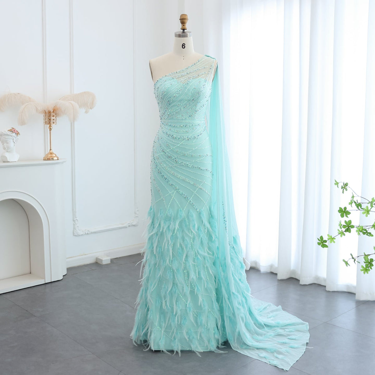 شارون سعيد فاخر ريشة فيروزي أكوا كتف واحد حورية البحر فستان سهرة مع ذيل كيب طويل حفلة موسيقية رداء حفلات الزفاف SS498