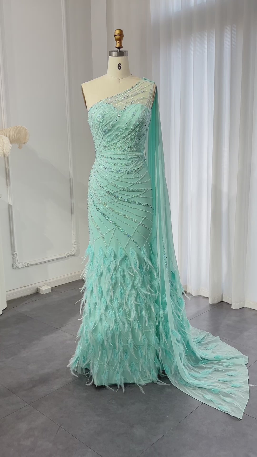 نقدم لكم فستان شارون سعيد المذهل ذو الريش الفيروزي المائي بكتف واحد حورية البحر مع ذيل طويل لحفلات الزفاف وحفلات الزفاف SS498. يتميز هذا الفستان الفريد بالريش الفاخر وتصميم جميل بكتف واحد، مع صورة ظلية آسرة لحورية البحر وذيل كيب متدفق. مثالي لمناسبتك الرسمية القادمة أو حفل زفافك.