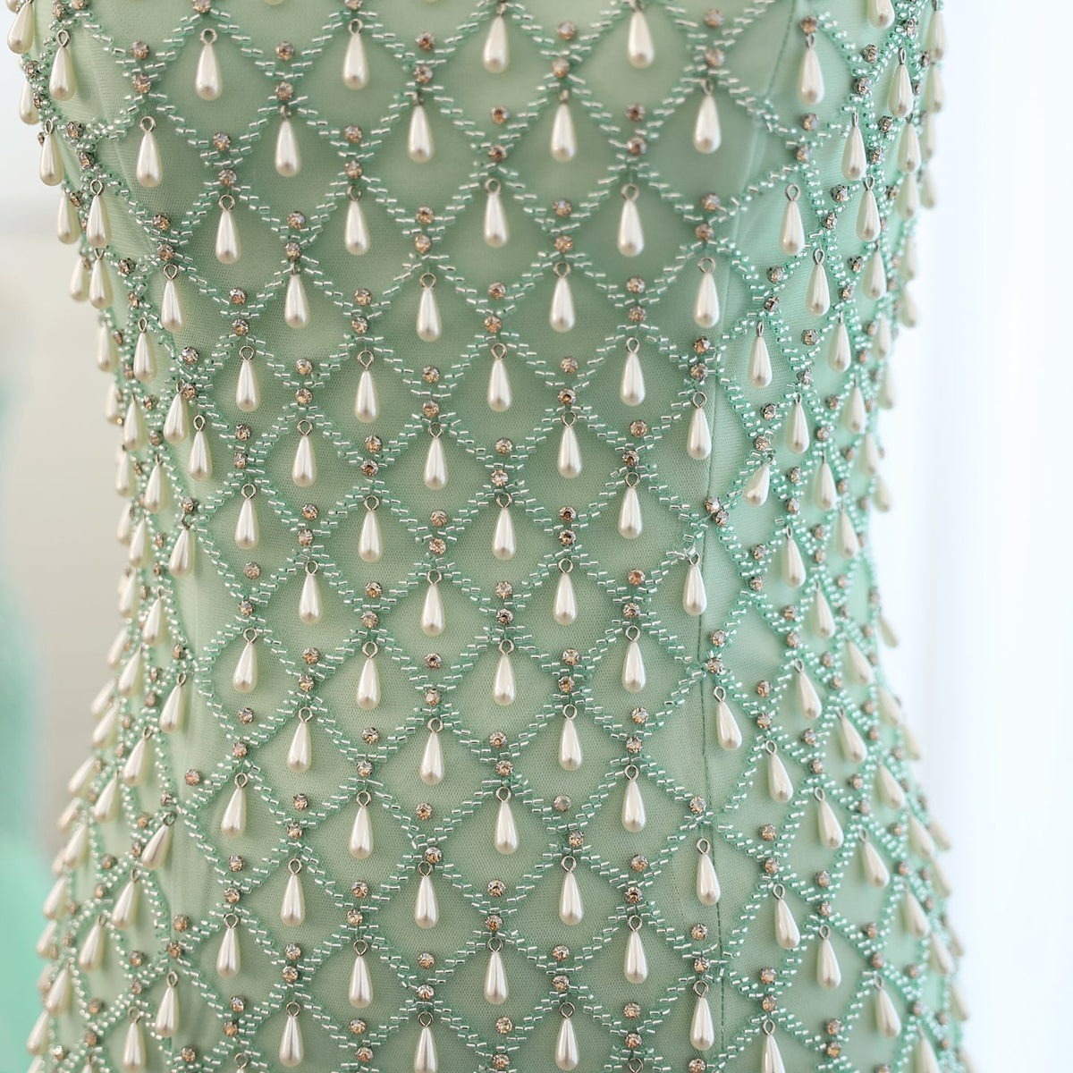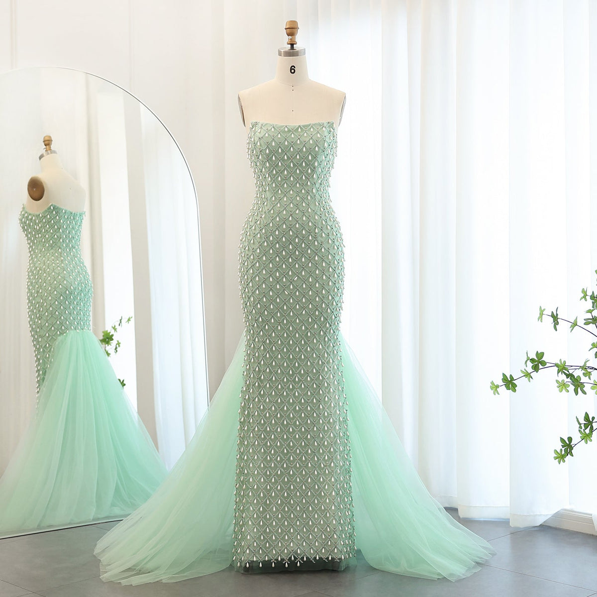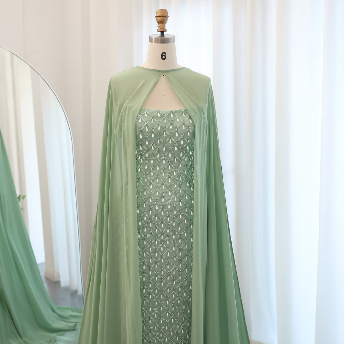 Luxury Pearls Sage Green Strapless Mermaid Evening Dress with Cape SS431