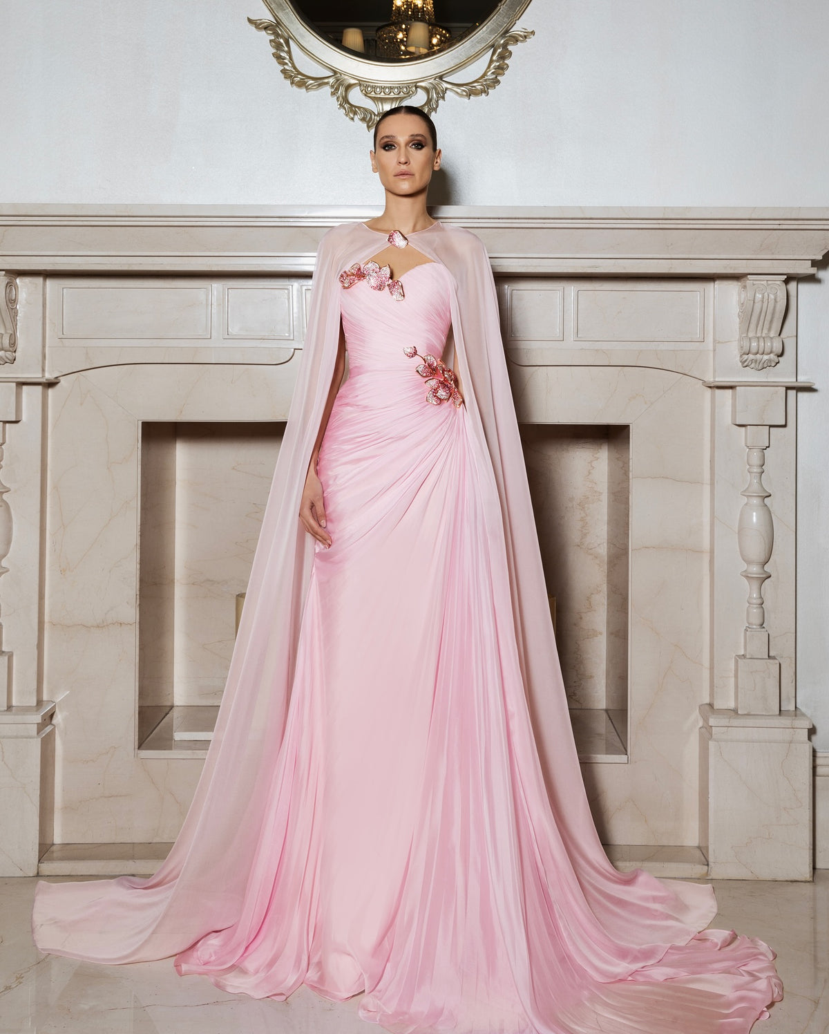 Elevate your evening wardrobe with this sophisticated light pink gown, designed for those who appreciate refined elegance. The romantic silhouette features a graceful cape that adds dramatic movement and timeless allure. Crafted with meticulous attention to detail, this dress combines delicate femininity with polished sophistication, making it an ideal choice for formal events, galas, and special occasions. The soft pink hue flatters a range of complexions while maintaining an understated luxury aesthetic. Perfect for the discerning wearer seeking a statement piece that balances contemporary style with classic romance.