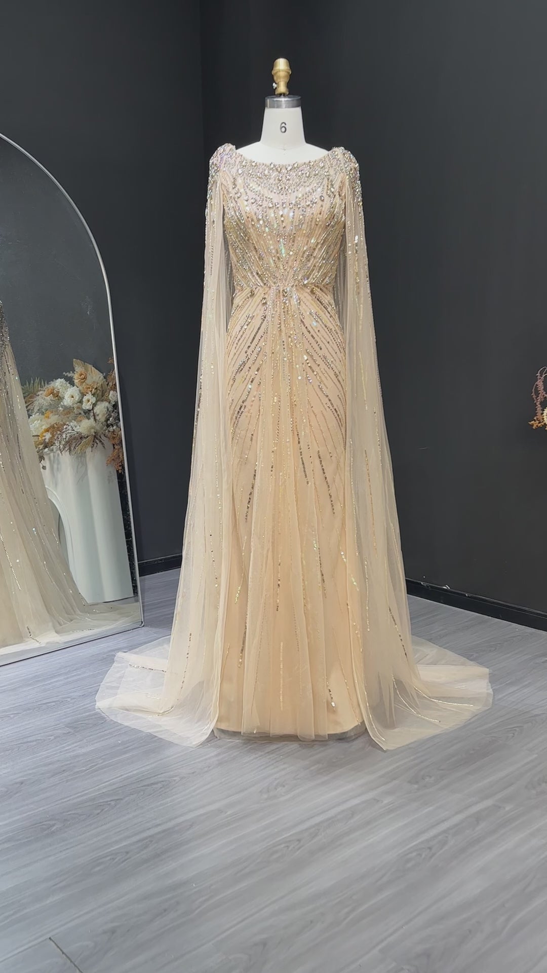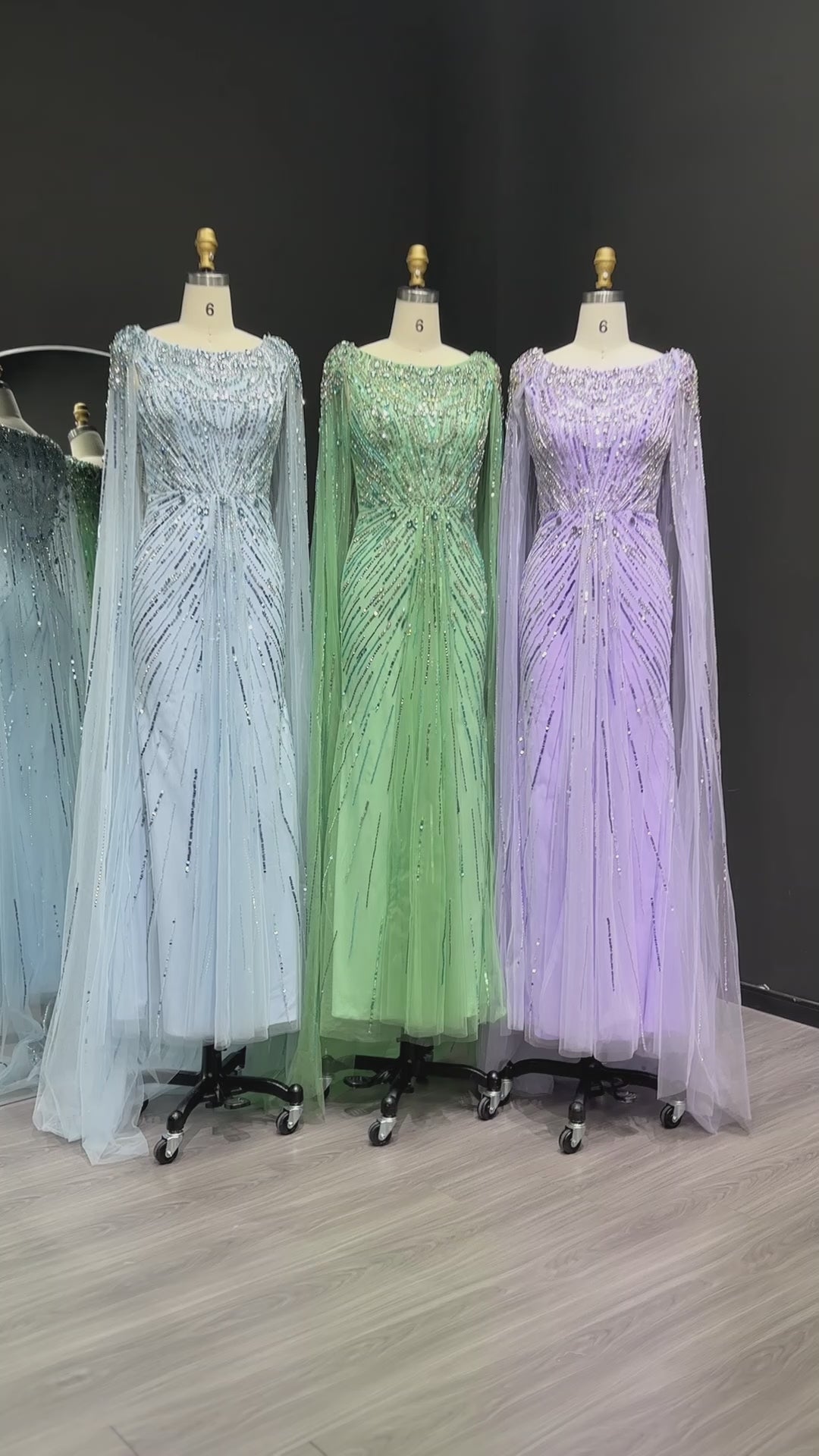 Elevate your evening elegance with this Luxury Crystal Lilac Evening Dress featuring delicate cape sleeves. The soft lilac hue complements the intricate crystal embellishments, creating a refined and graceful silhouette. Designed to drape beautifully, this dress offers a sophisticated look perfect for special occasions and formal events.