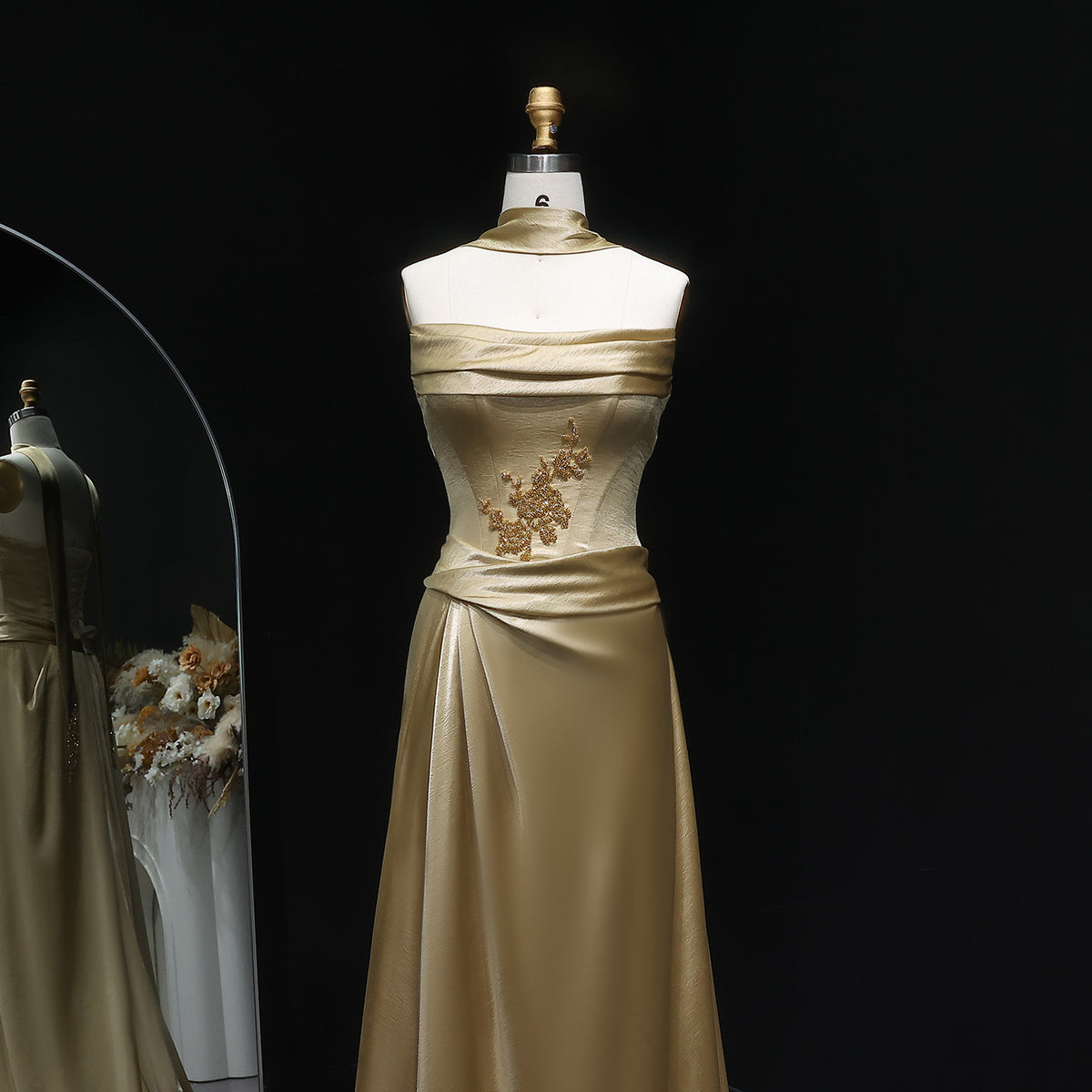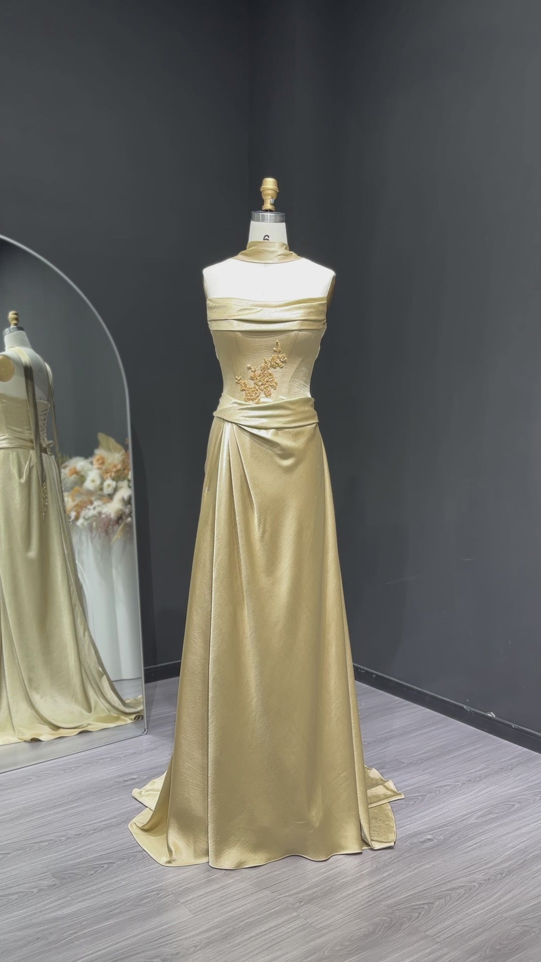Elegant Gold Satin Evening Dress with Floral Embroidery and Scarf SF286