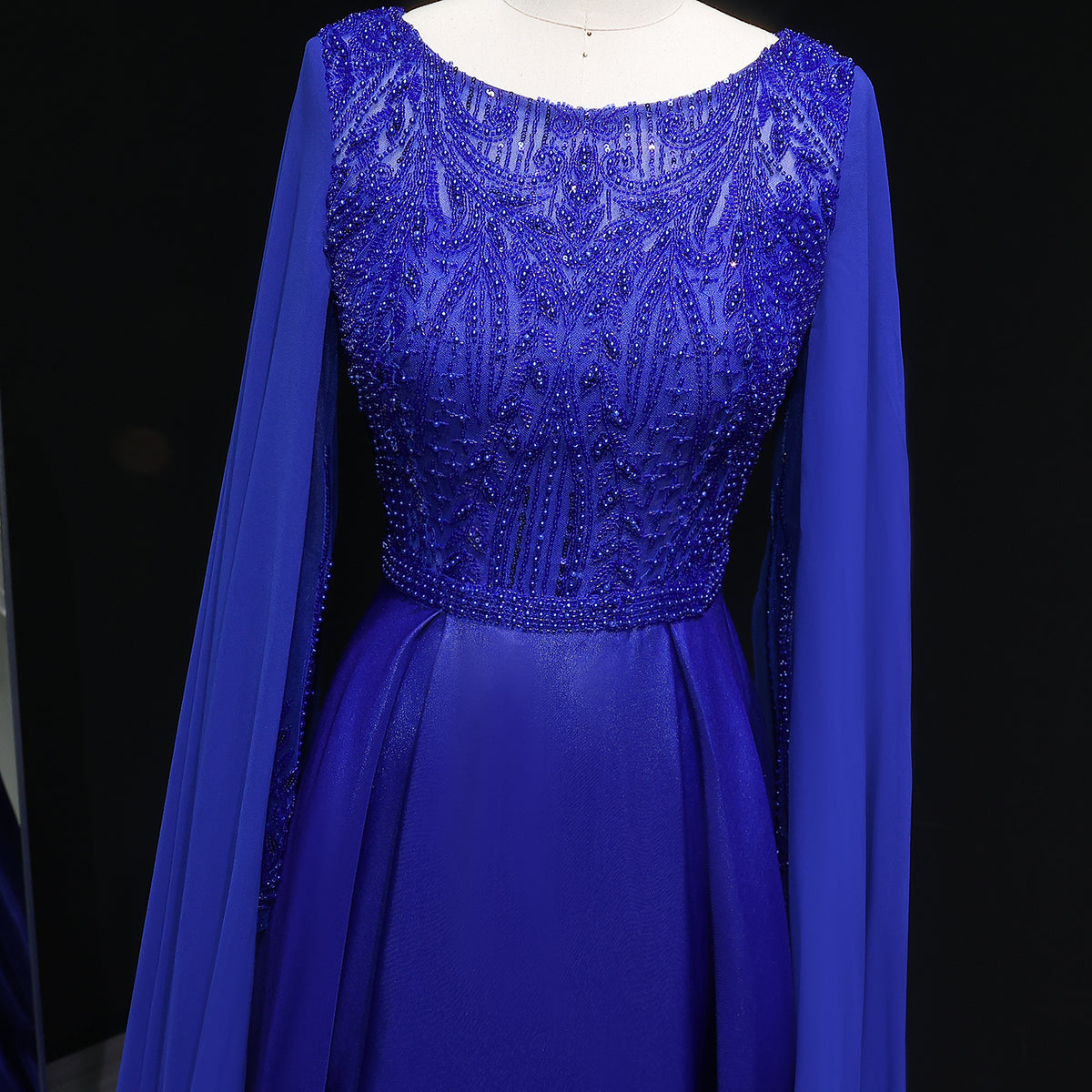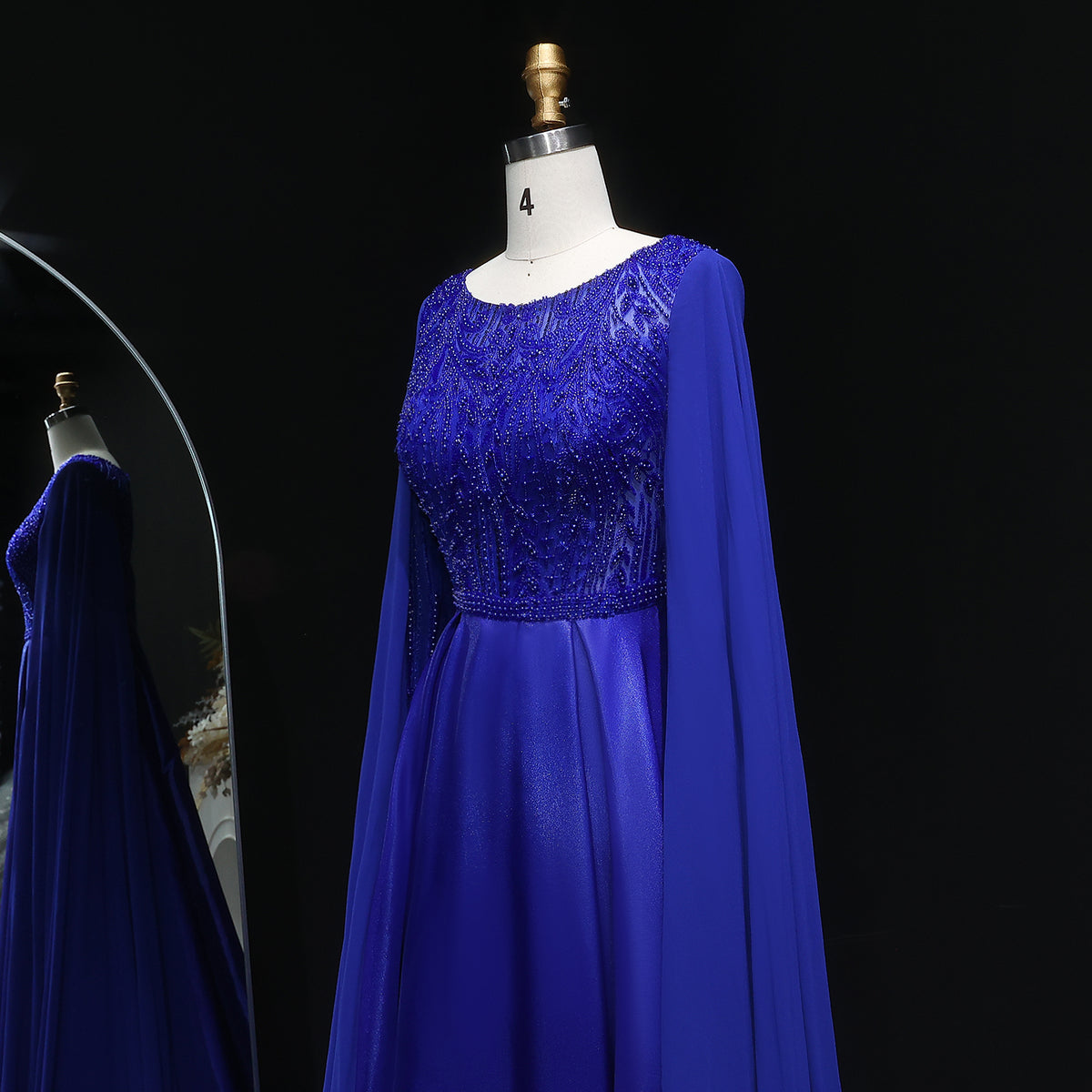 Luxury Royal Blue Beaded Evening Dress with Cape Sleeves SF359