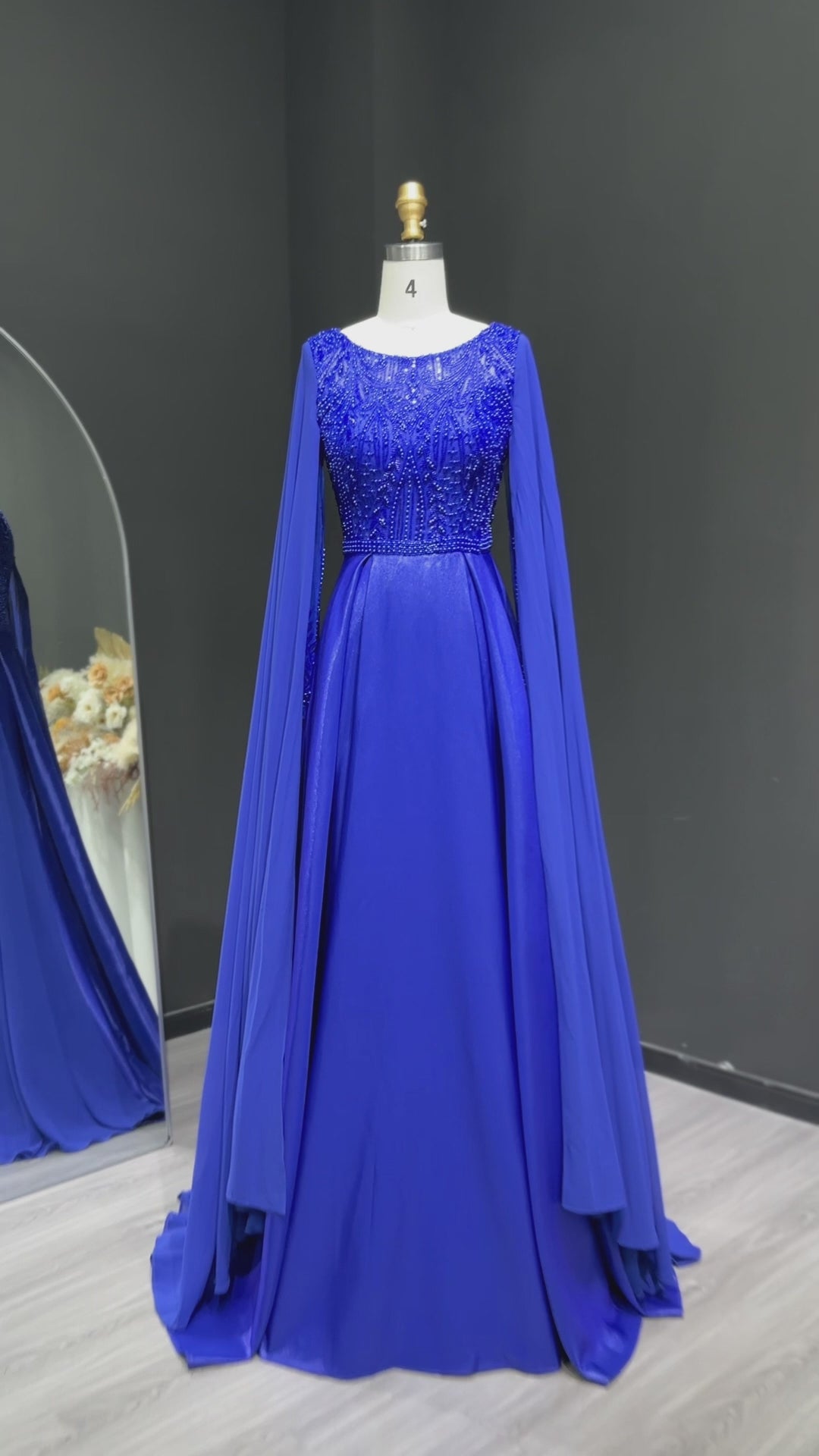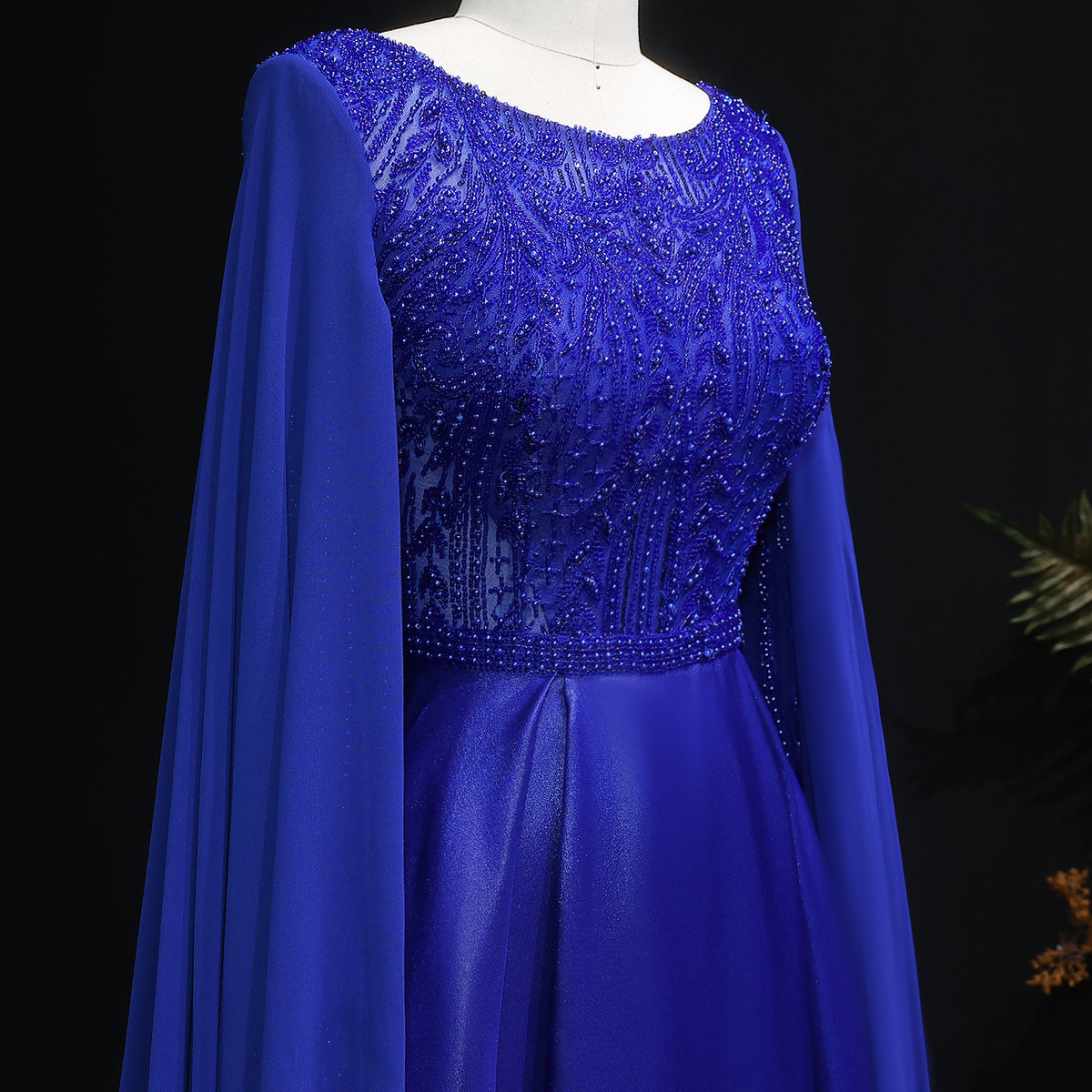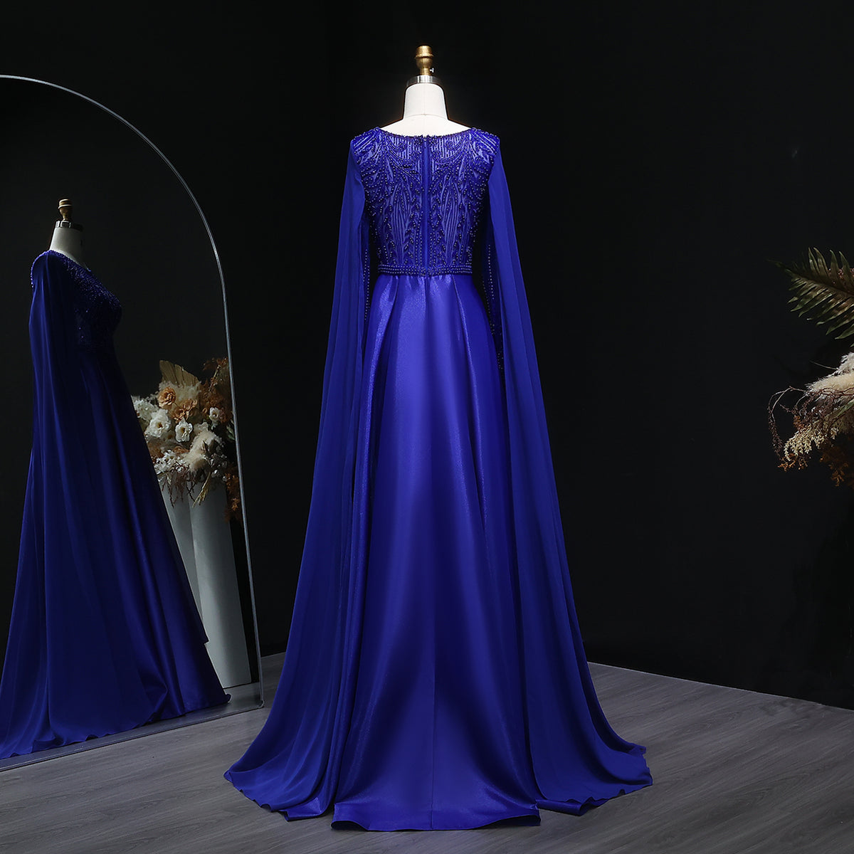 Elevate your evening elegance with this Luxury Royal Blue Beaded Evening Dress featuring graceful cape sleeves. Expertly adorned with intricate beadwork, this dress combines sophisticated design with flowing cape sleeves for a regal silhouette. Perfect for formal occasions, it offers a distinctive look that balances classic glamour with contemporary style.