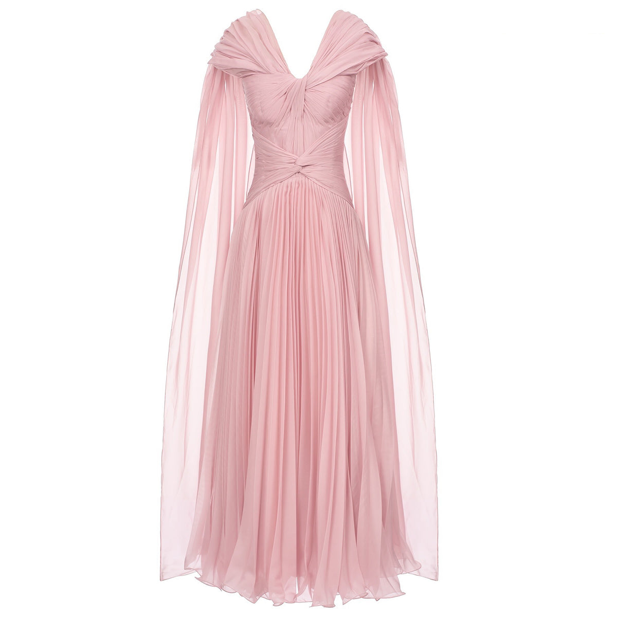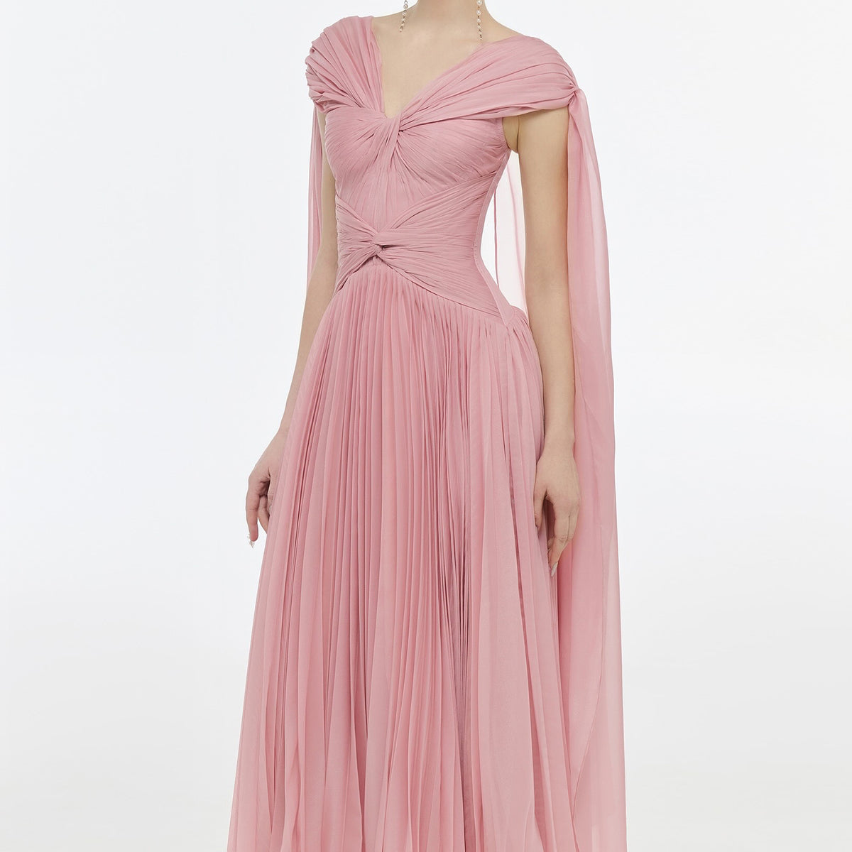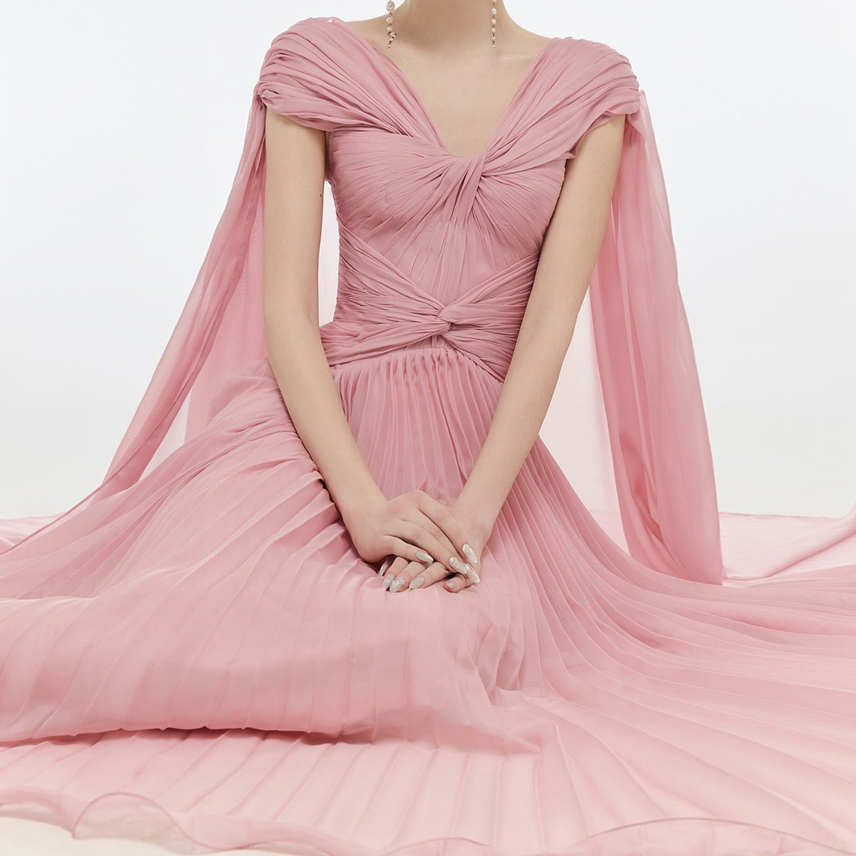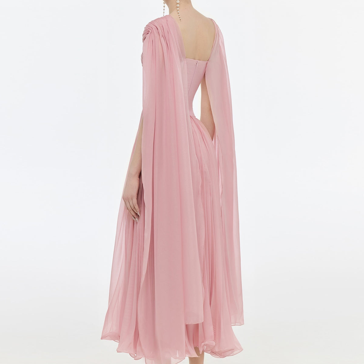 Elevate your evening look with the Romantic Pink Ruffles Evening Dress featuring elegant cape sleeves. Crafted to drape beautifully, this dress combines soft ruffles and a flowing silhouette for a refined and graceful presence. Its delicate pink hue adds a touch of romance, while the cape sleeves offer subtle drama and sophistication, making it an ideal choice for formal occasions and special events. Designed for comfort and style, this dress ensures you stand out with understated elegance.