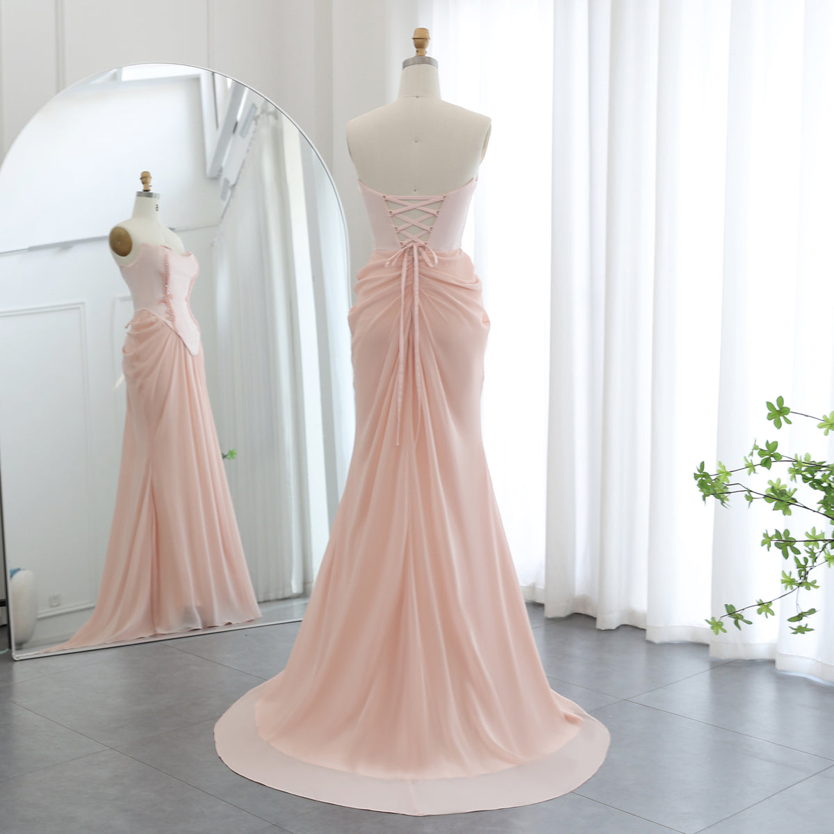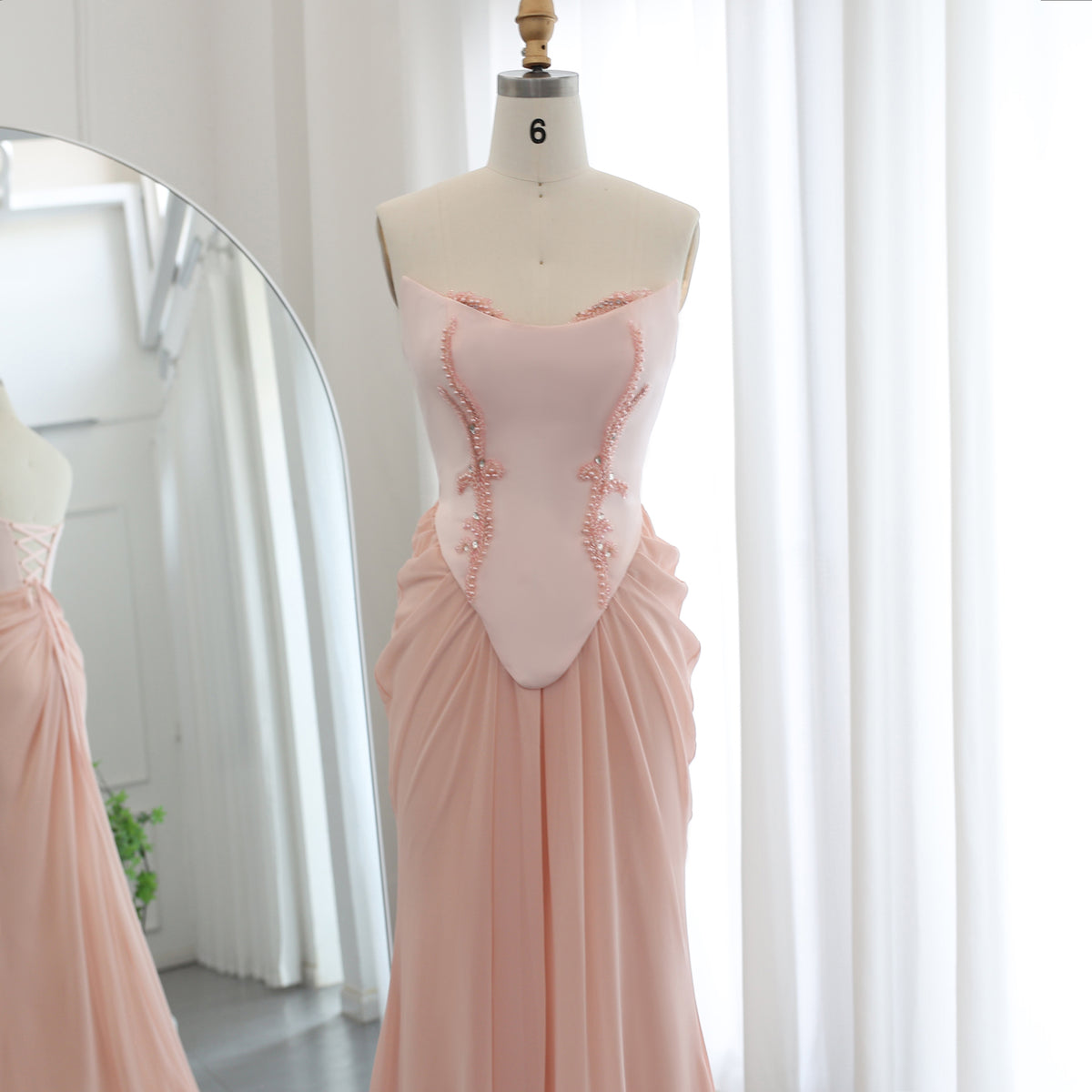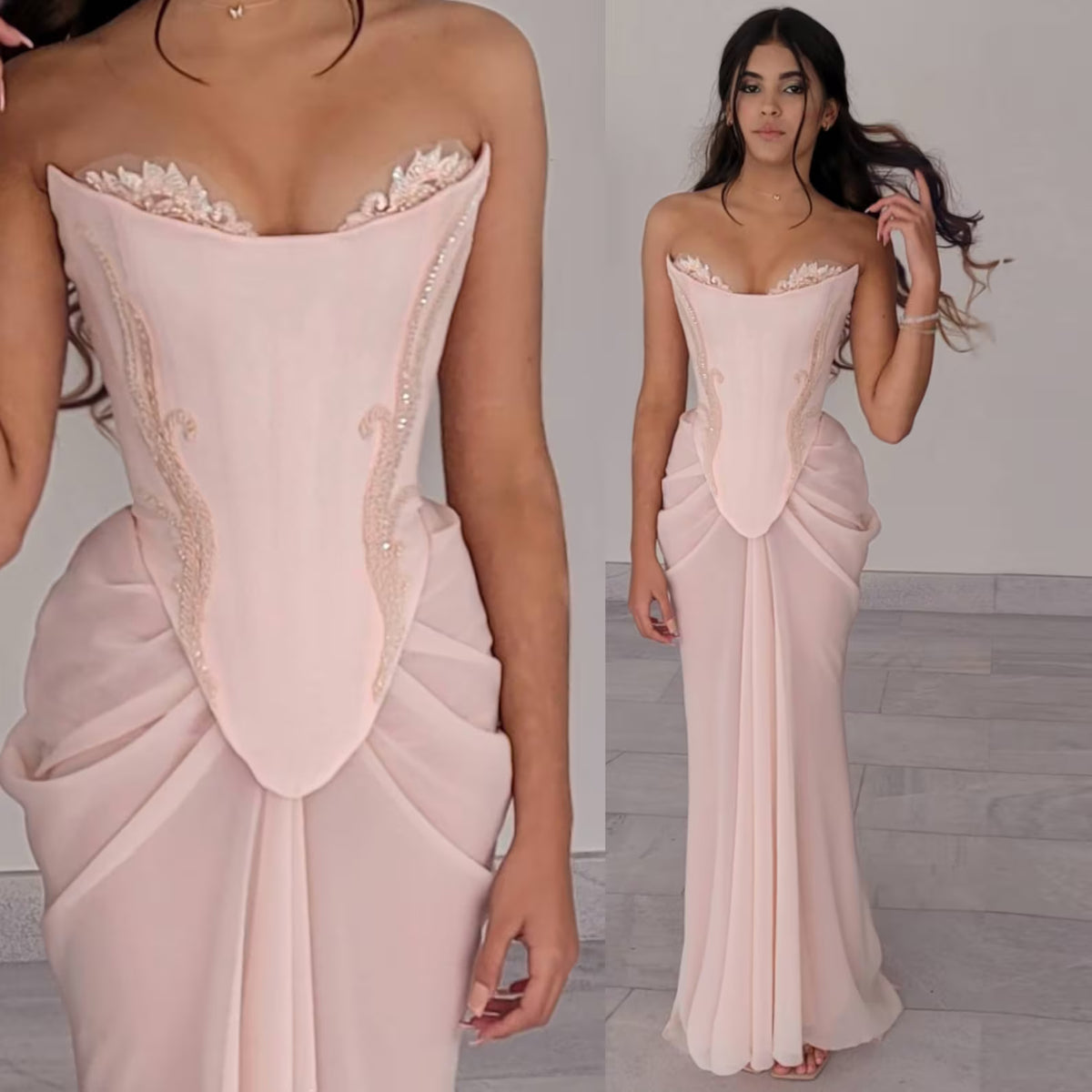 Elevate your evening elegance with this Pink Handmade Draped Strapless Chiffon Mermaid Evening Dress SF306. Expertly crafted with delicate chiffon, its draped design enhances a graceful silhouette, while the strapless neckline highlights your shoulders with refined sophistication. The mermaid cut contours the body for a flattering fit, making it ideal for formal events where timeless style is essential. This dress combines meticulous handmade detailing with luxurious fabric for a distinctive, polished look.