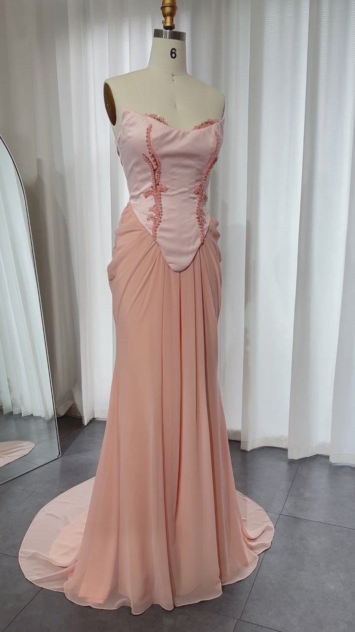 Pink Handmade Draped Strapless Chiffon Mermaid Evening Dress SF306