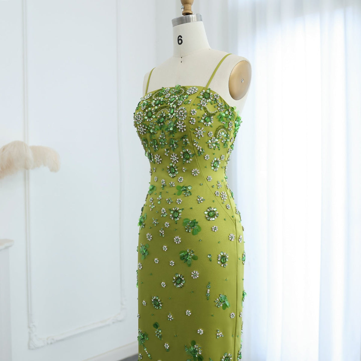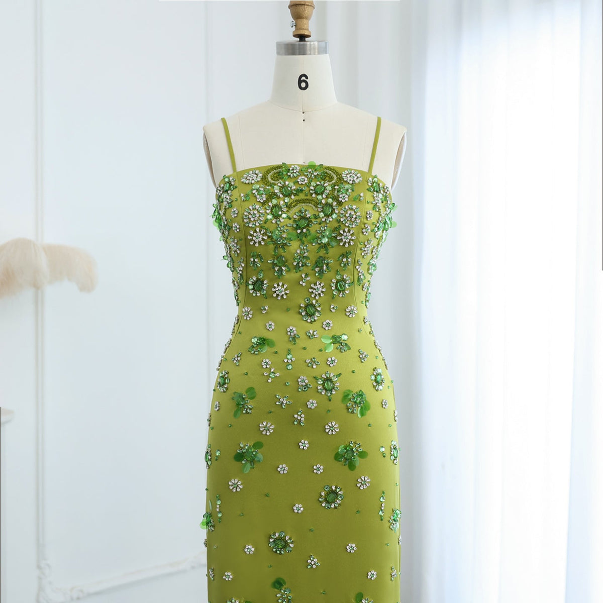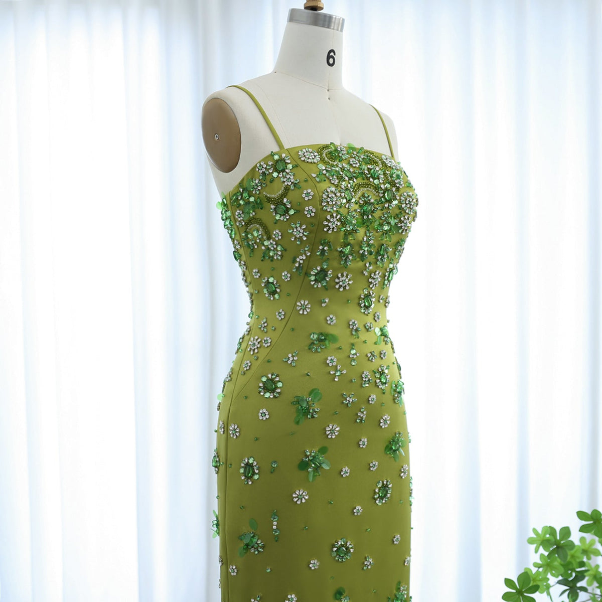 Luxury 3D Floral Beaded Green Spaghetti Straps Midi Evening Dress SS233