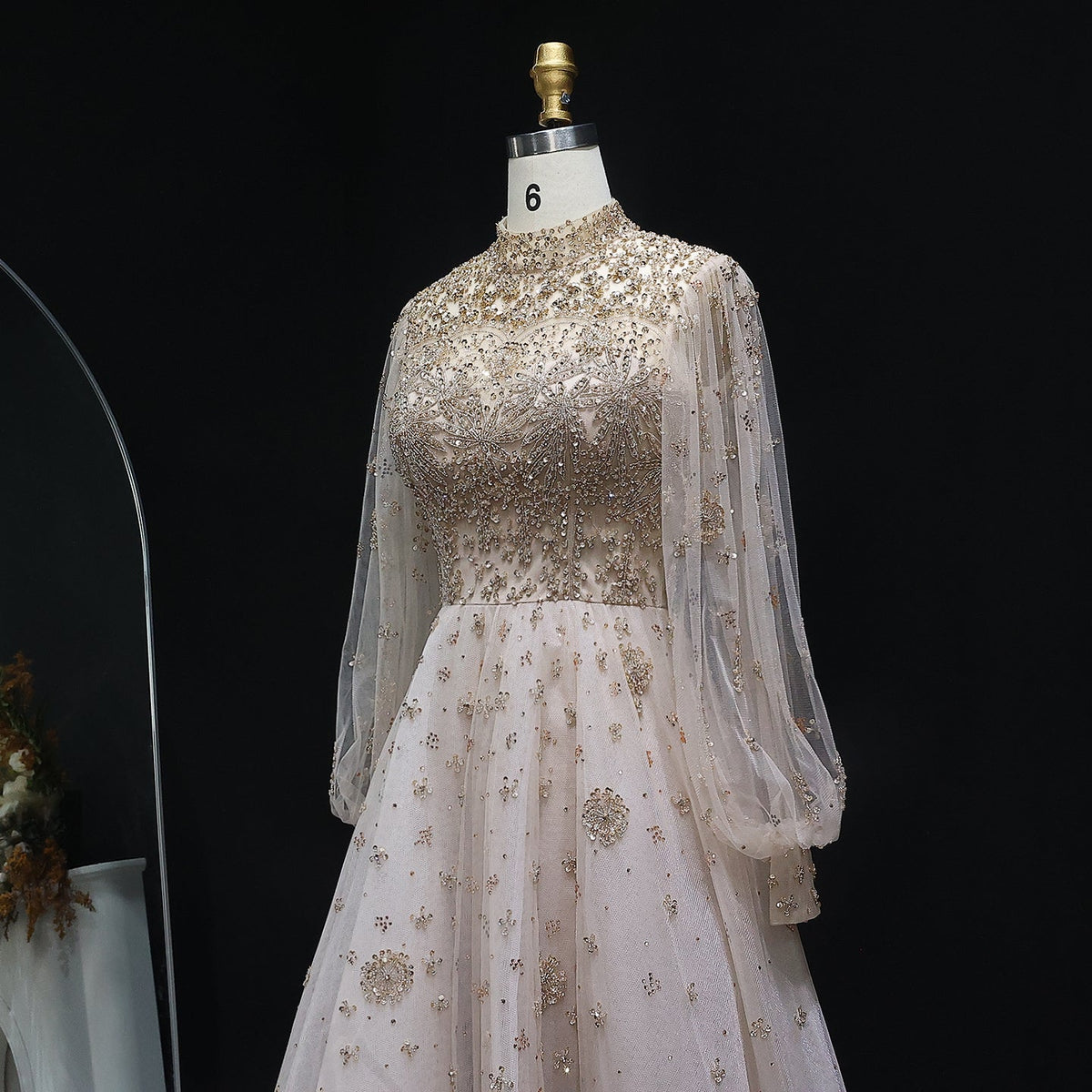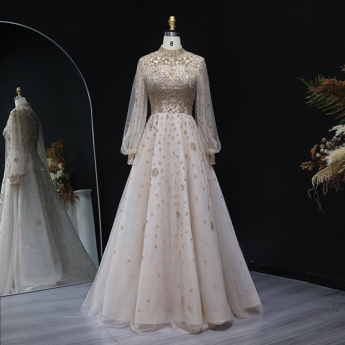 Discover the epitome of luxury with our Elegant Champagne Evening Dress. Exquisite Arabic design meets sophistication in this stunning long-sleeved dress, perfect for weddings and formal events. Elevate your style with this opulent piece that exudes elegance and grace.