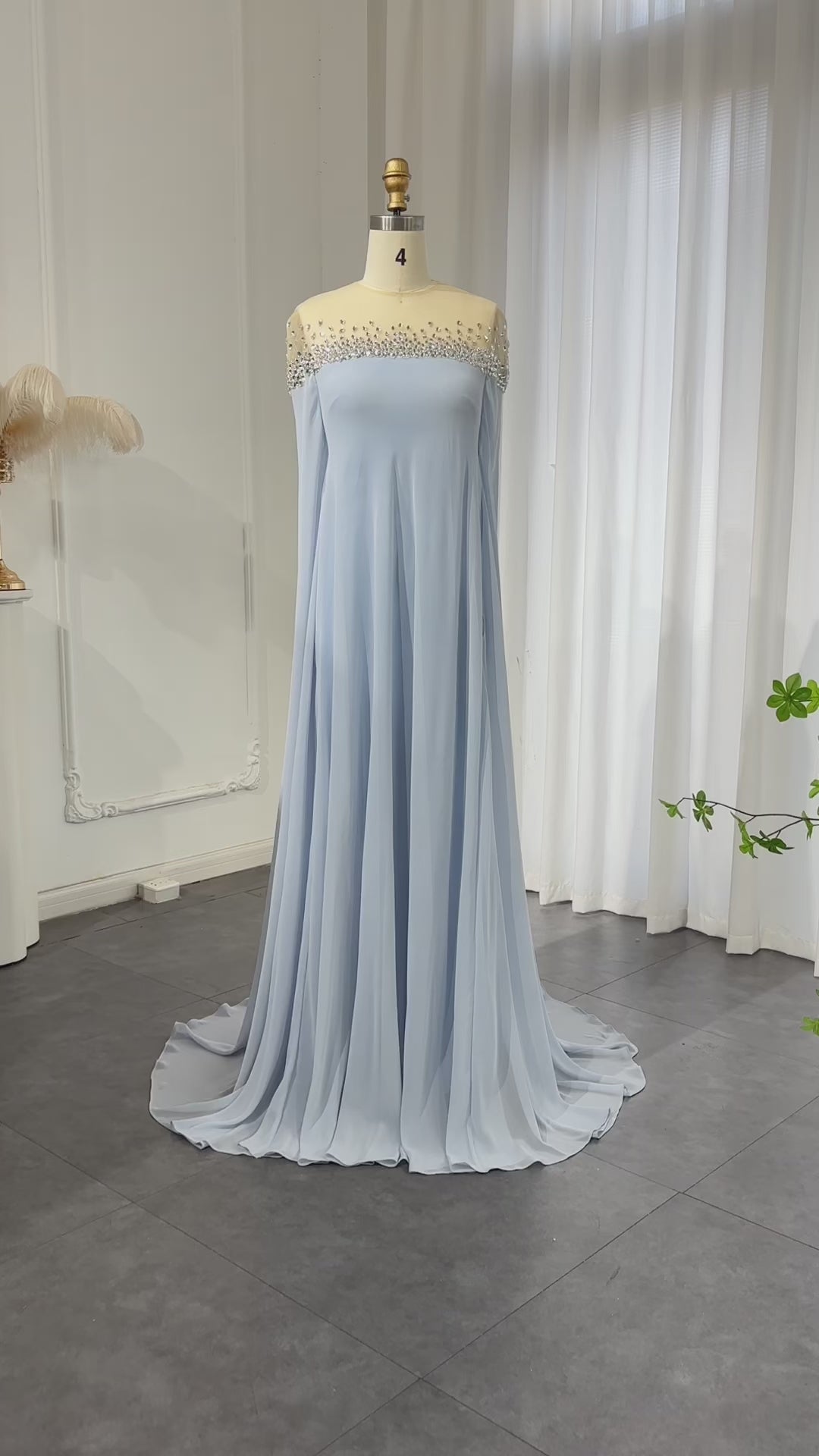 Luxury Crystal Baby Blue Evening Dress with Cape Sleeves SS308