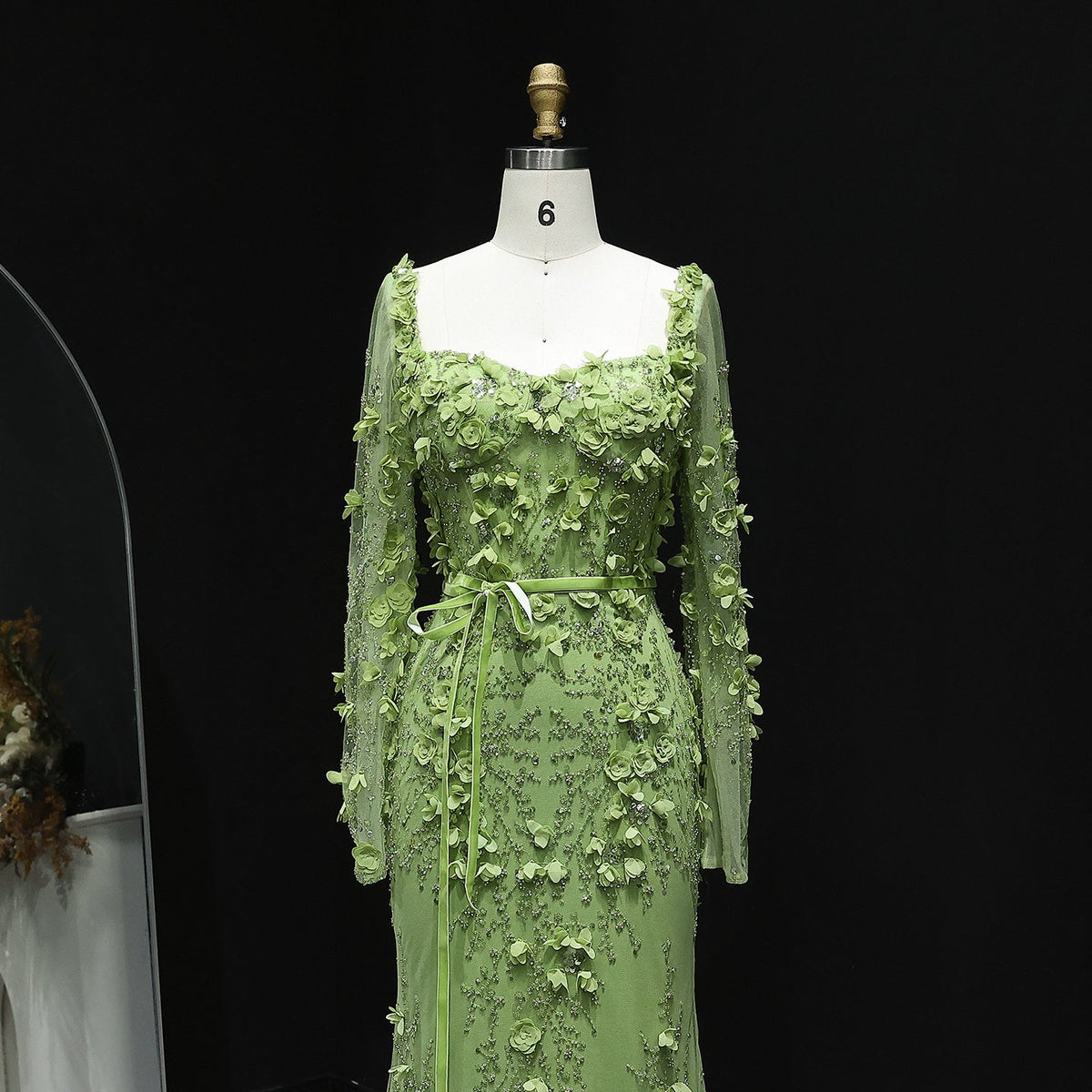 Luxury Green 3D Floral Evening Dress with Long Sleeves SS355