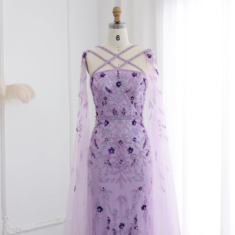 شارون سعيد سيج أخضر حورية البحر فستان سهرة فاخر في دبي بأكمام كيب أنيق للنساء أرجواني لحفلات الزفاف الرسمية SS205