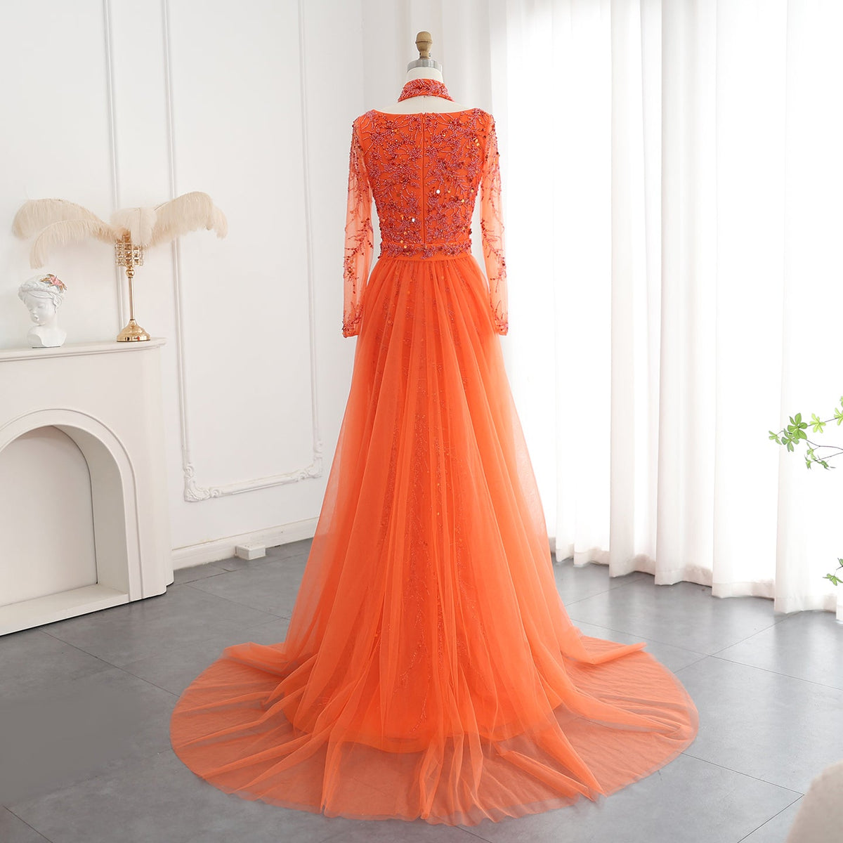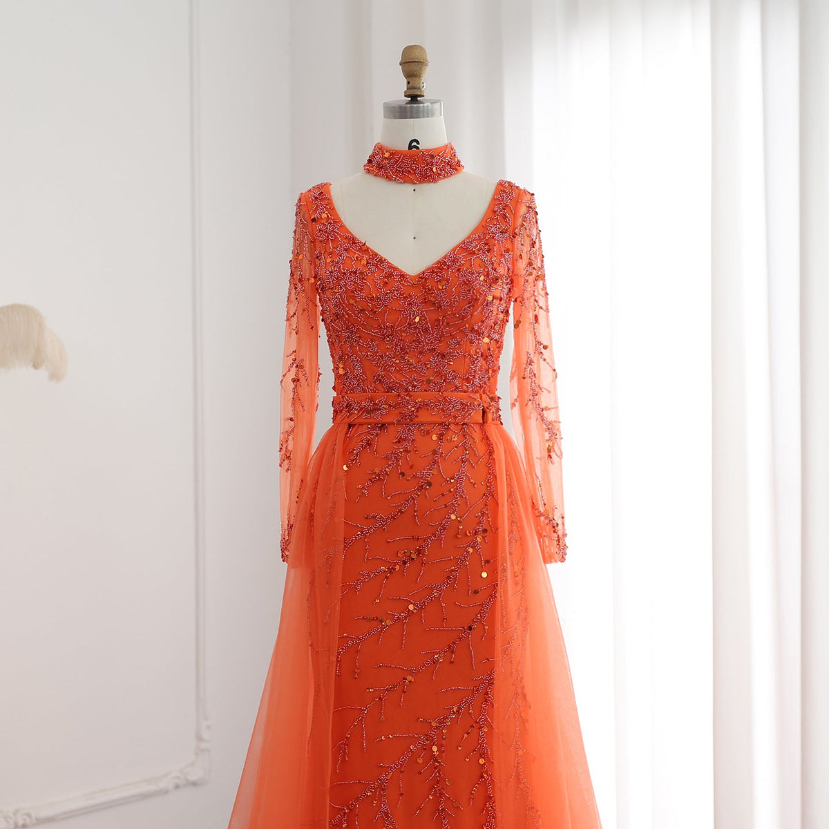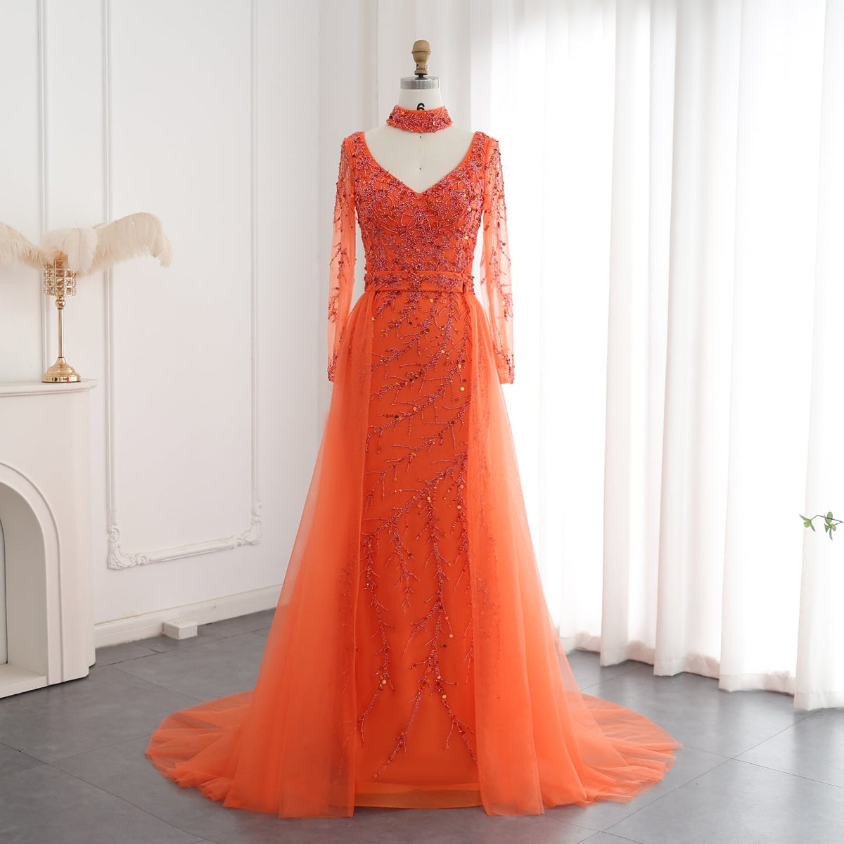 Luxury Beaded Orange Long Sleeves Evening Dress with Overskirt SS222