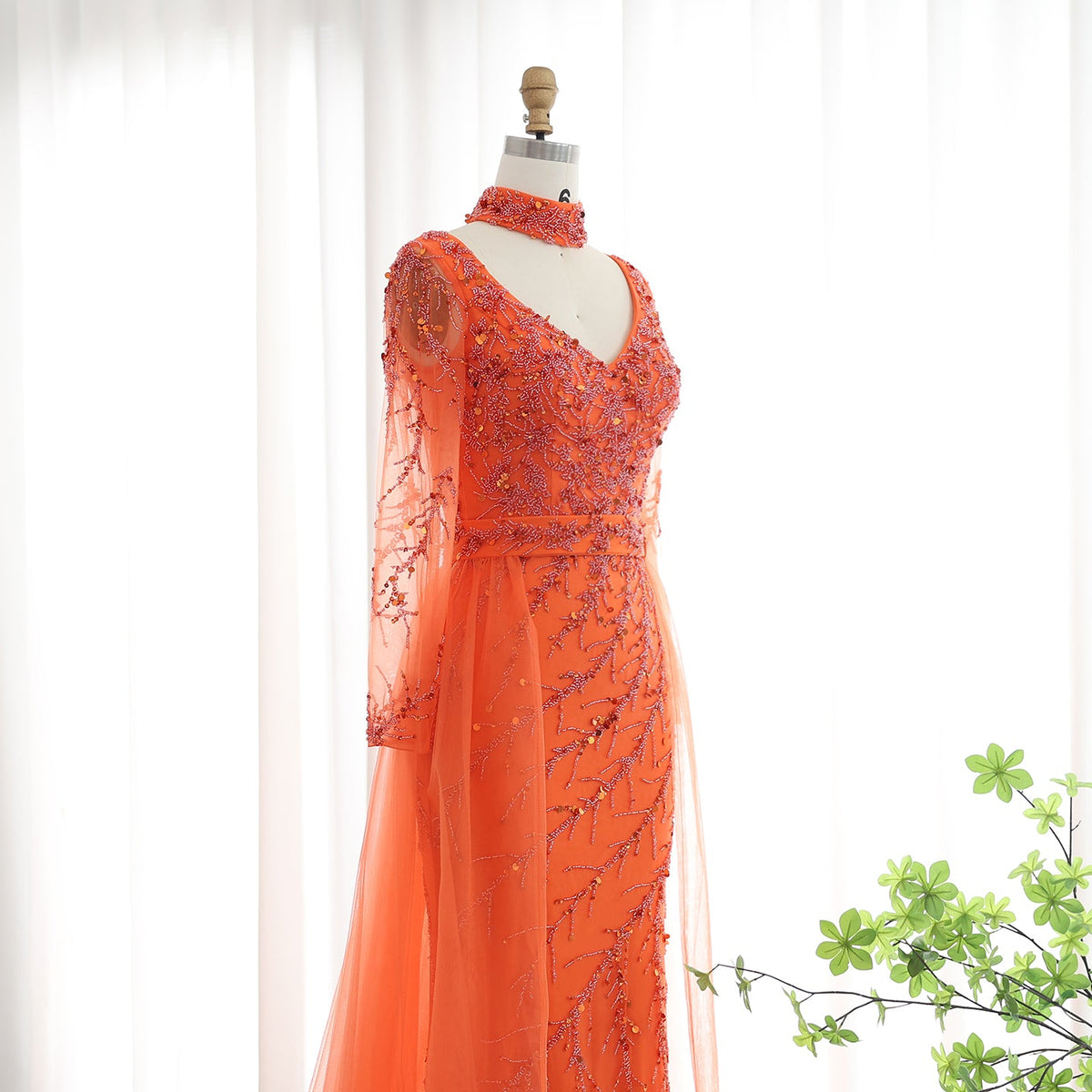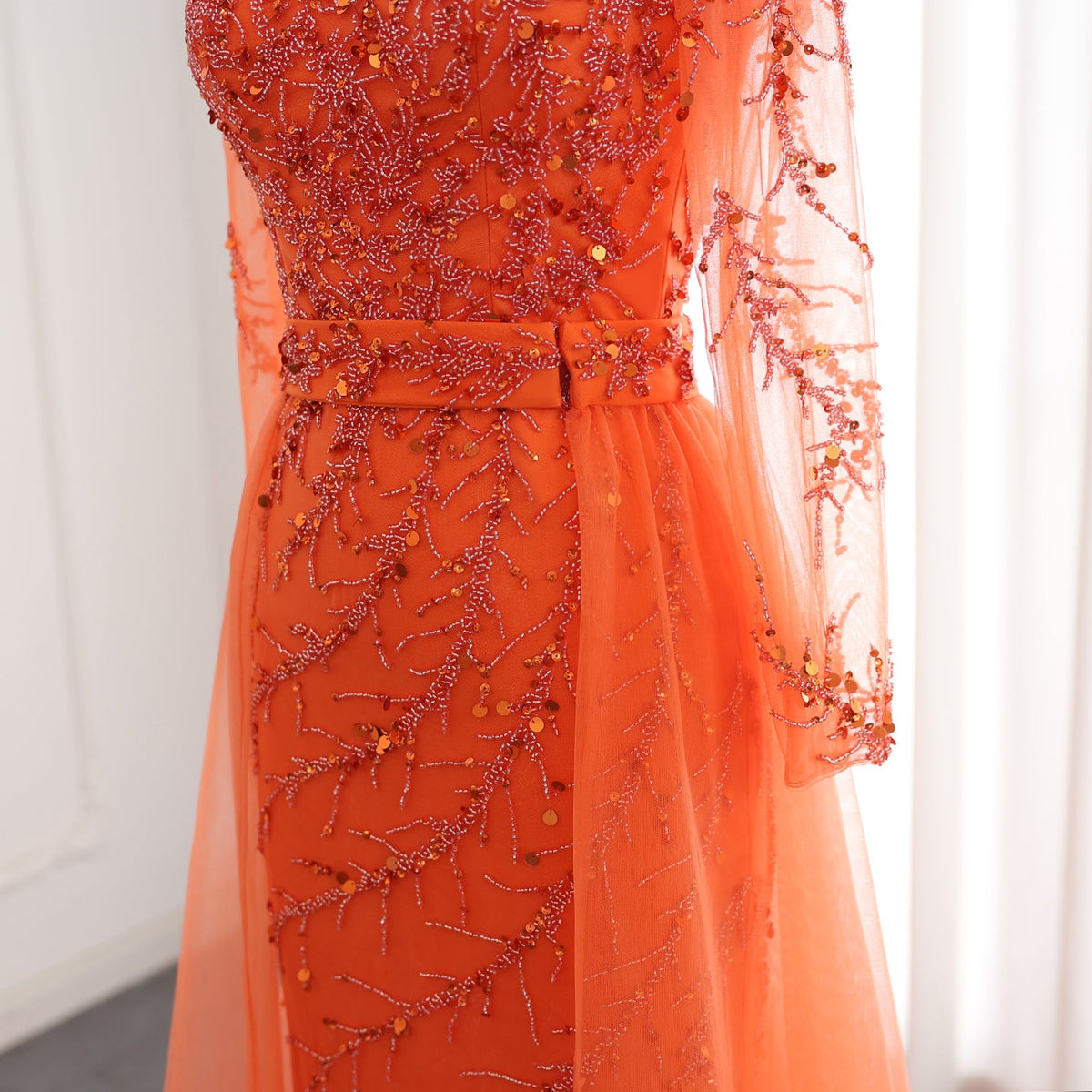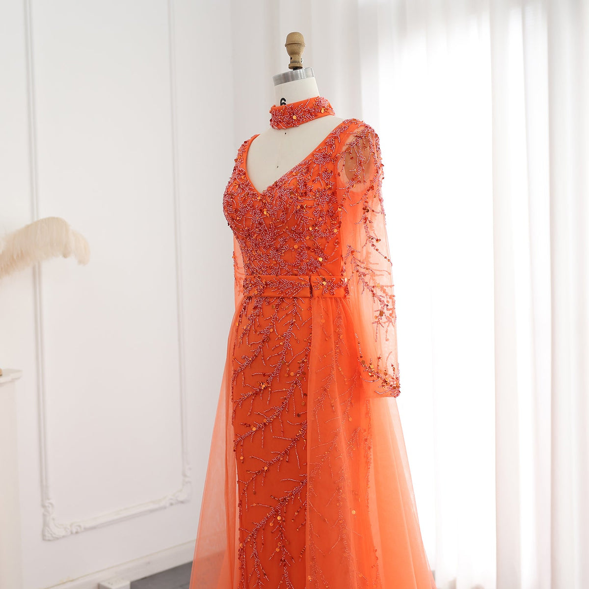Luxury Beaded Orange Long Sleeves Evening Dress with Overskirt SS222