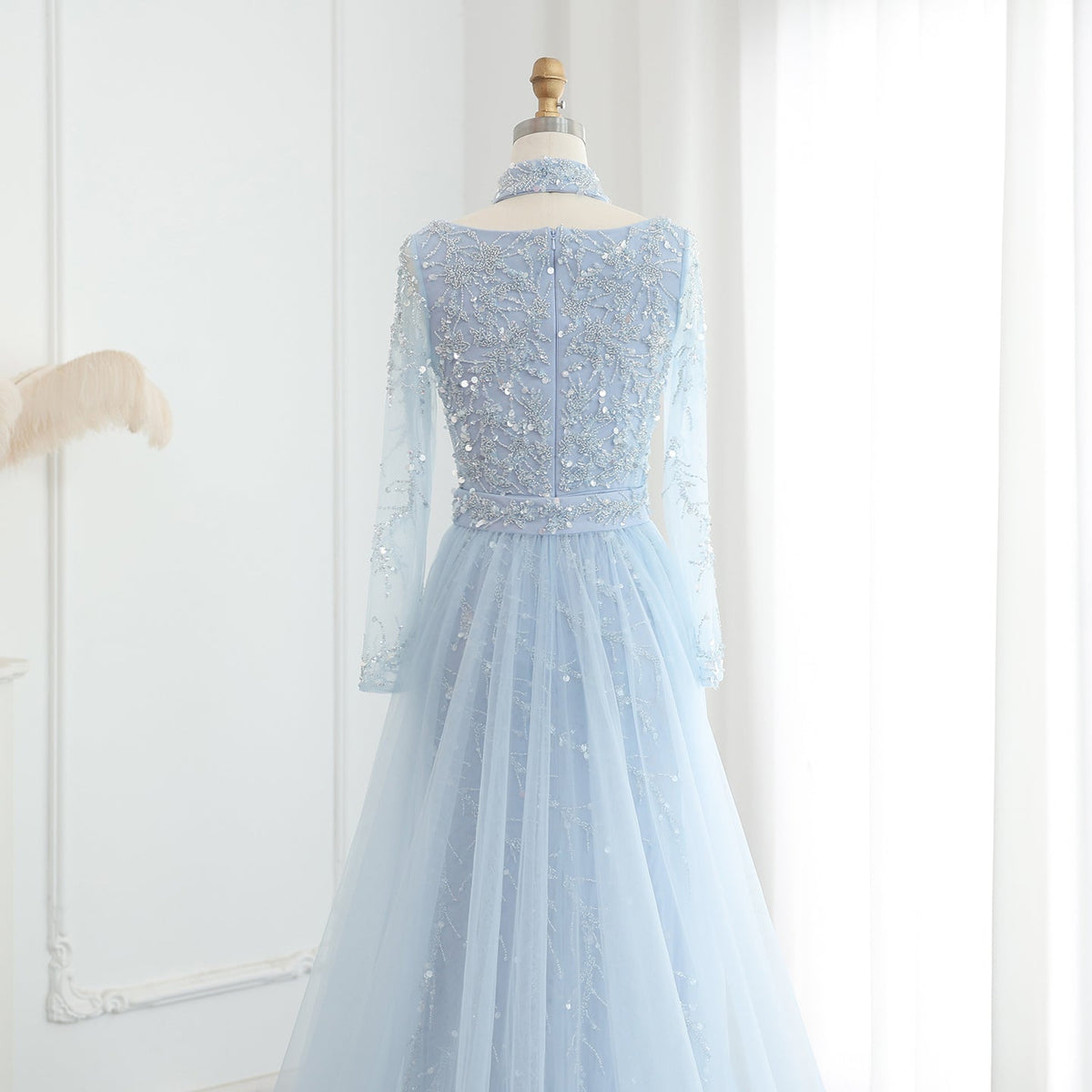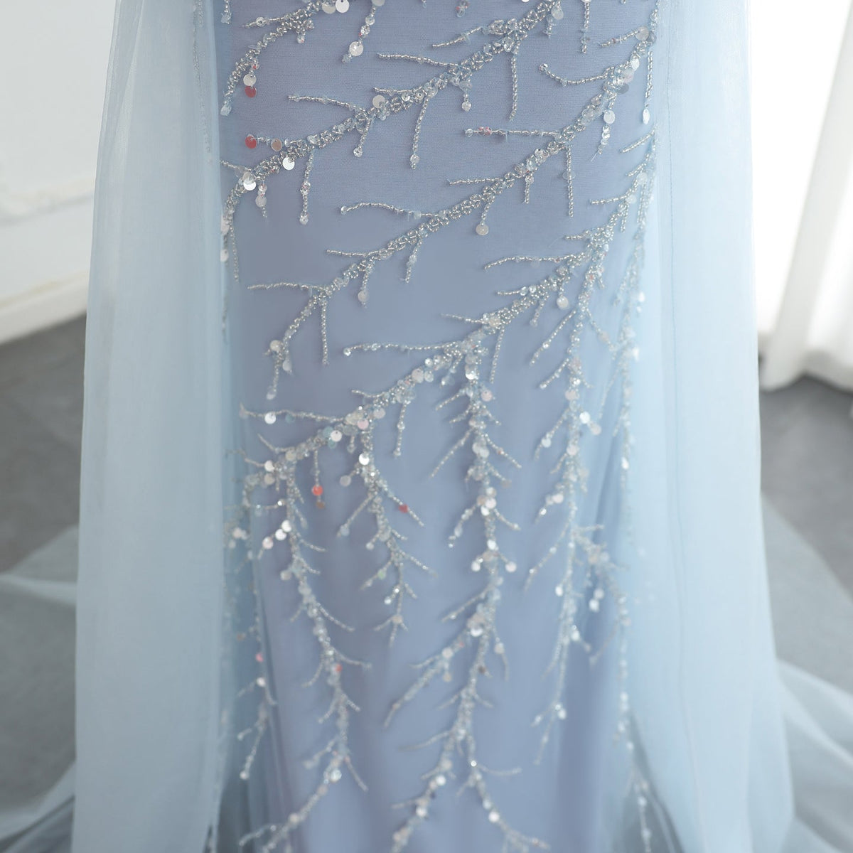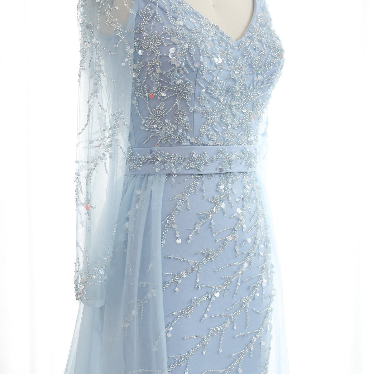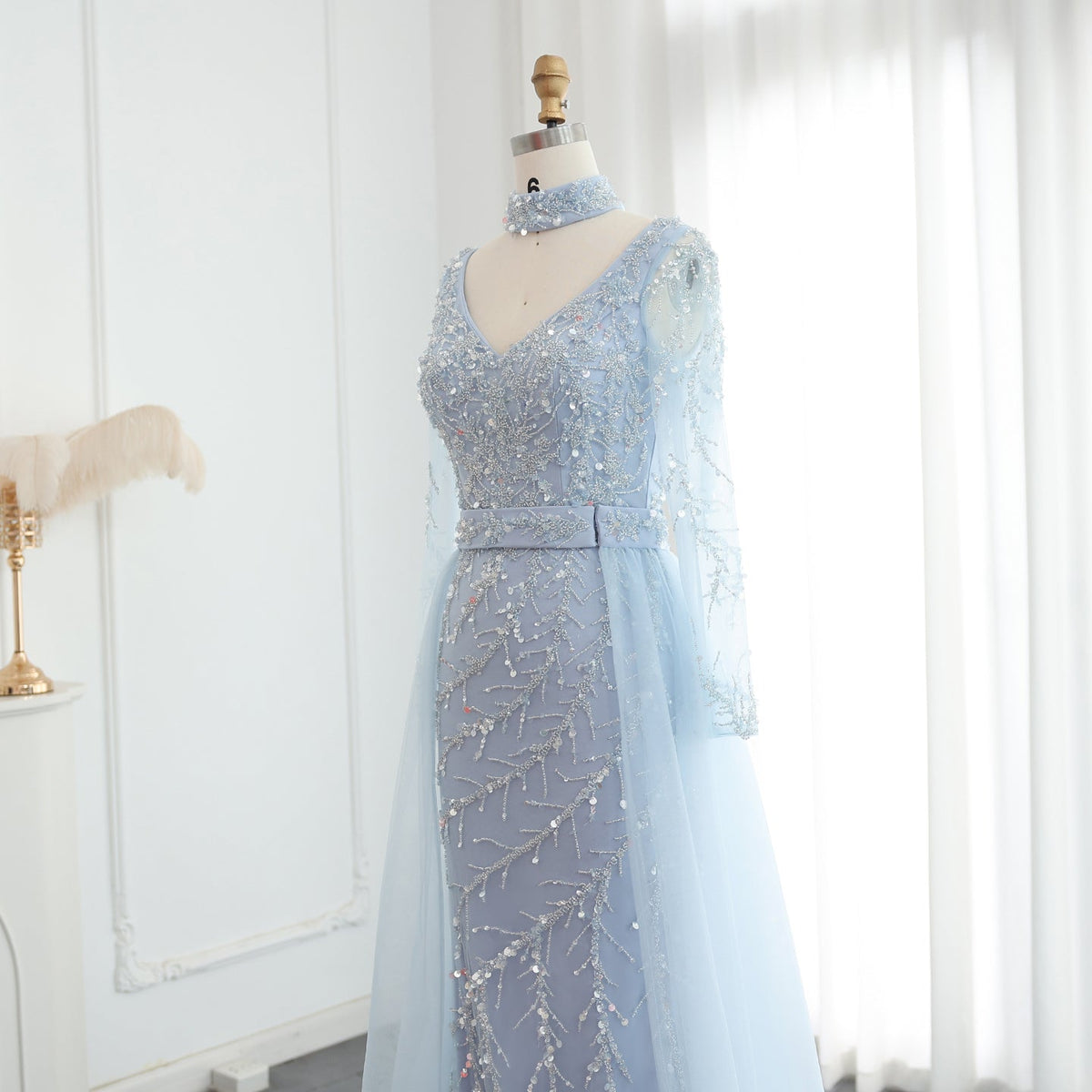 Elevate your evening look with the Sharon Said Luxury Beaded Mermaid Evening Dress. This stunning dress features intricate beadwork and a mermaid silhouette, with a delicate light blue overskirt and long sleeves for added elegance. Perfect for weddings and special occasions, this dress exudes luxury and sophistication.