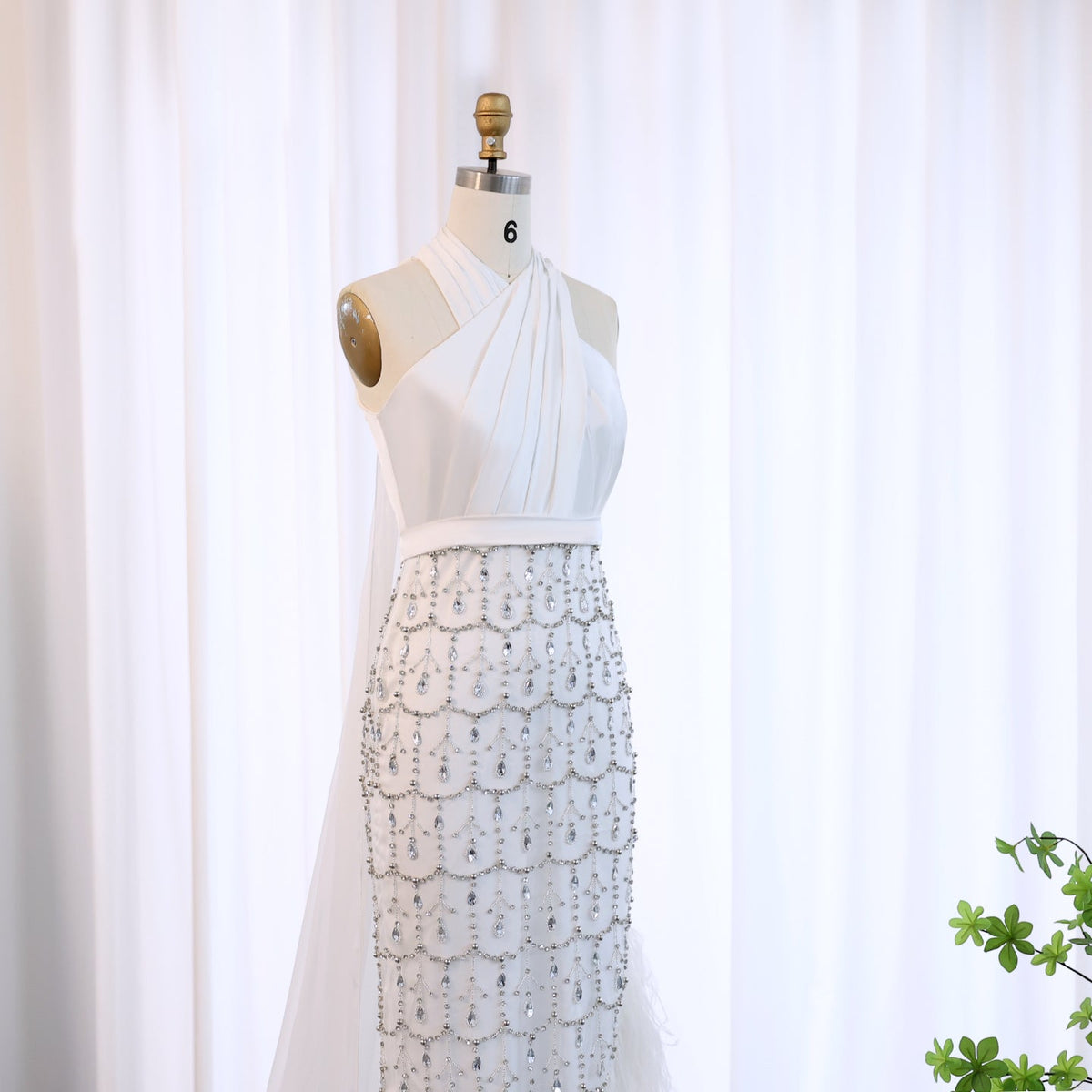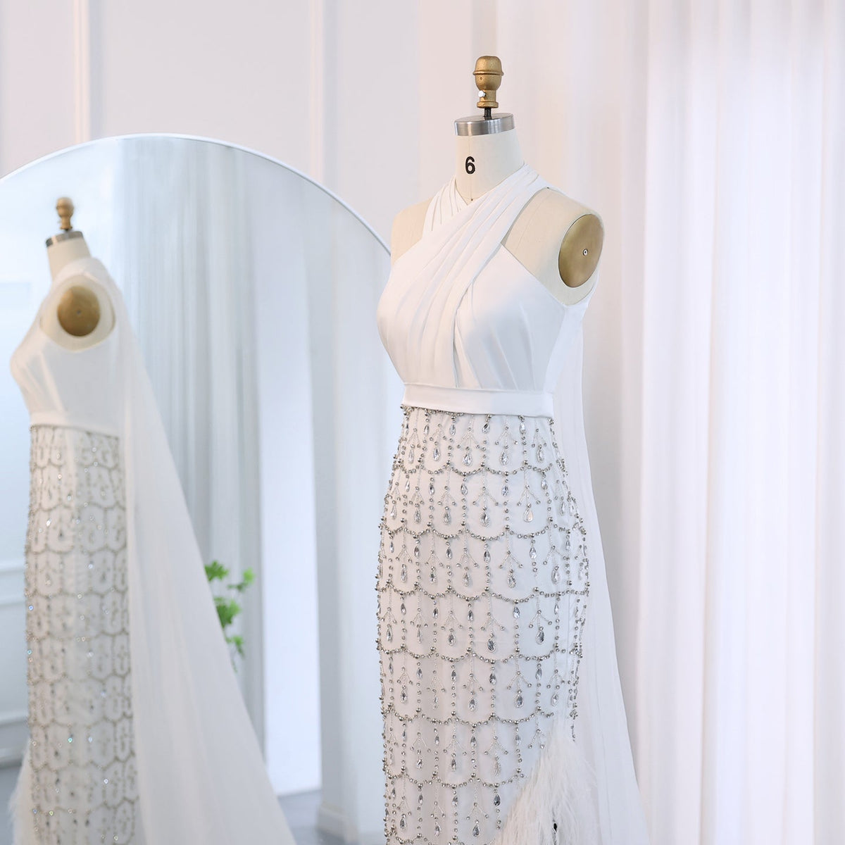 شارون سعيد فاخر دبي ريشة بيضاء حورية البحر فستان سهرة مع كيب الرسن 2024 المرأة العربية الزفاف حفلة موسيقية رداء حفلات SS350