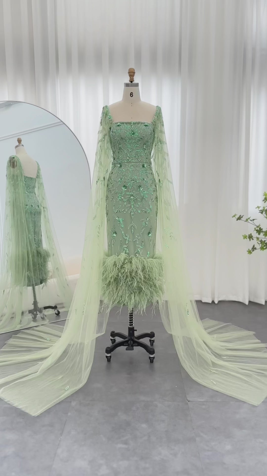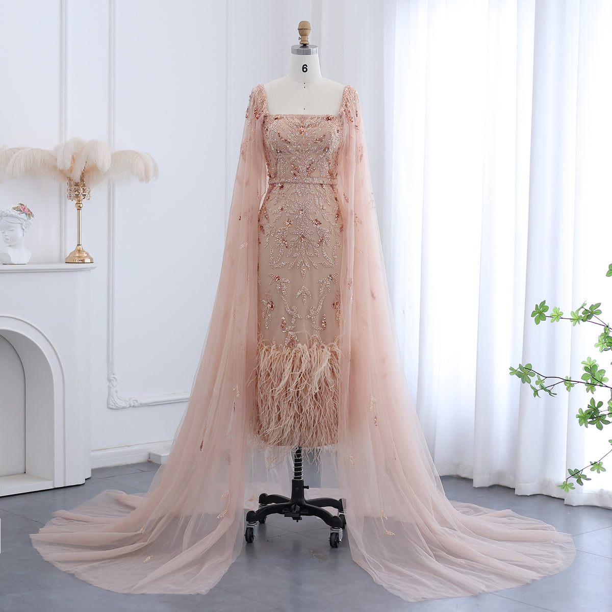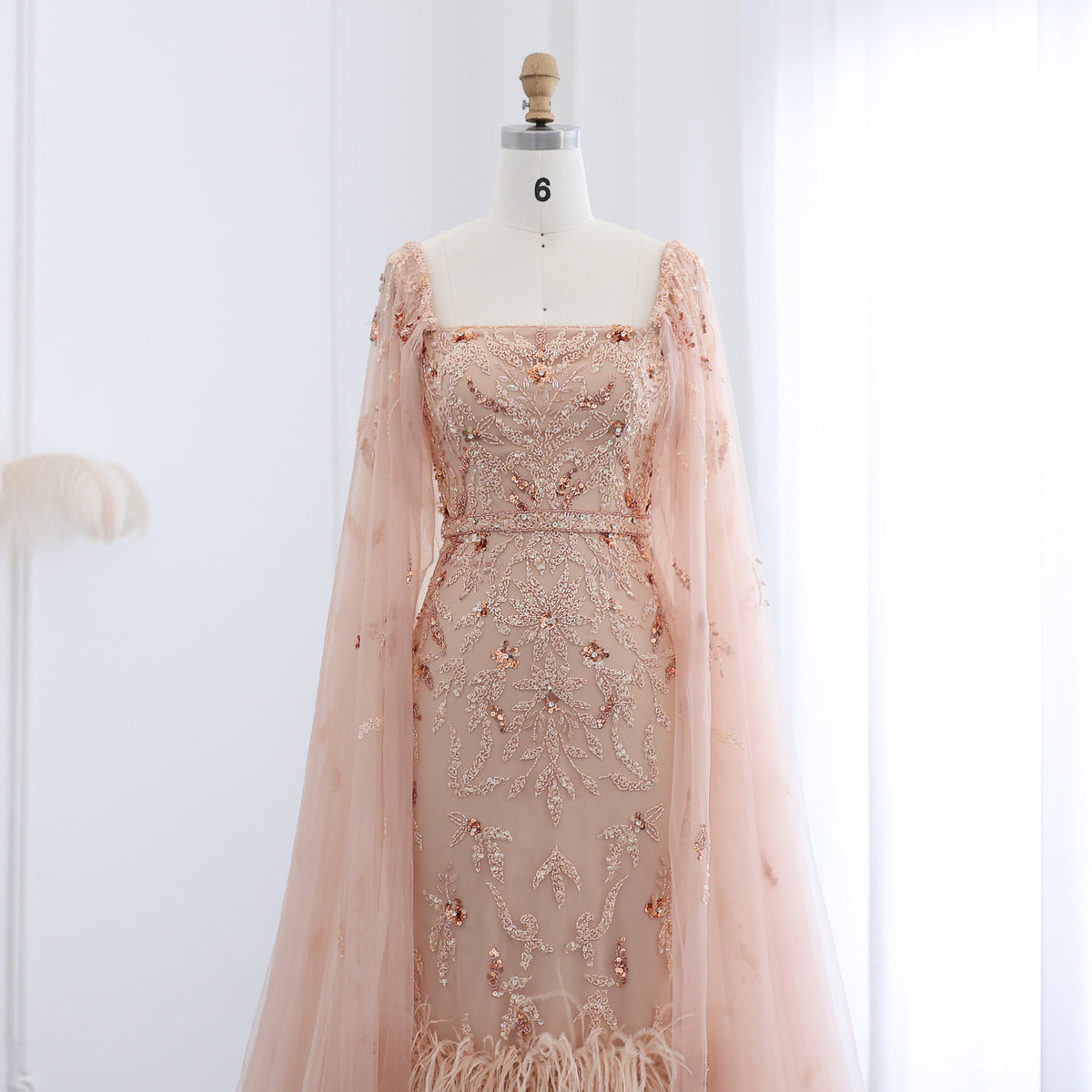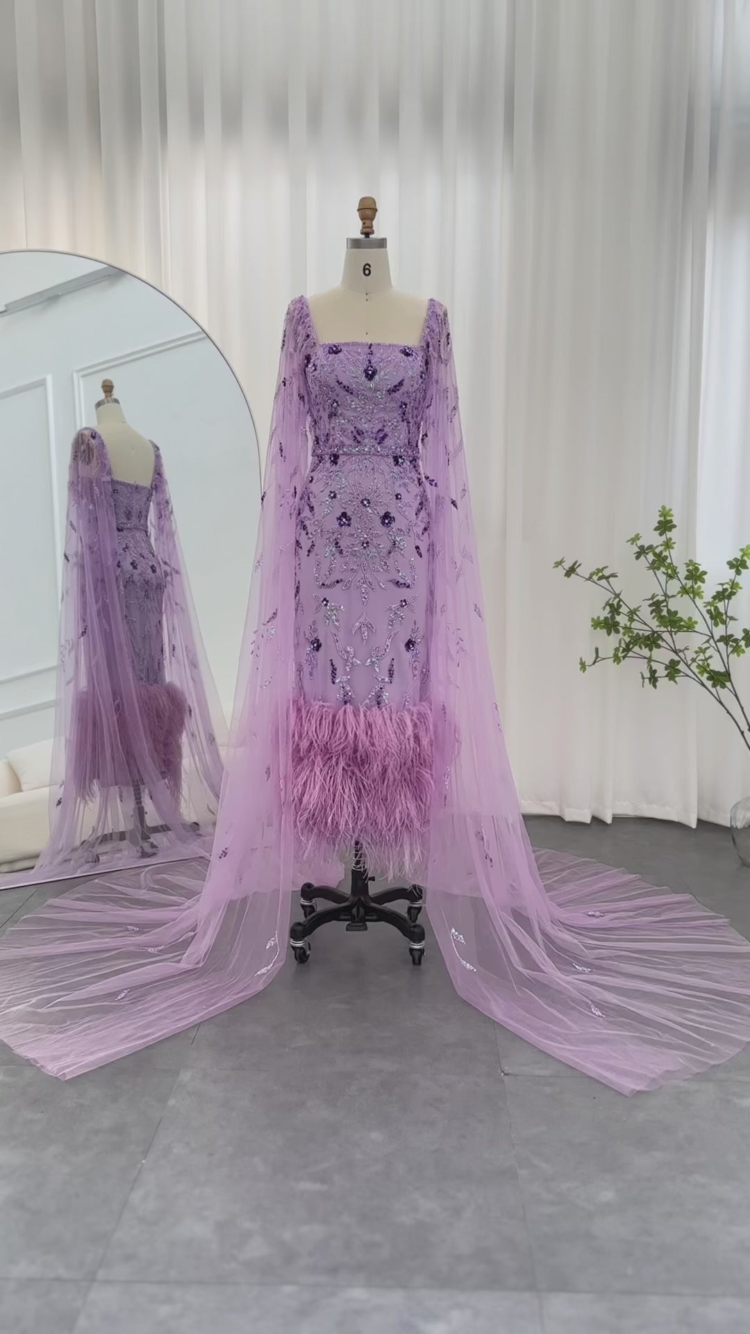 ارتقي بأناقتك مع فستان السهرة الليلكي الفاخر من شارون سعيد دبي. مصمم بلمسات ريش مذهلة وأكمام كيب أنيقة، هذا الفستان متوسط ​​الطول بطول الكاحل ينضح بالفخامة والرقي. مثالي لحفلات الزفاف أو المناسبات الرسمية، هذا الفستان سيجعلك تشعرين وكأنك أميرة عربية ساحرة.