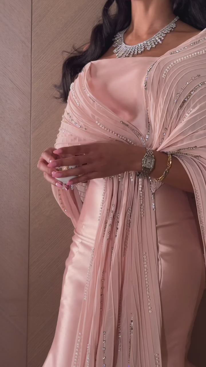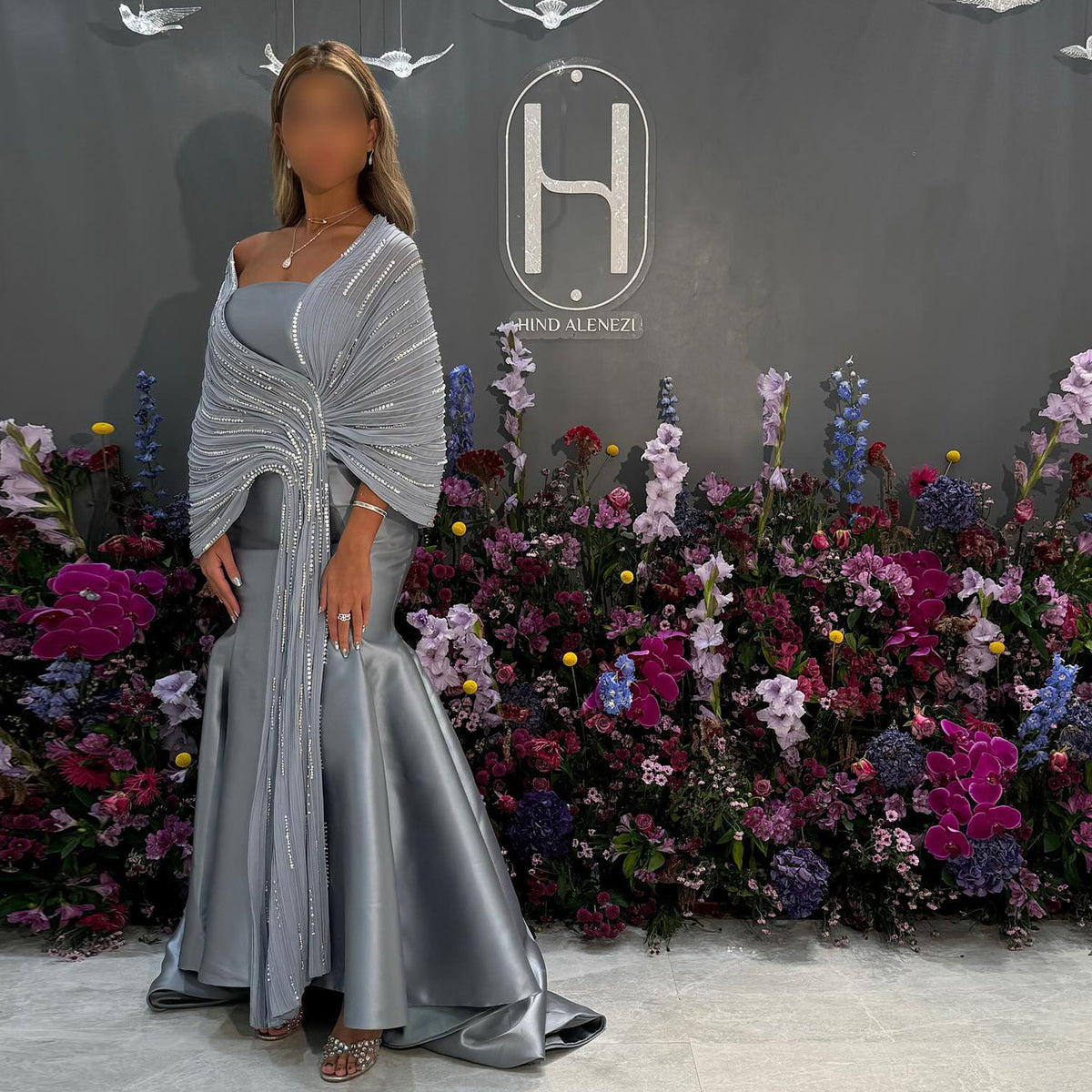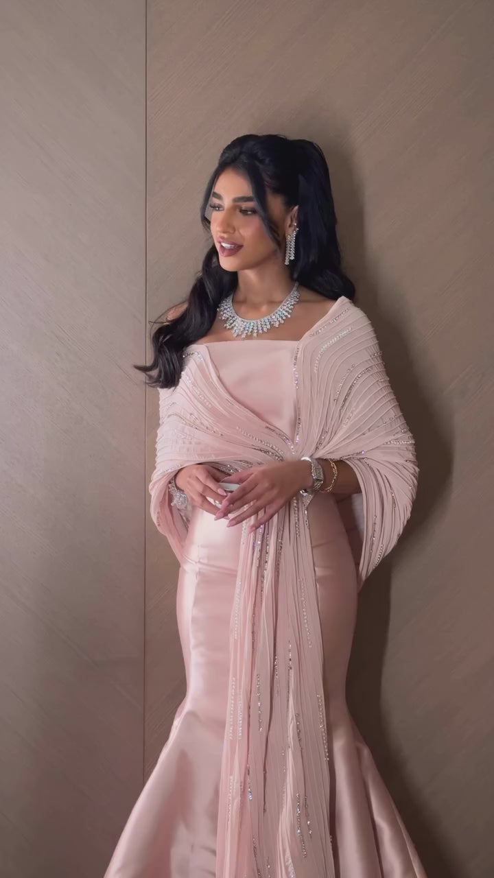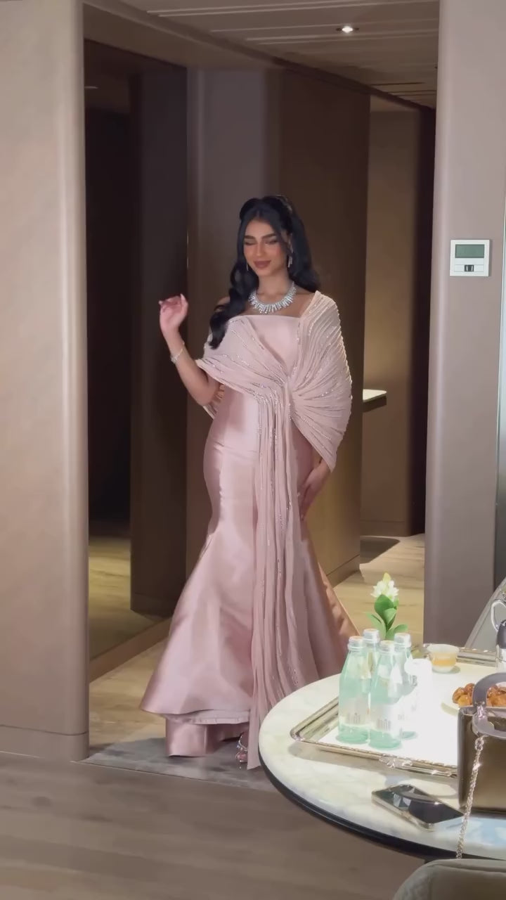 Elevate your formal occasions with this luxury gray off-shoulder evening gown, expertly tailored to enhance elegance and poise. The sophisticated silhouette gracefully contours the figure, while the included sparkly shawl adds a refined touch of shimmer, perfect for evening events. Crafted with attention to detail, this gown combines timeless style with luxurious comfort, making it an impeccable choice for those seeking understated glamour.