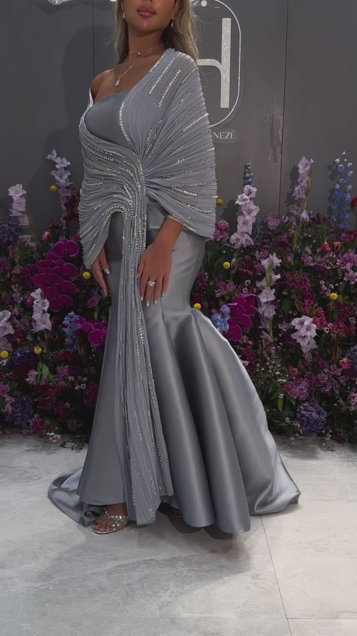 Luxury Gray Off Shoulder Evening Gown with Sparkly Shawl SF396
