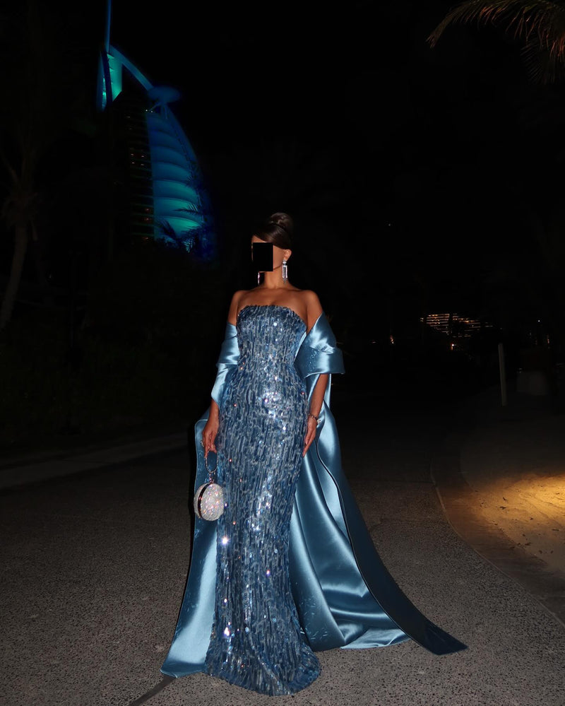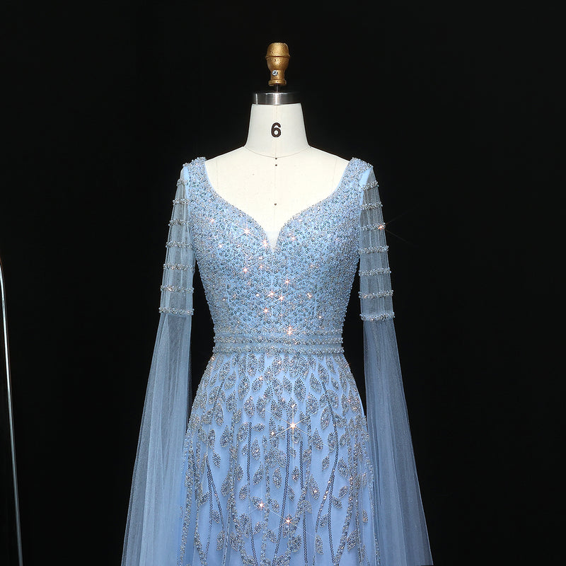 Luxury Turquoise Blue Sequined Evening Dress with Cape SF165