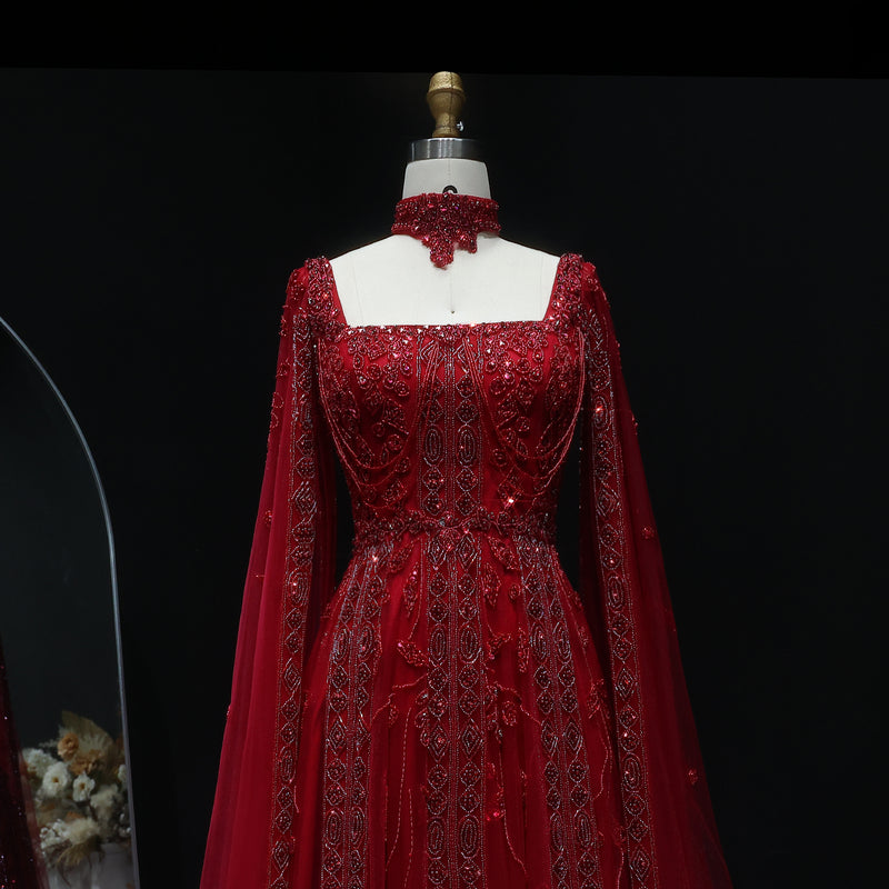 Luxury Beaded Burgundy Evening Dress with Cape Sleeve SS543