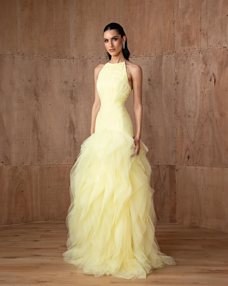 Elegant Halter Yellow Ruffles Mermaid Evening Dress SF377