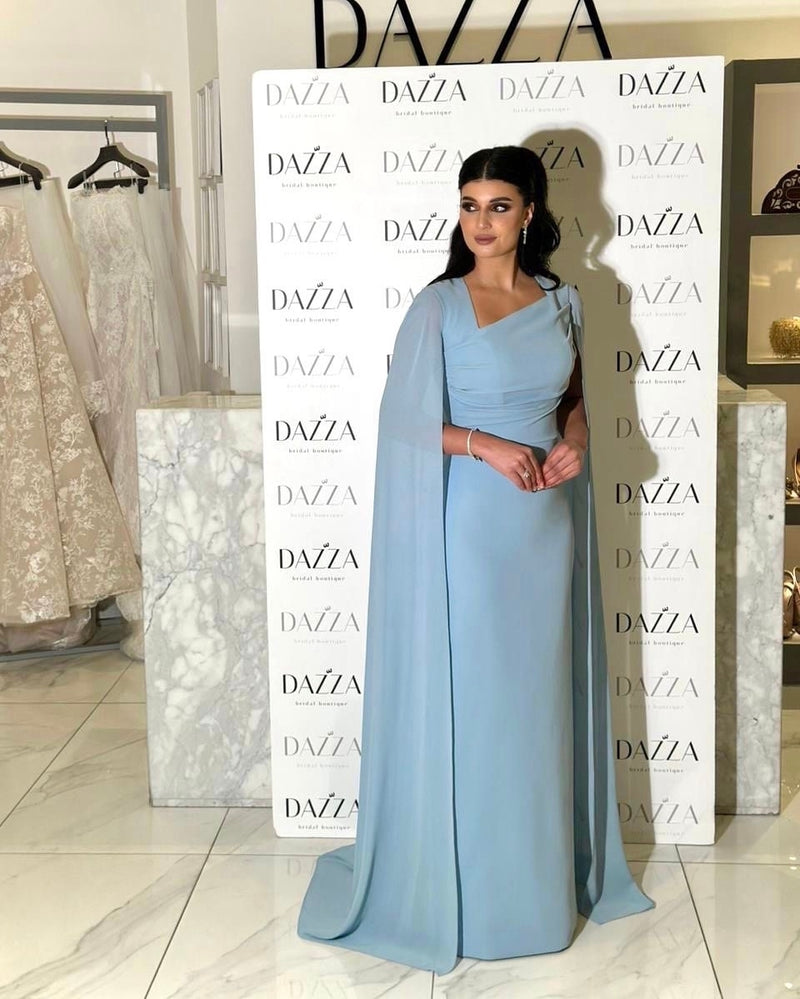 Elegant Blue Chiffon Evening Dress with Cape Sleeve SF037