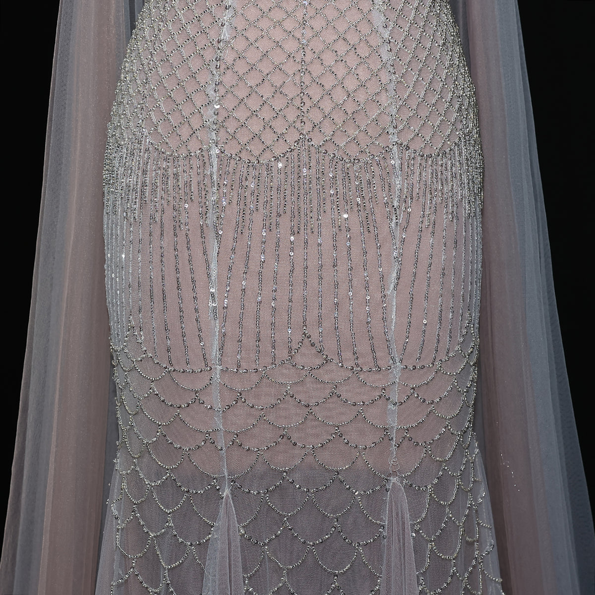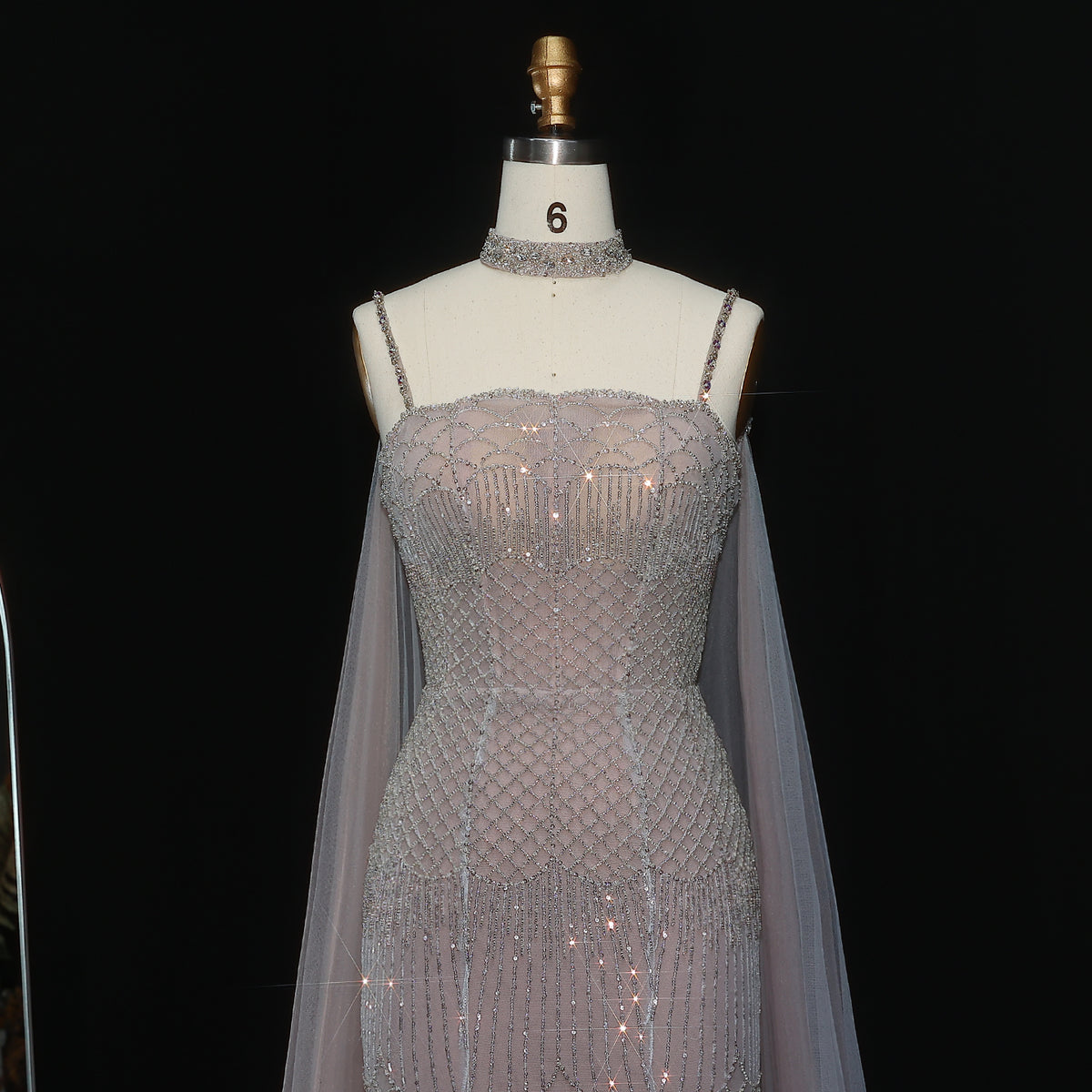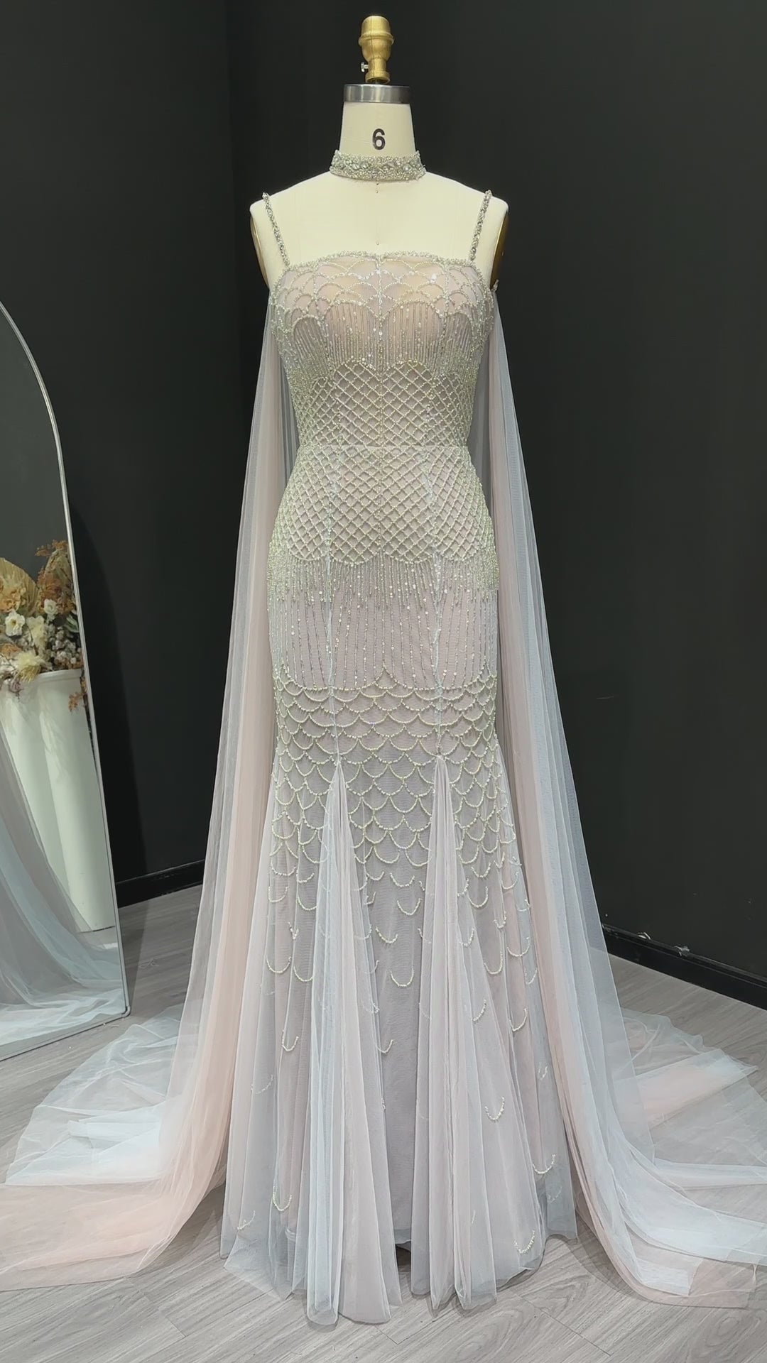 This gorgeous mermaid evening dress in charming pink features intricate beading and a stylish cape for a stunning look. The dress is perfect for formal events and will make you stand out with its elegant design. The cape adds a touch of sophistication and adds an extra layer of glamour to the dress.