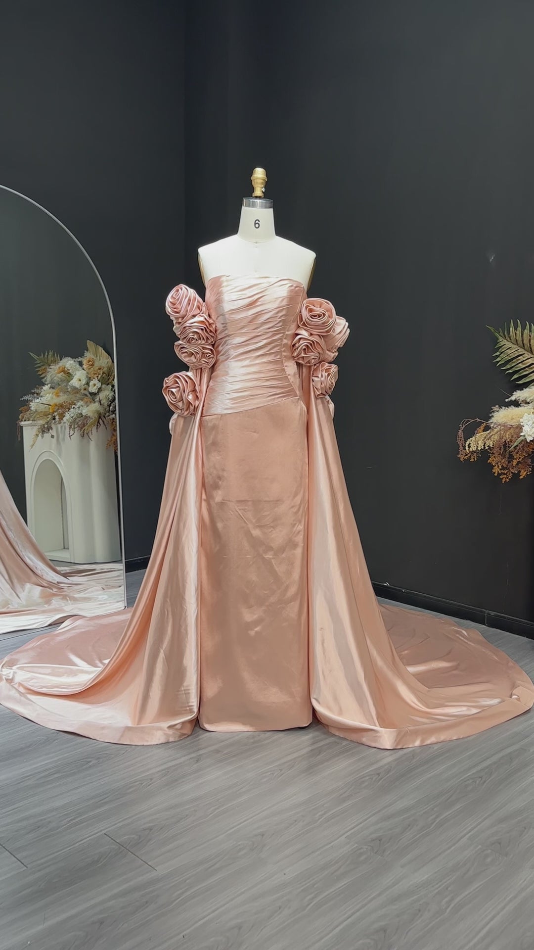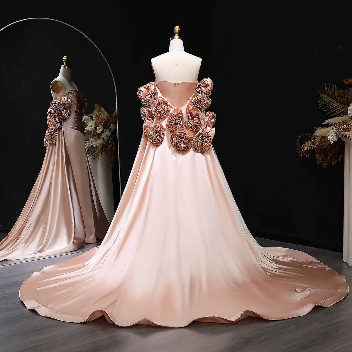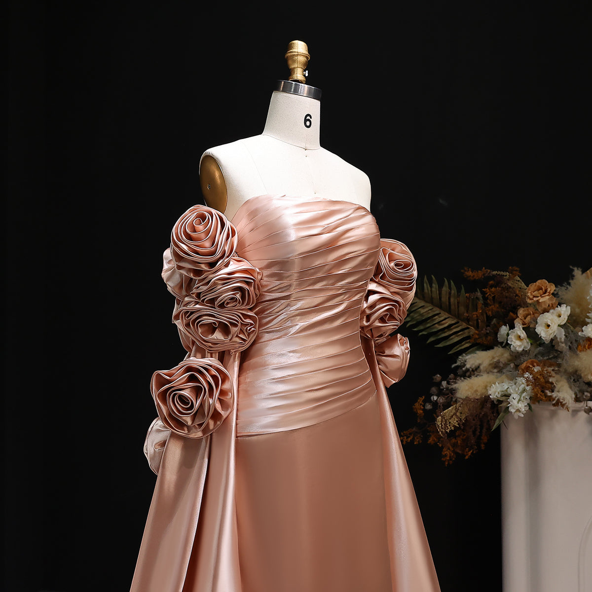 Elevate your evening look with our 3D floral rose gold dress. The intricate floral details add depth and dimension, while the overskirt adds a touch of drama. Made with high-quality materials, this dress is perfect for any special occasion, making you the belle of the ball.