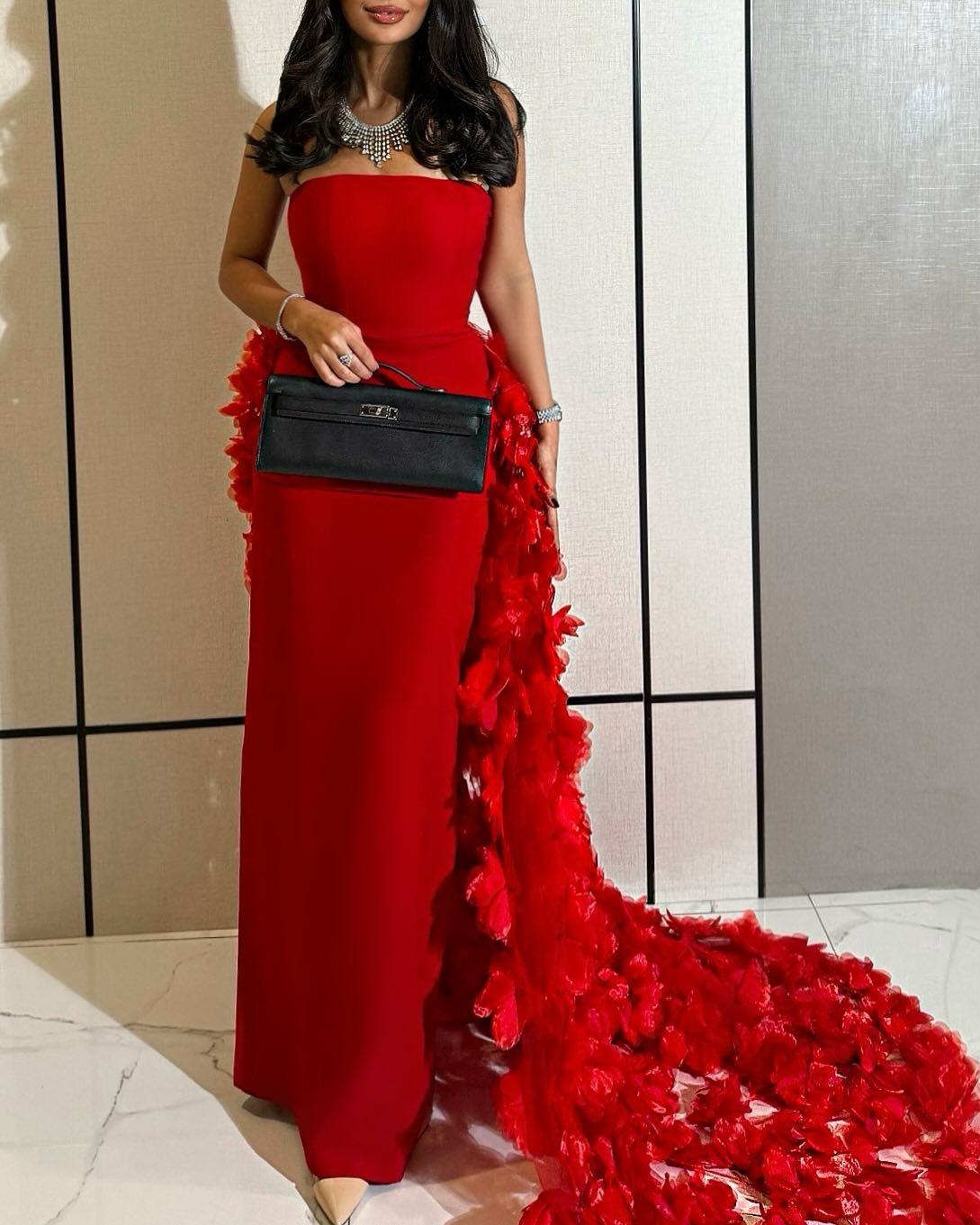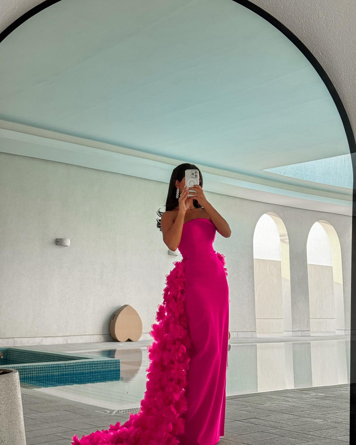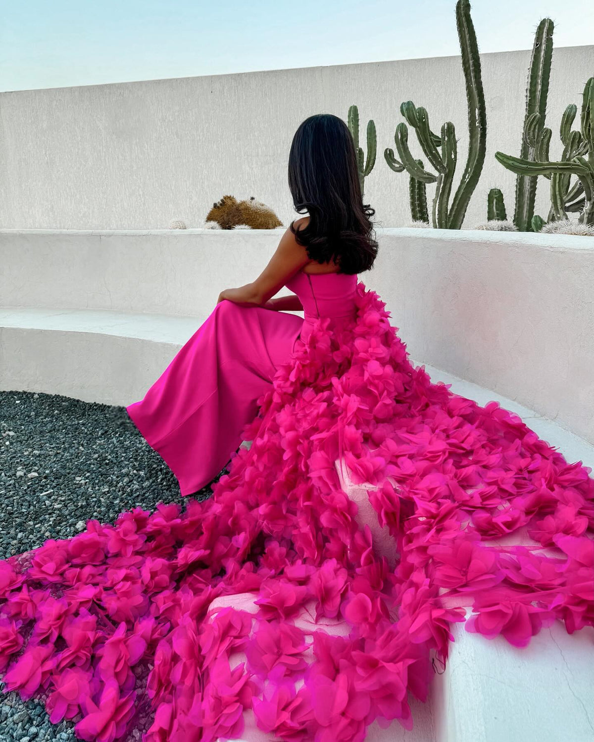 Chic Strapless Fuchsia Evening Dress with 3D Floral Overskirt SF473