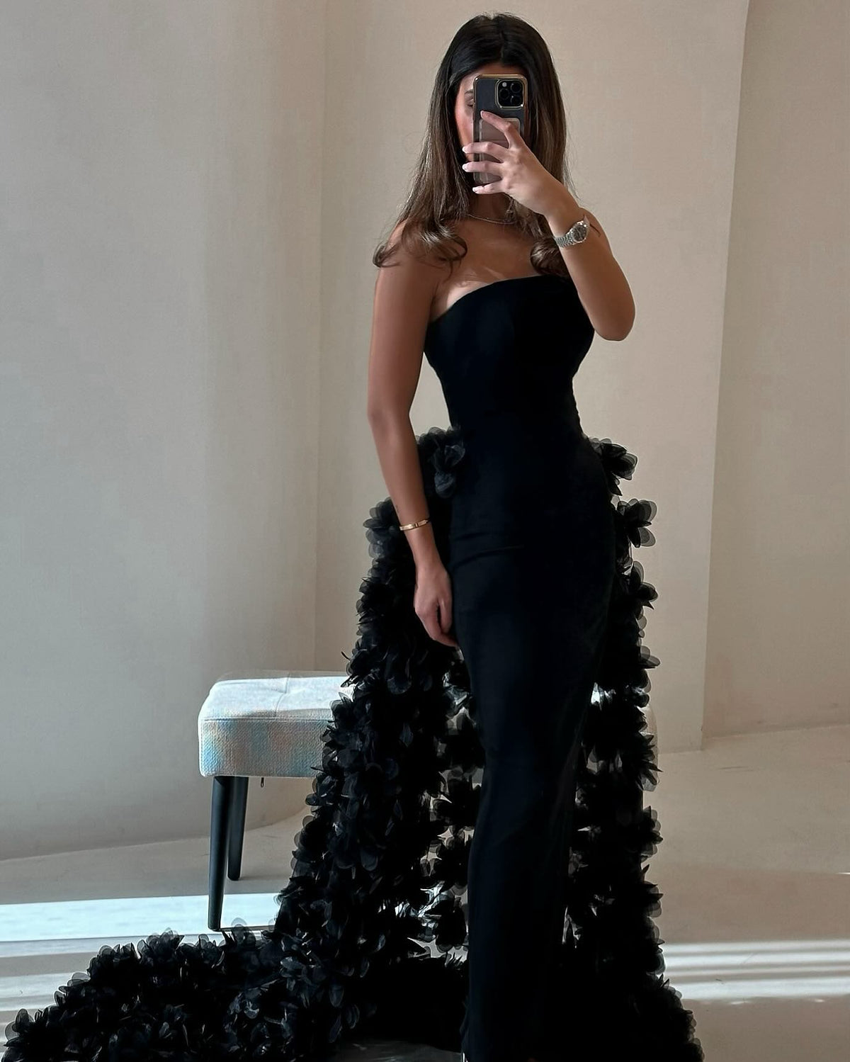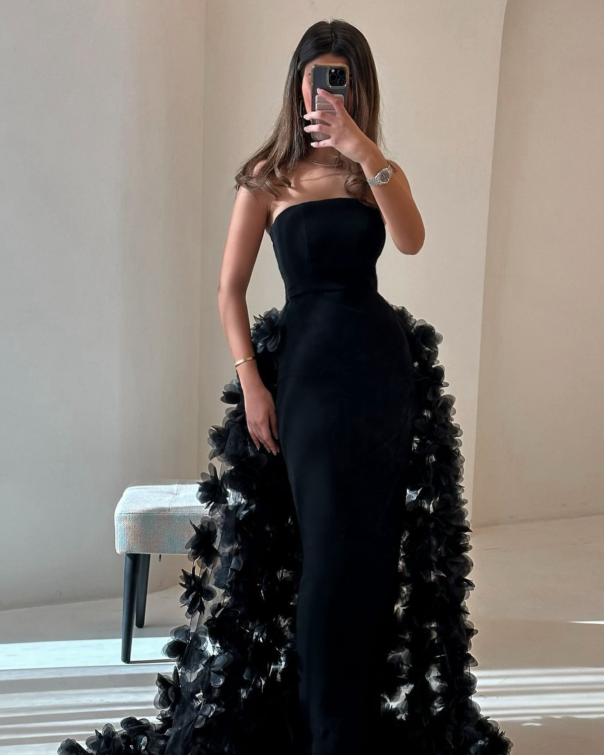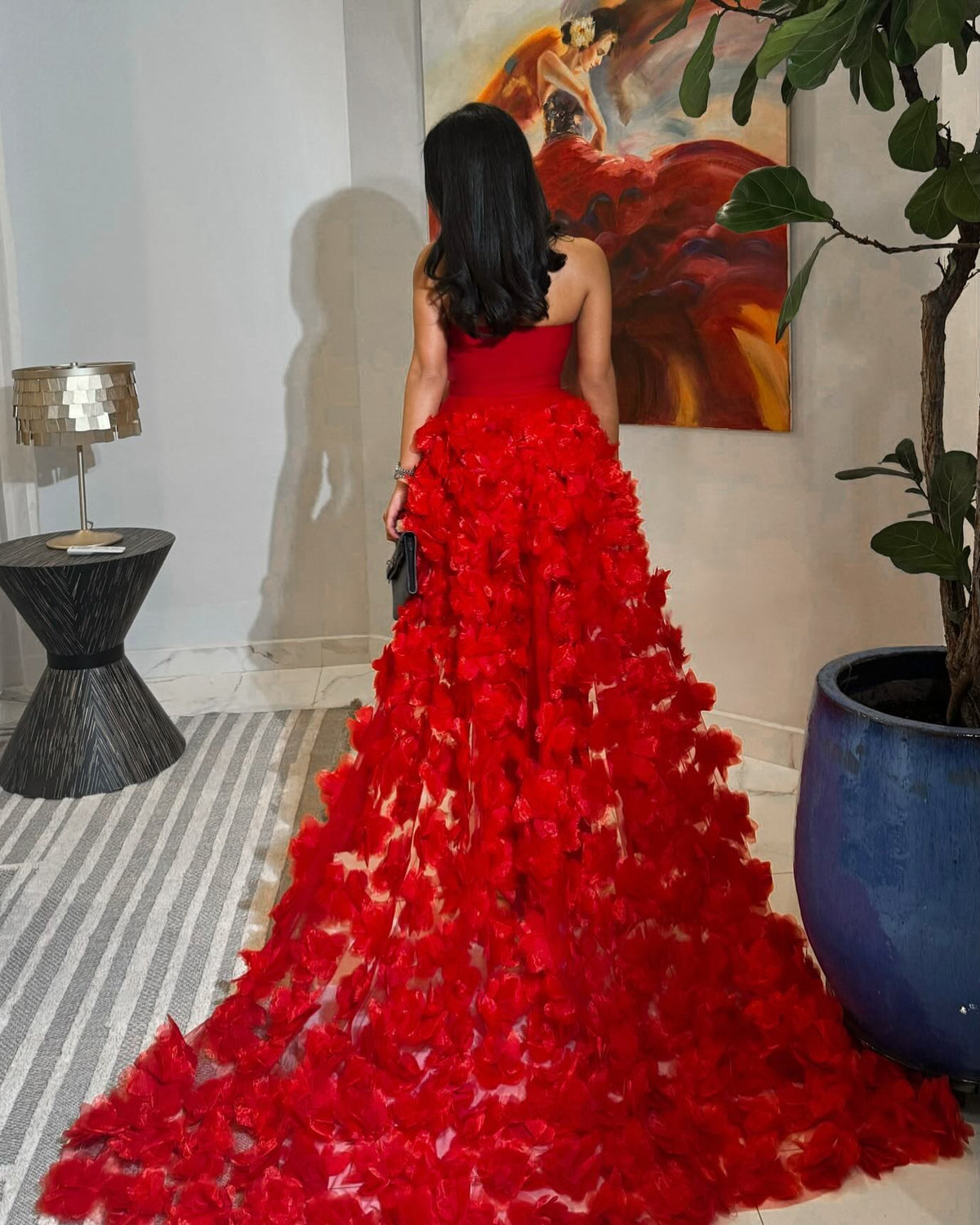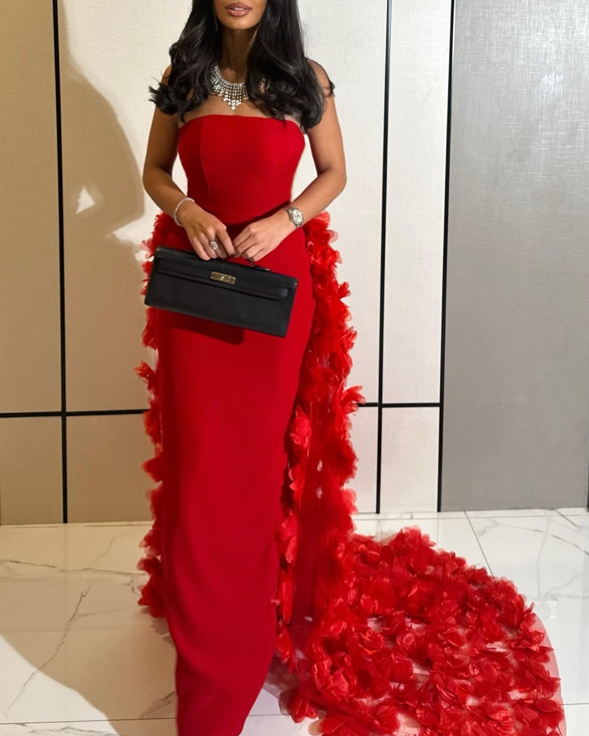 Chic Strapless Fuchsia Evening Dress with 3D Floral Overskirt SF473
