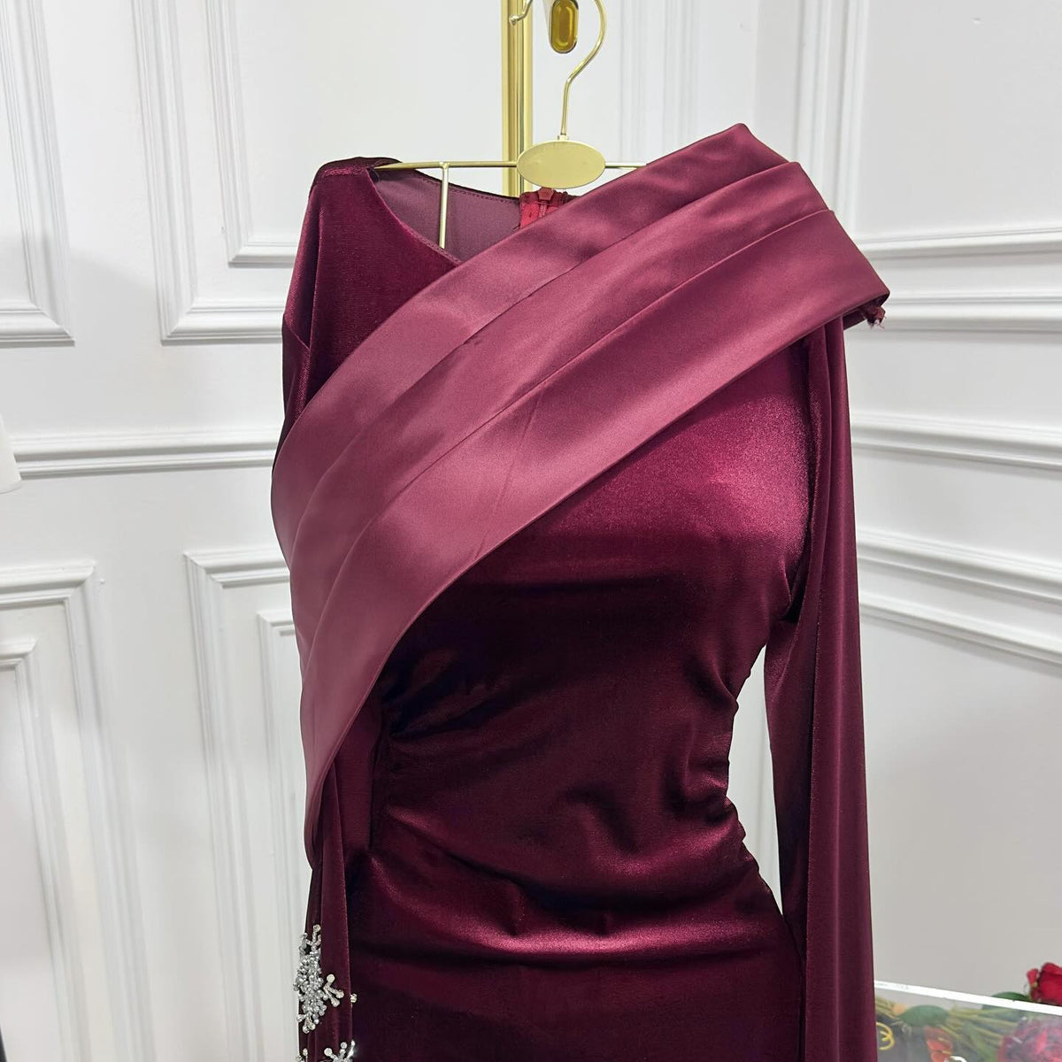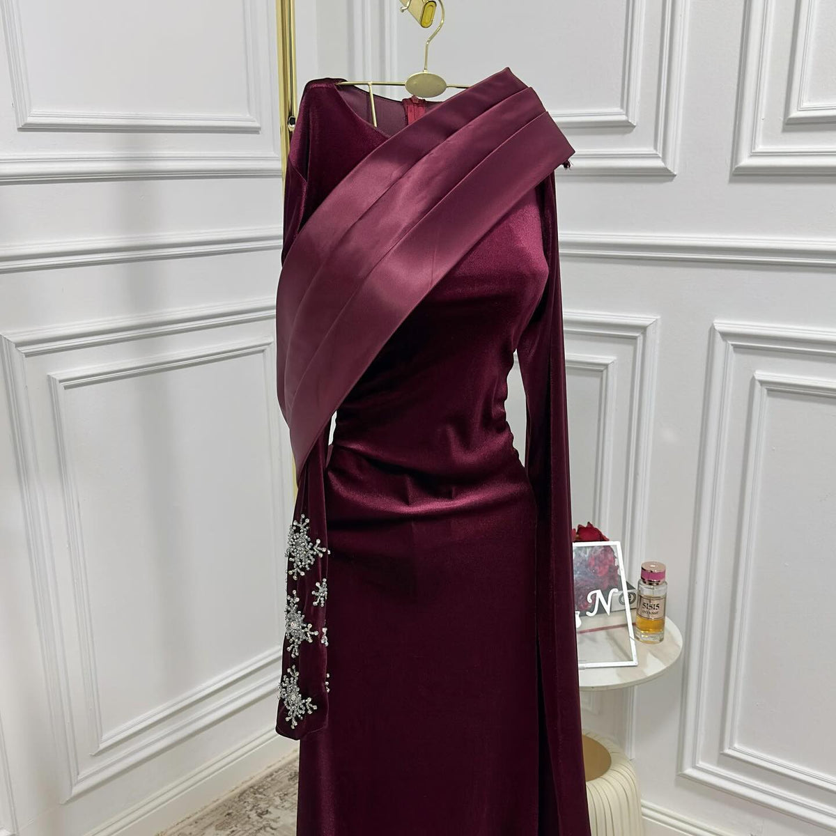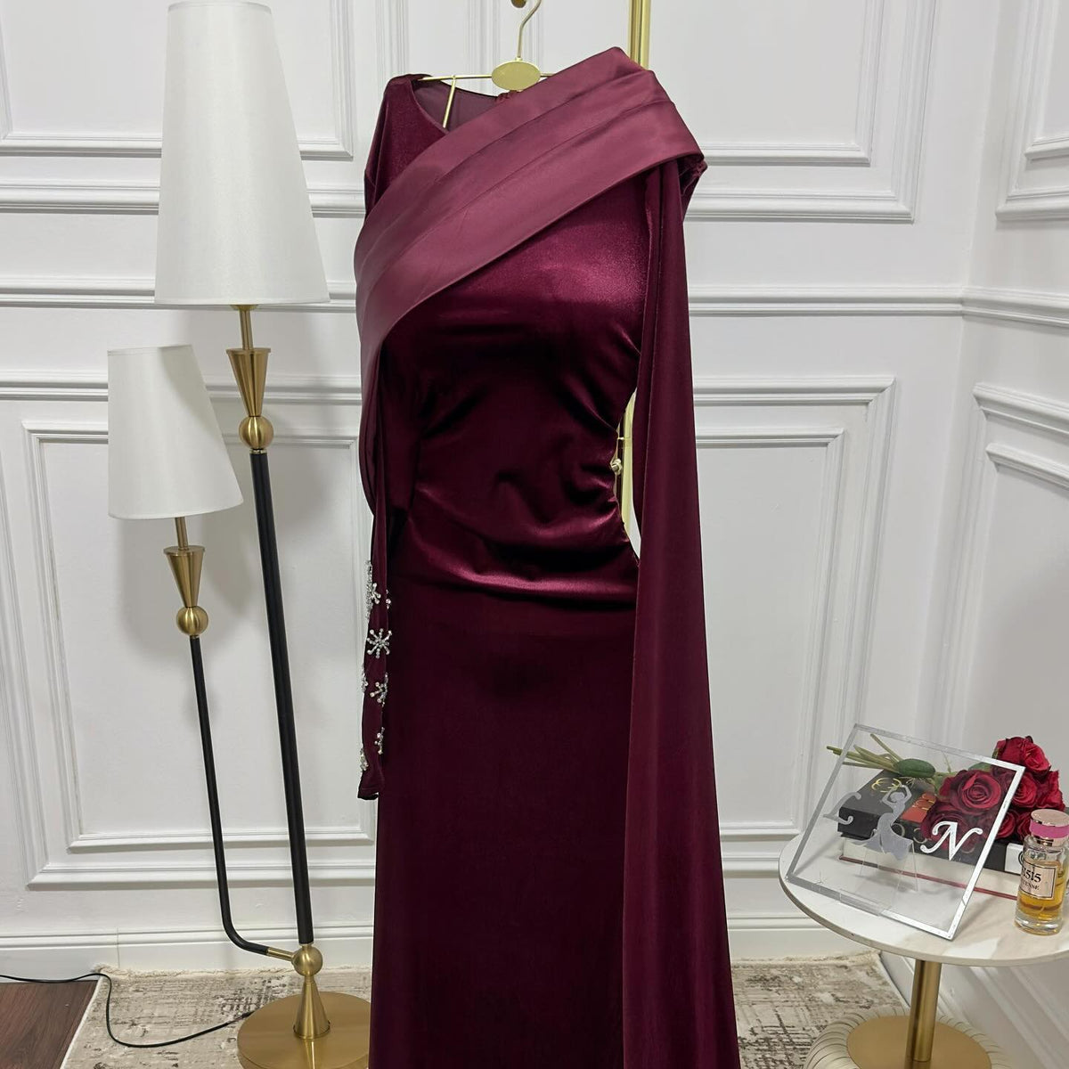 Elegant Beaded Cabernet Evening Dress with Cape Sleeves SF245