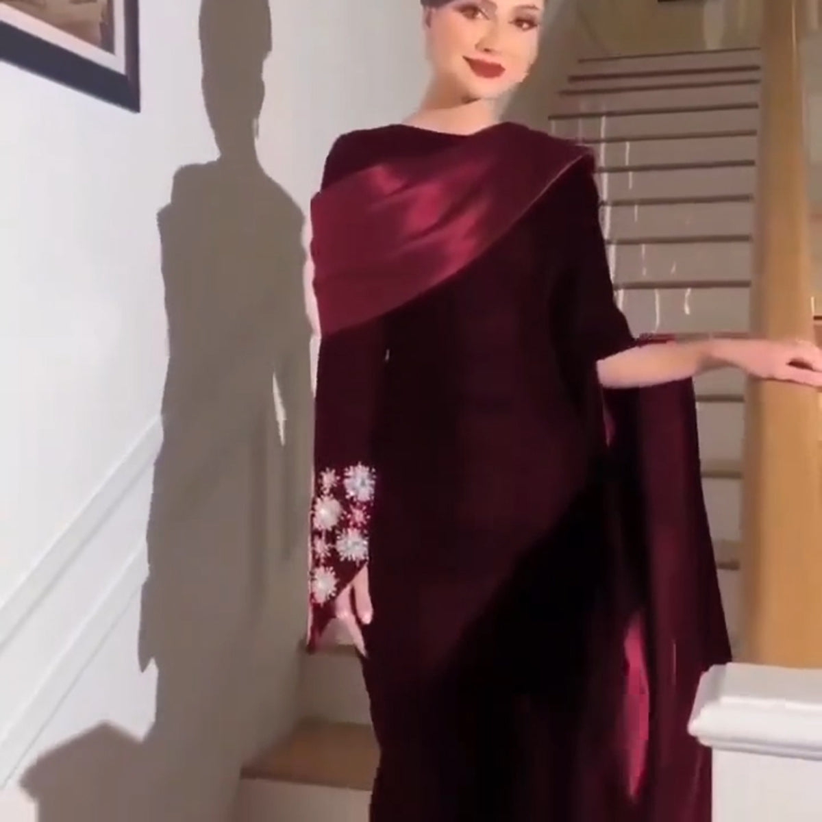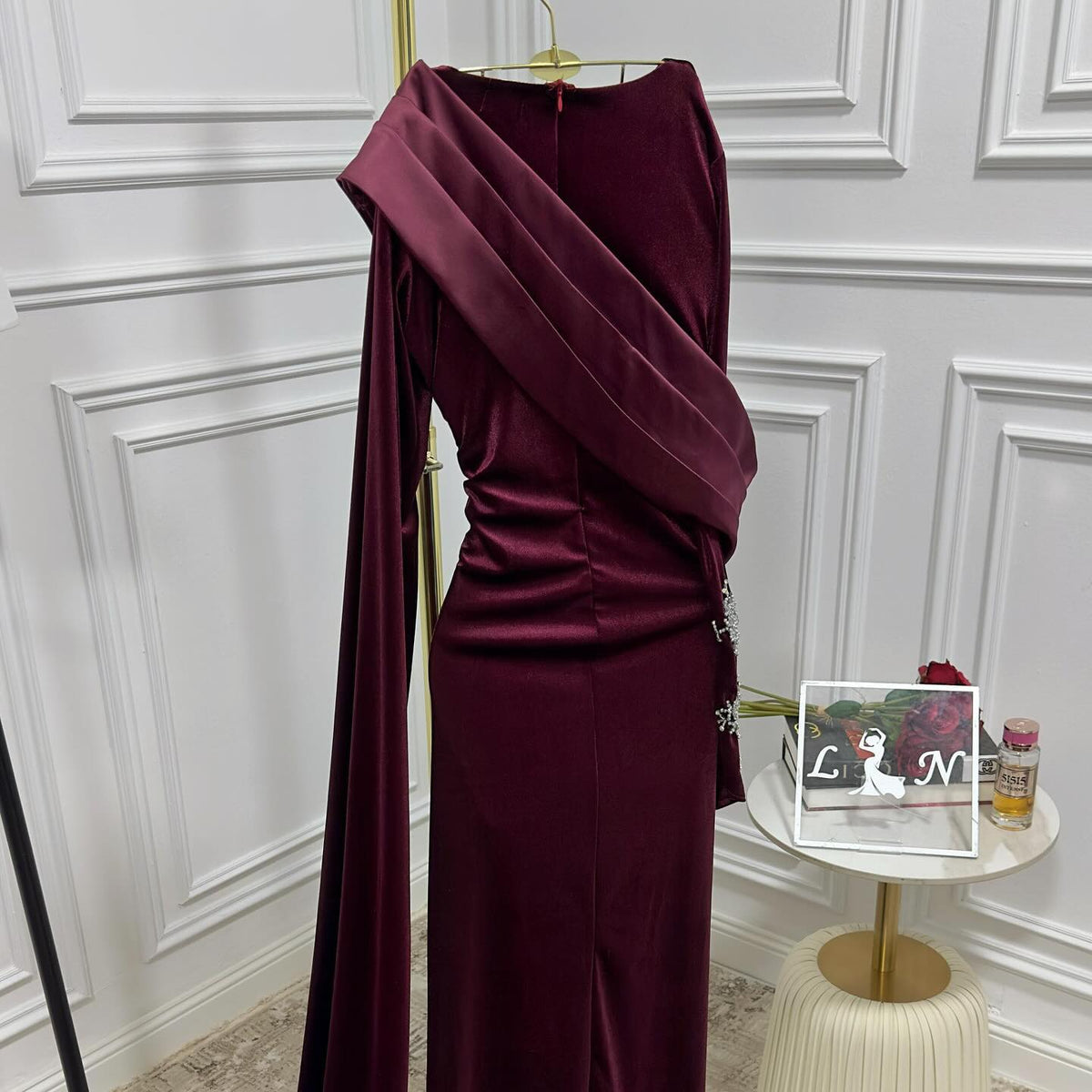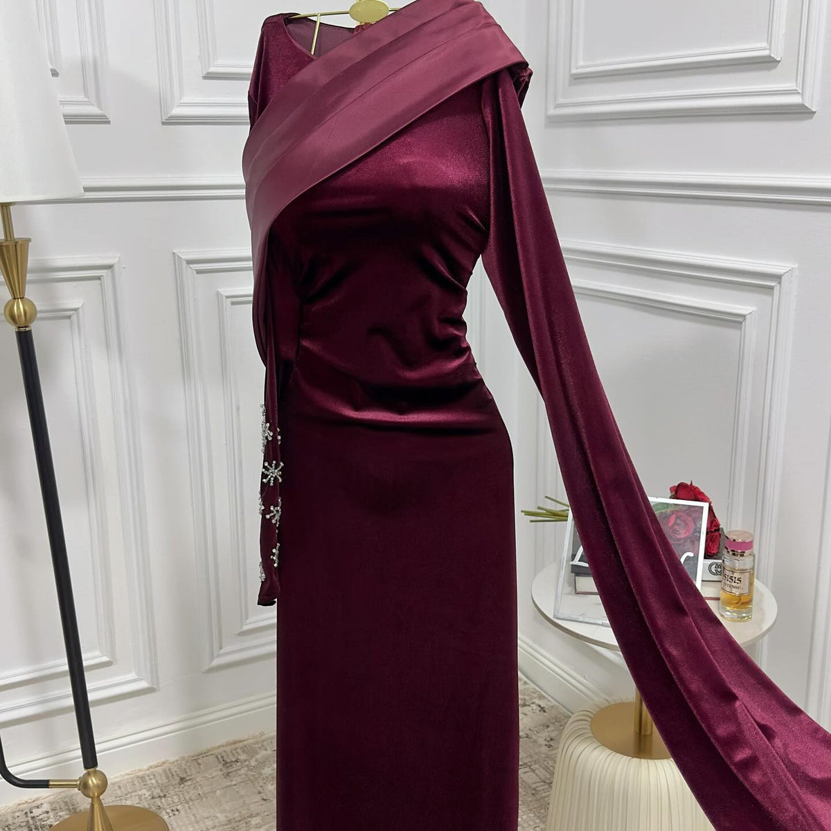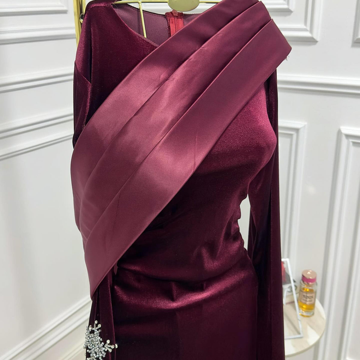 Elegant Beaded Cabernet Evening Dress with Cape Sleeves SF245