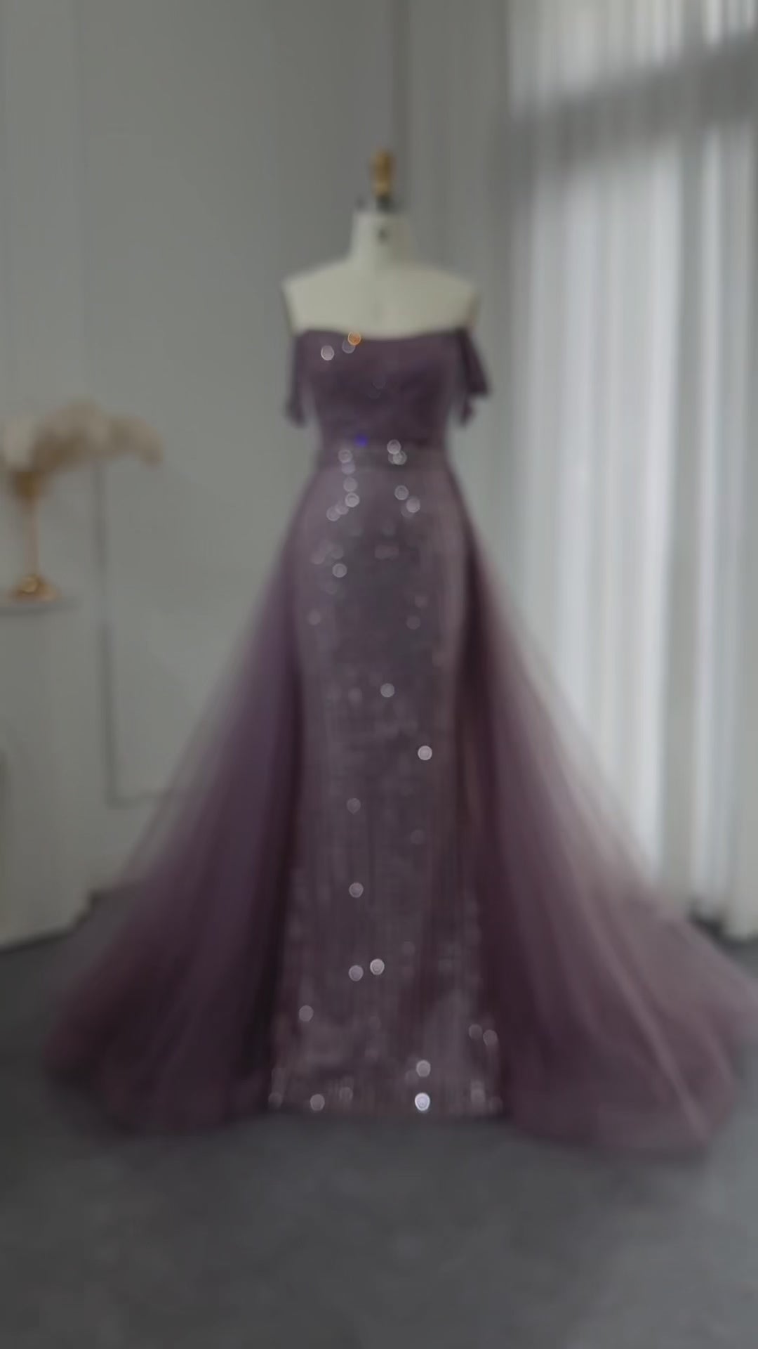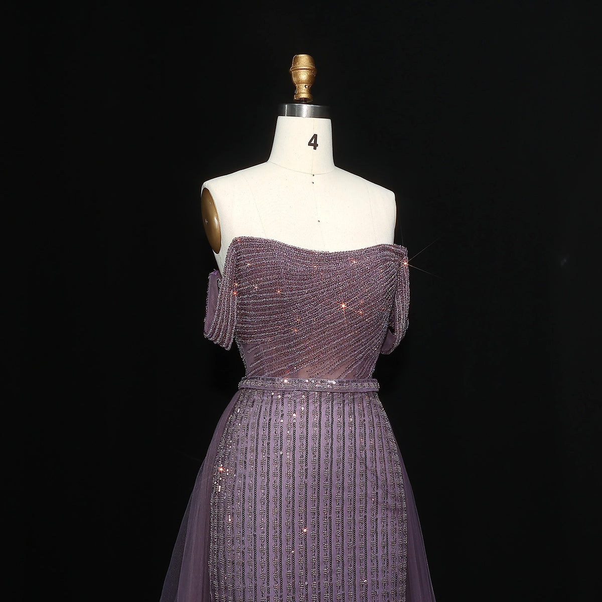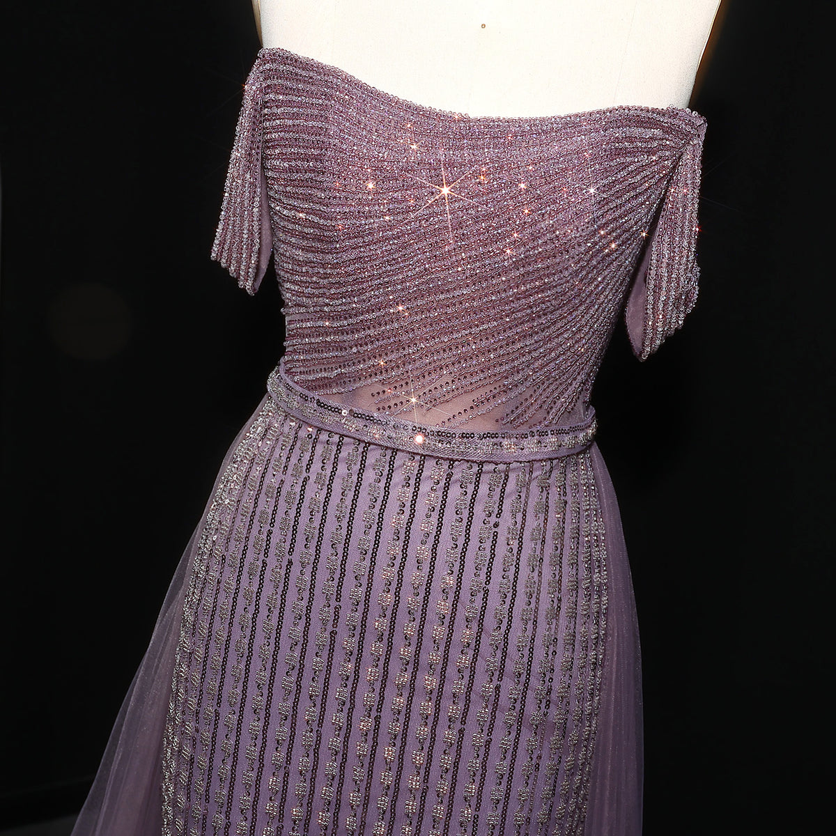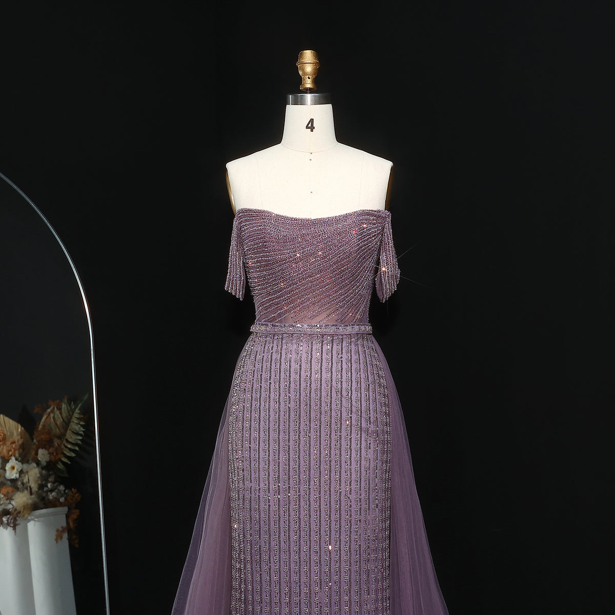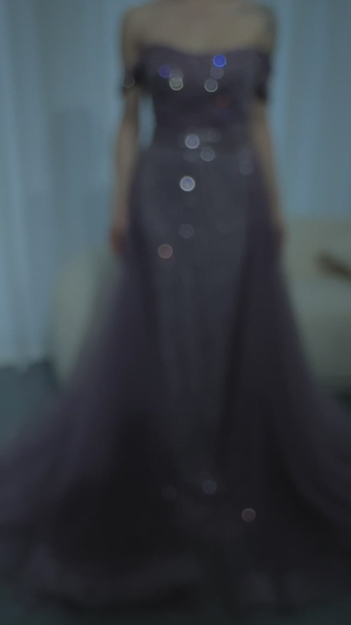 Elegant Beaded Purple Off-Shoulder Evening Dress with Overskirt SS137
