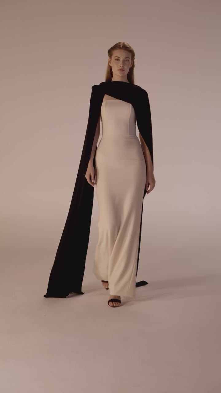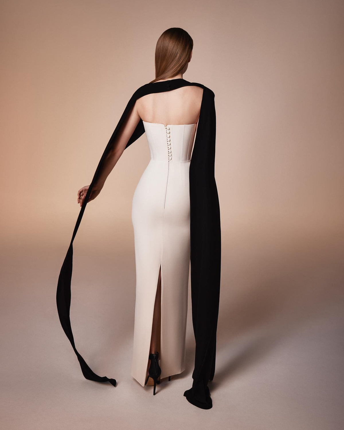This elegant beige strapless evening dress with cape sleeve SF104 is the perfect choice for any formal occasion. The strapless design adds a touch of sophistication, while the cape sleeve provides a unique and stylish look. Made with high-quality materials, this dress is not only elegant, but also comfortable to wear. Stand out in this dress and make a statement at your next event.