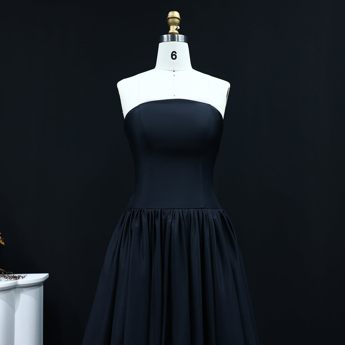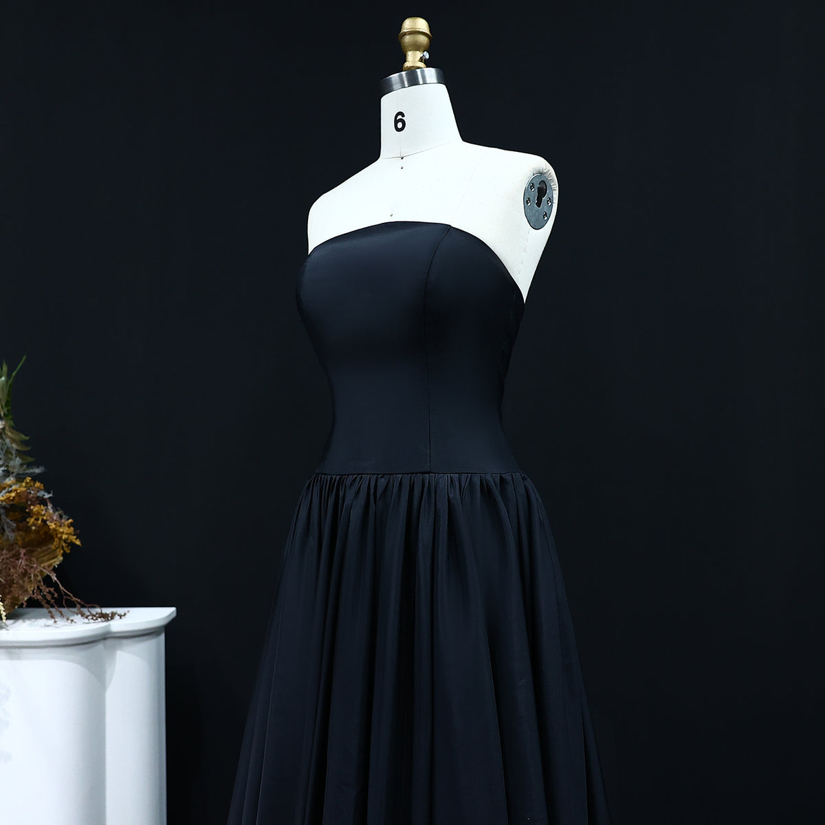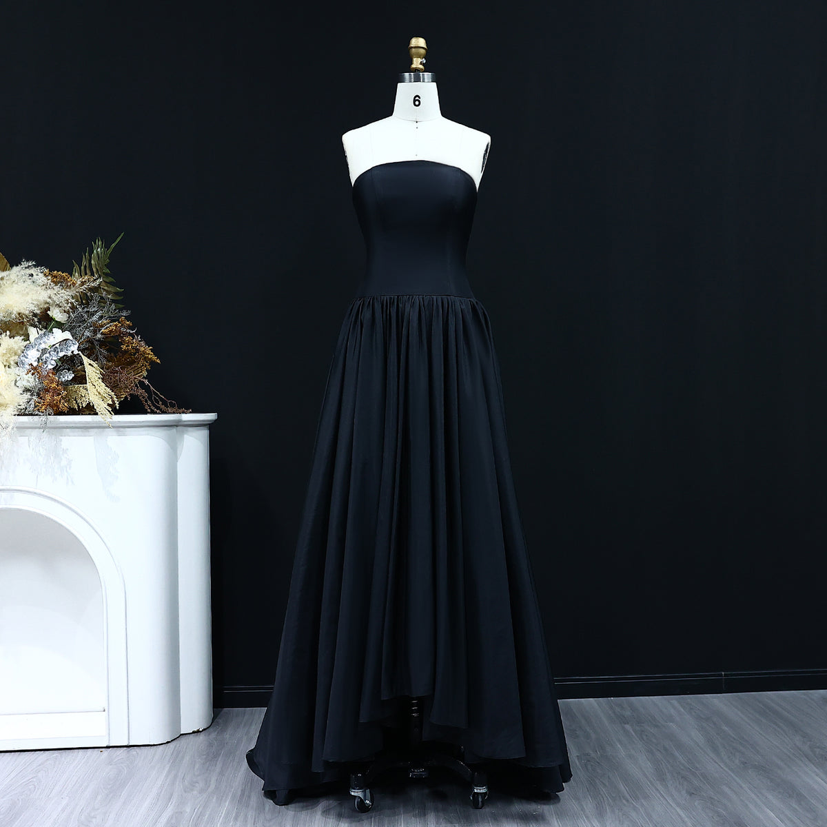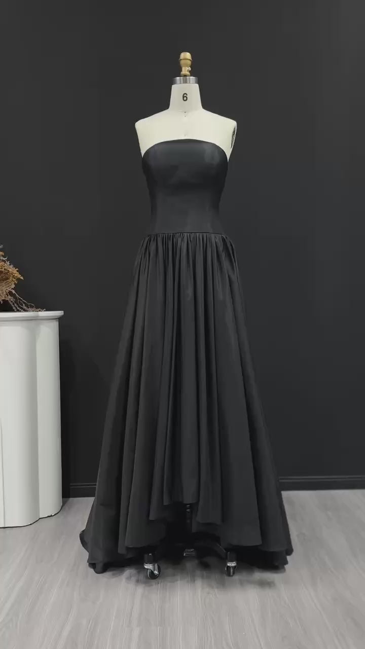 This elegant black A-line dress SF149 features a strapless design and a high low hemline, perfect for formal evening events. Crafted with precision and style, this dress exudes sophistication and class. Its flattering silhouette and timeless design make it a must-have for any fashion-forward woman. Elevate your style with this stunning evening dress.