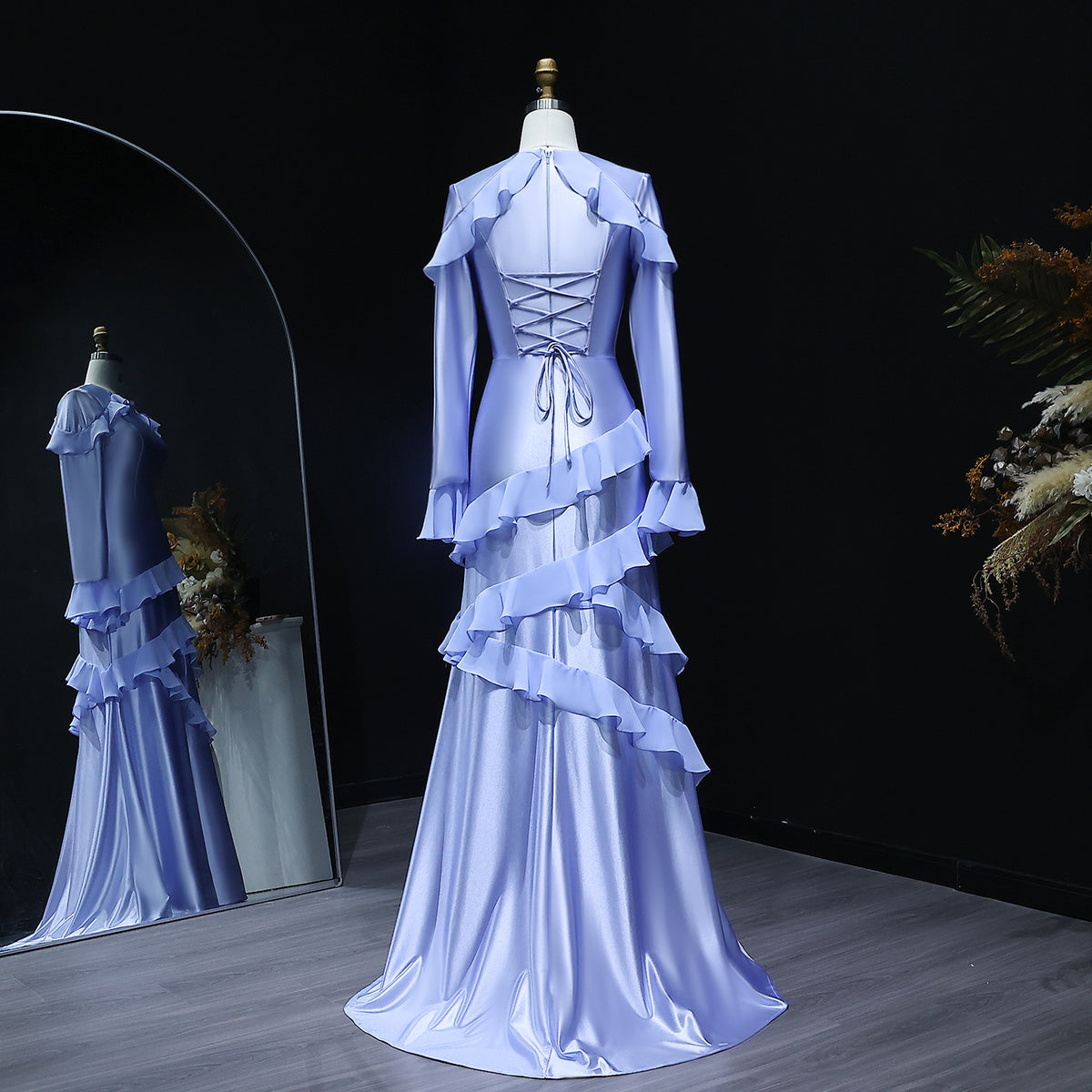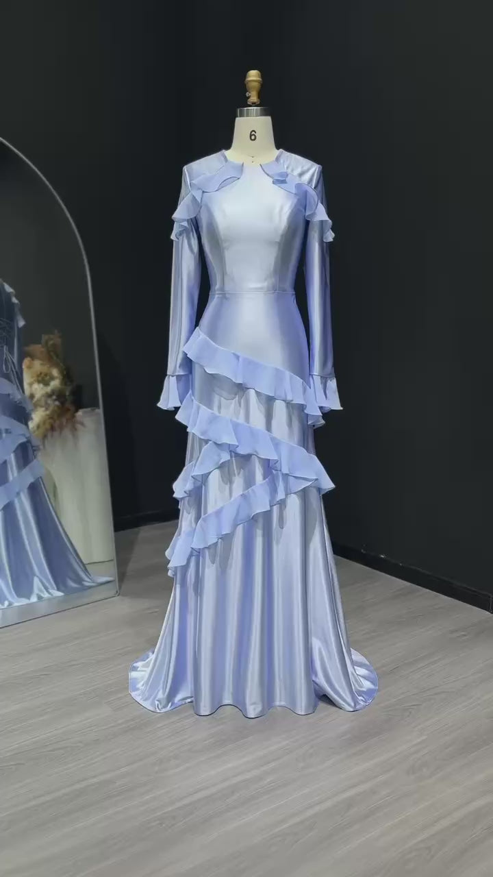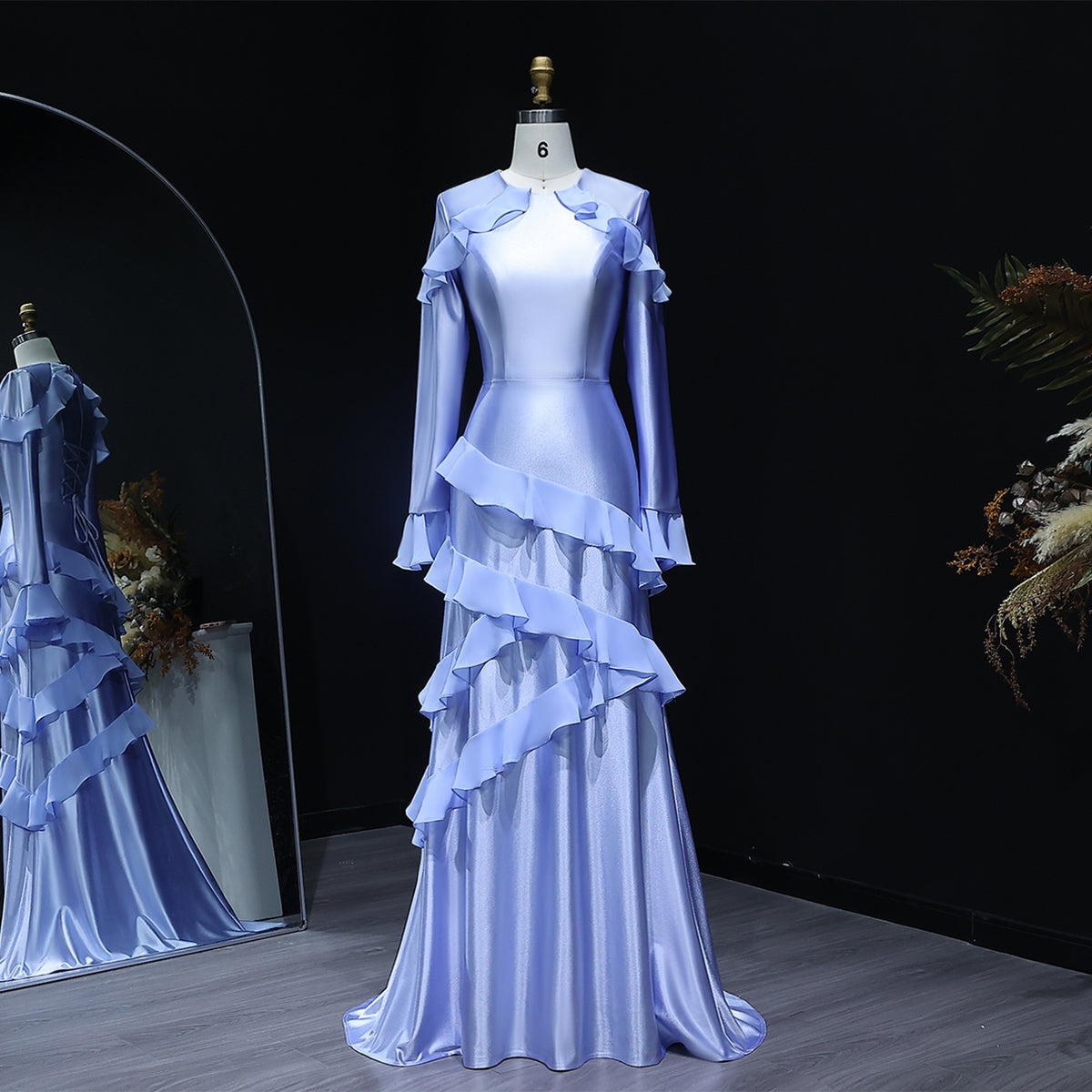 Elegant Blue Long Sleeves Tiered Satin Evening Dress SF585