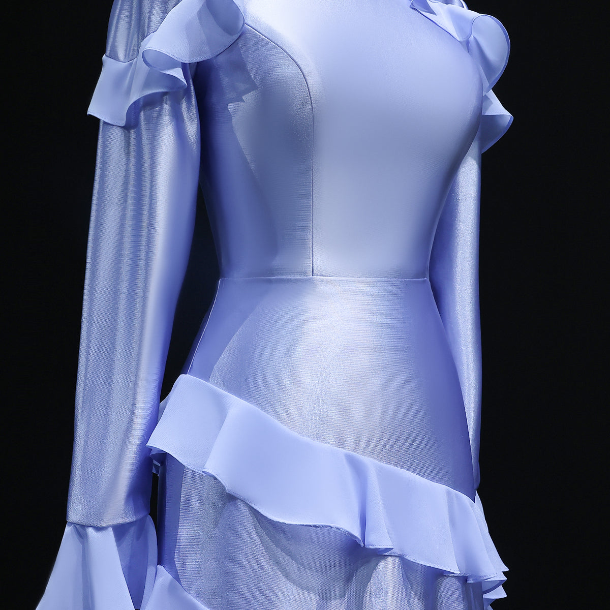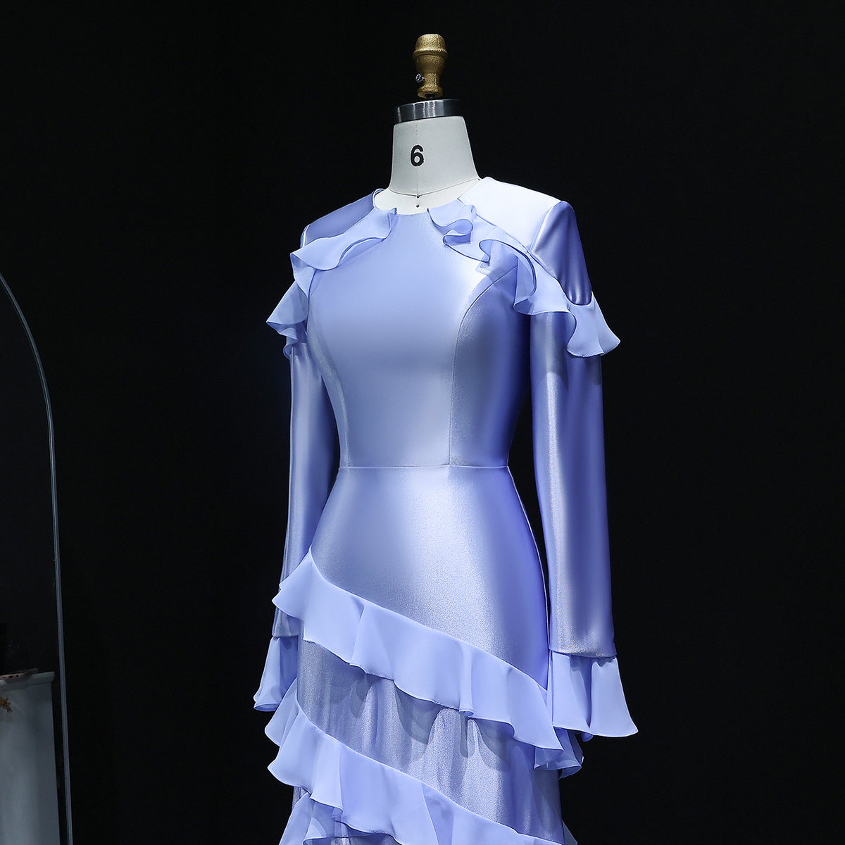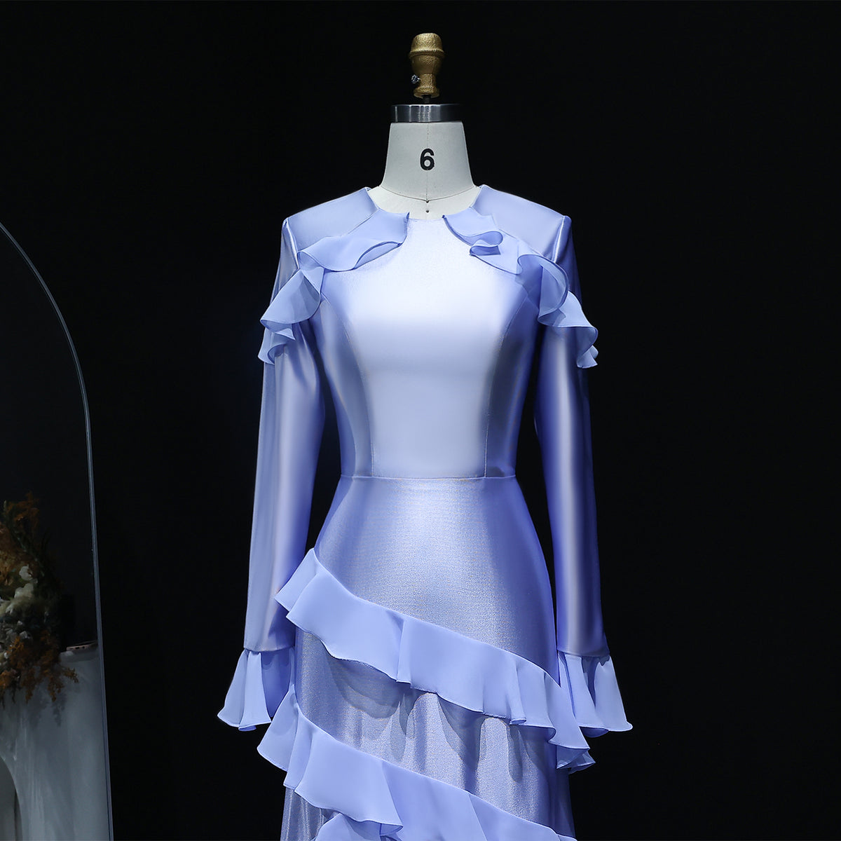Elegant Blue Long Sleeves Tiered Satin Evening Dress SF585