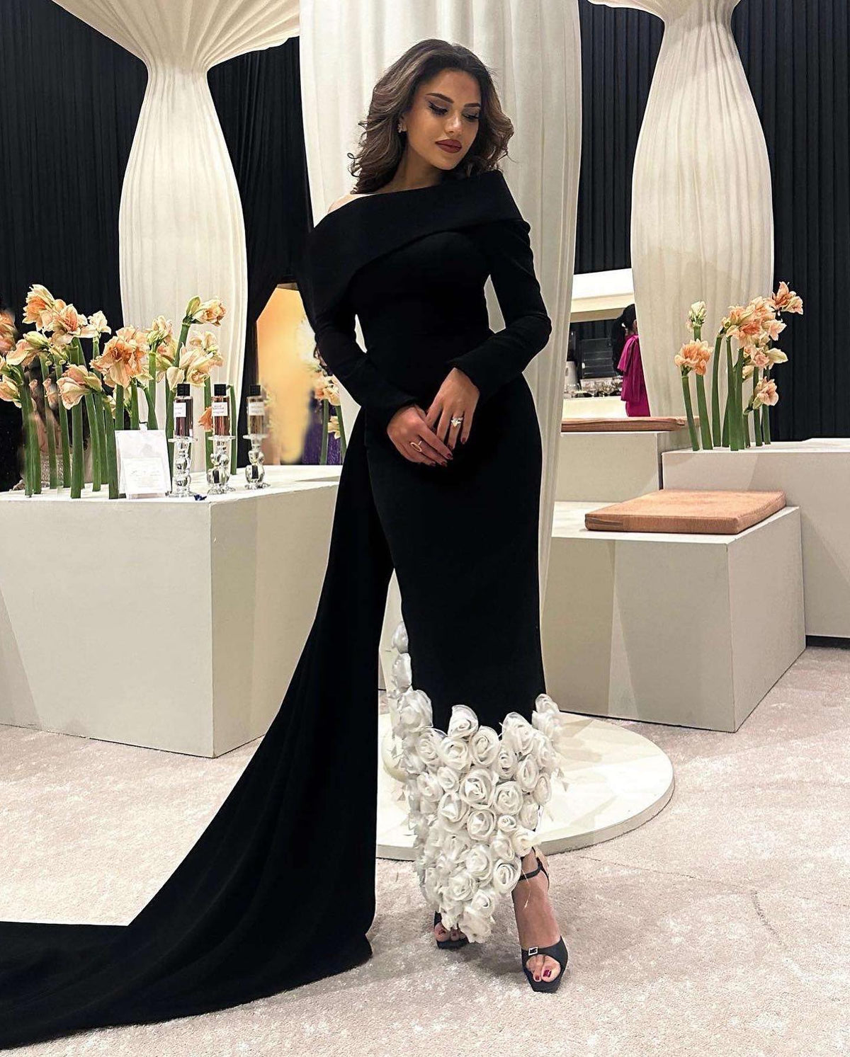 This Sharon Said evening dress, featuring a one-shoulder design and elegant 3D flower and feather details, showcases a modern and sophisticated style. The long sleeves add a touch of grace, while the mermaid silhouette flatters and accentuates the curves of the wearer. Perfect for formal events and parties.