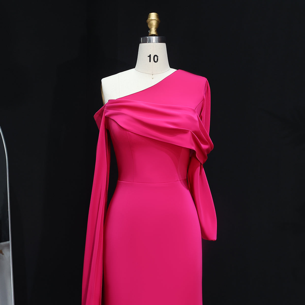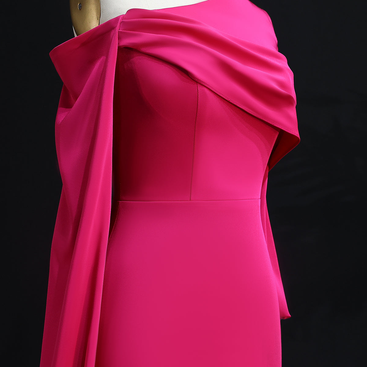 This elegant fuchsia dress is perfect for your next evening event. Made from high-quality satin, it features a unique one shoulder design and stunning cape sleeves. The sophisticated color and luxurious fabric will make you stand out while the cape sleeves add an extra touch of glamour. Elevate your style with this chic dress.