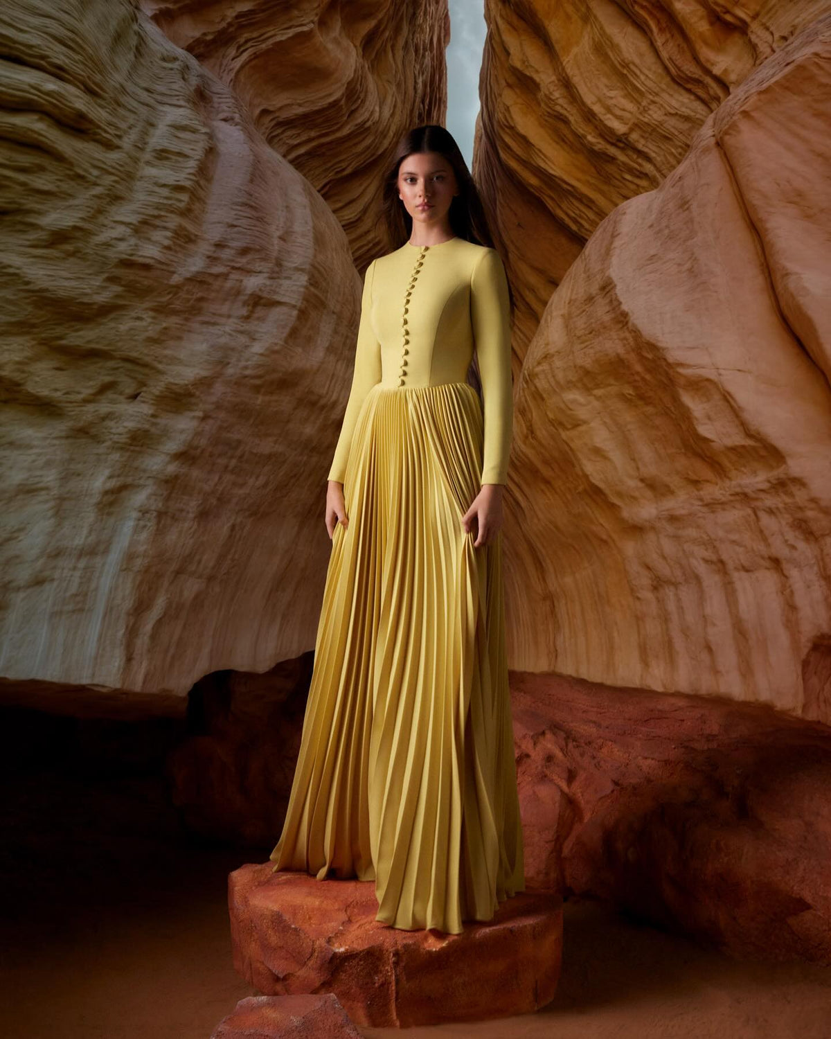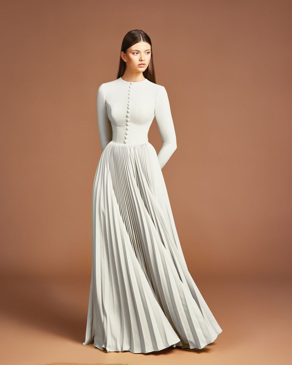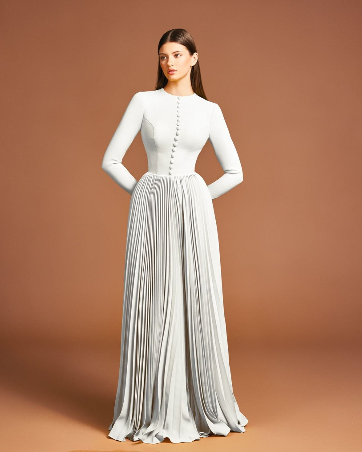 This elegant evening dress features long sleeves and an A-line silhouette for a flattering fit. Made with gold fabric, it adds a touch of sophistication and luxury to any special occasion. Perfect for formal events and parties, this dress will make you feel confident and stylish.