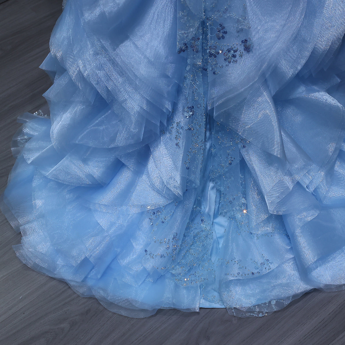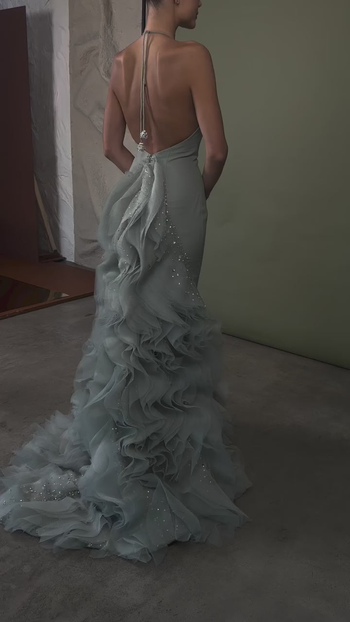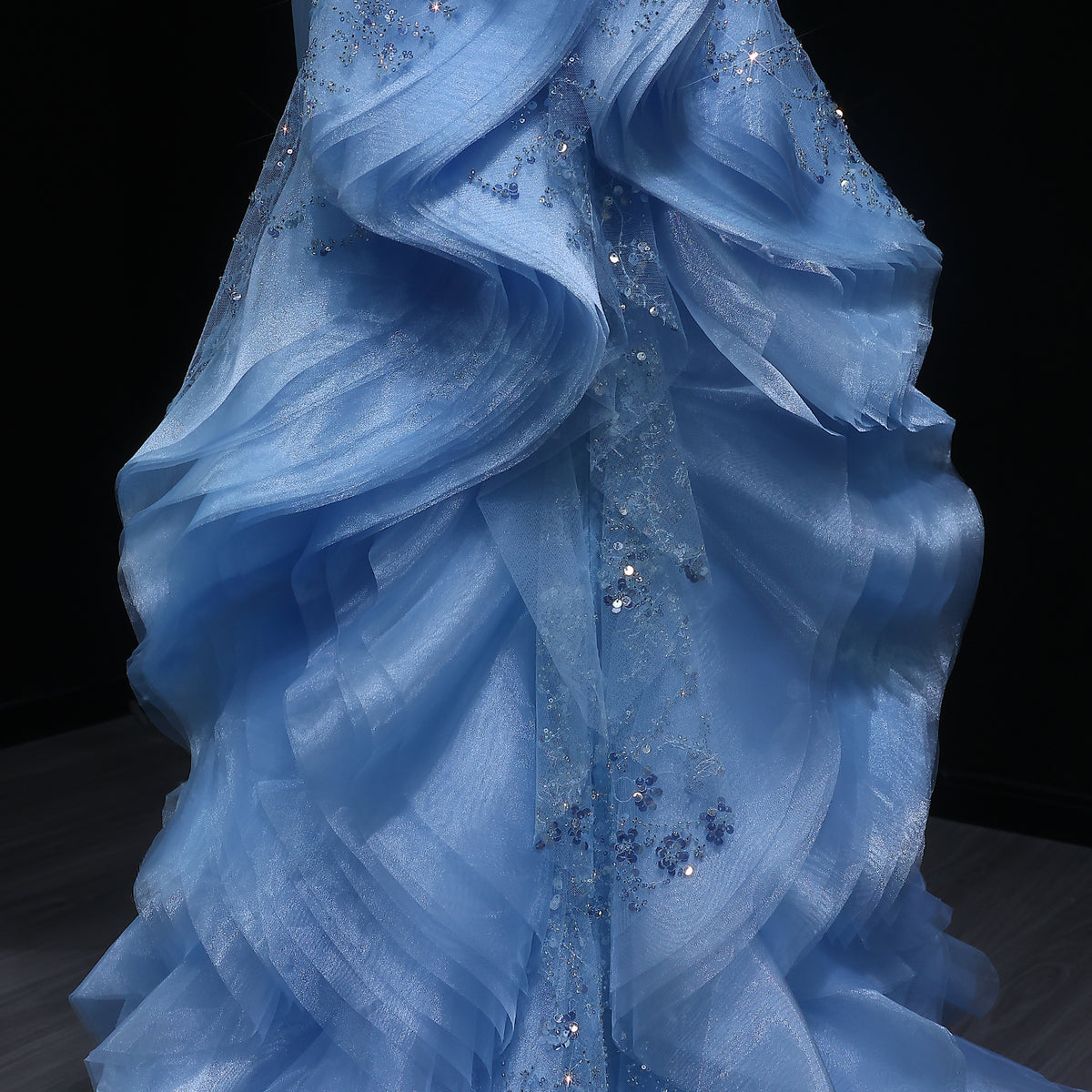 Elegant Halter Blue Evening Dress with Ruffles Train SS524