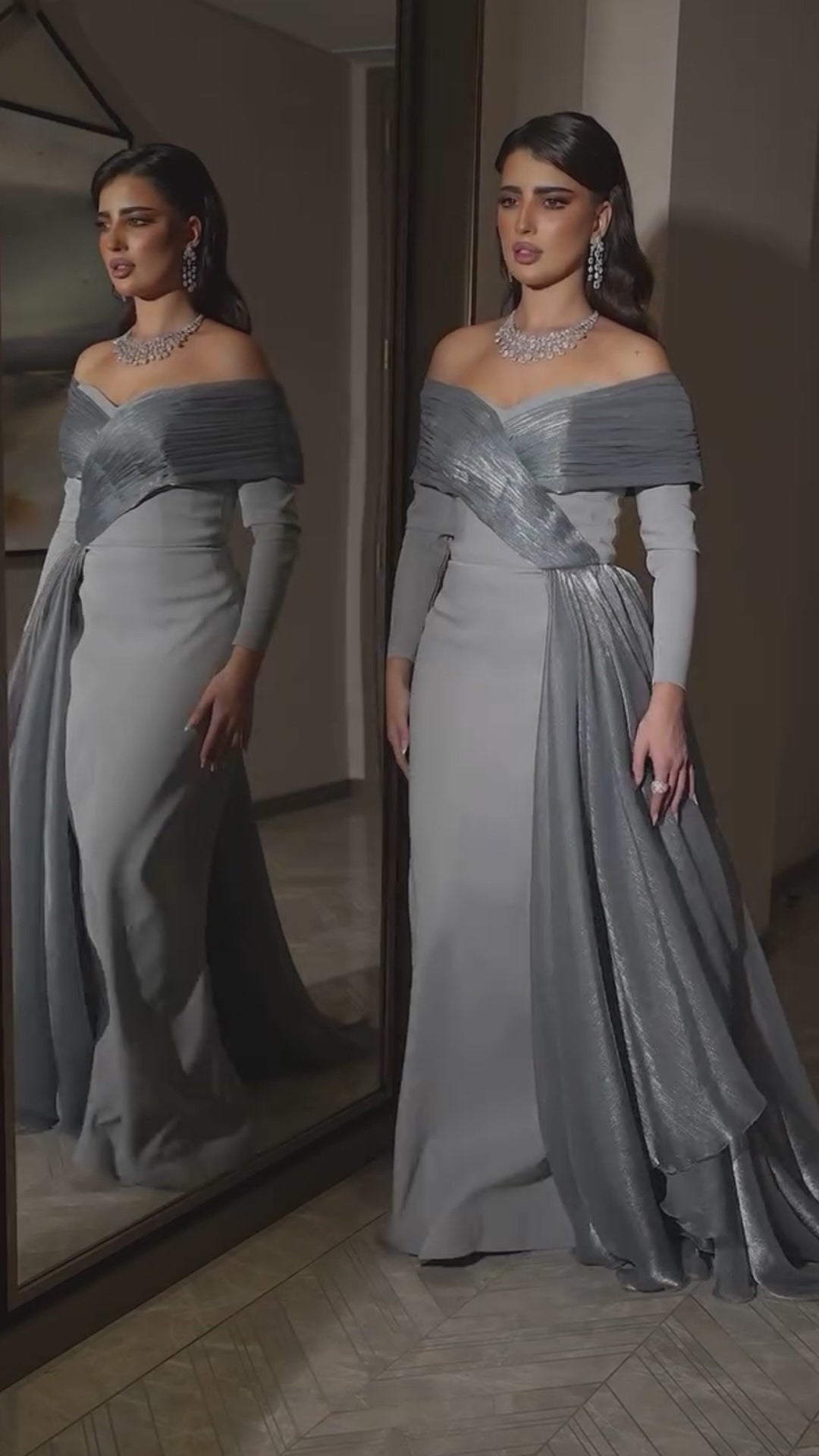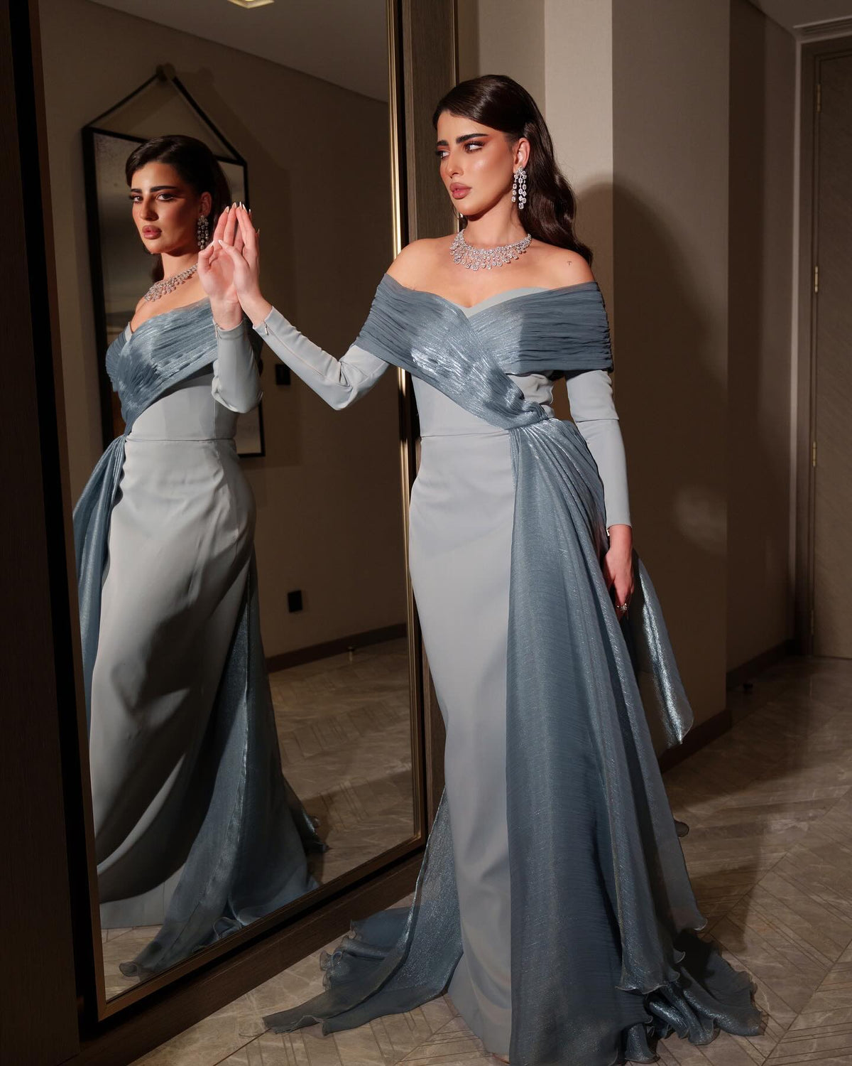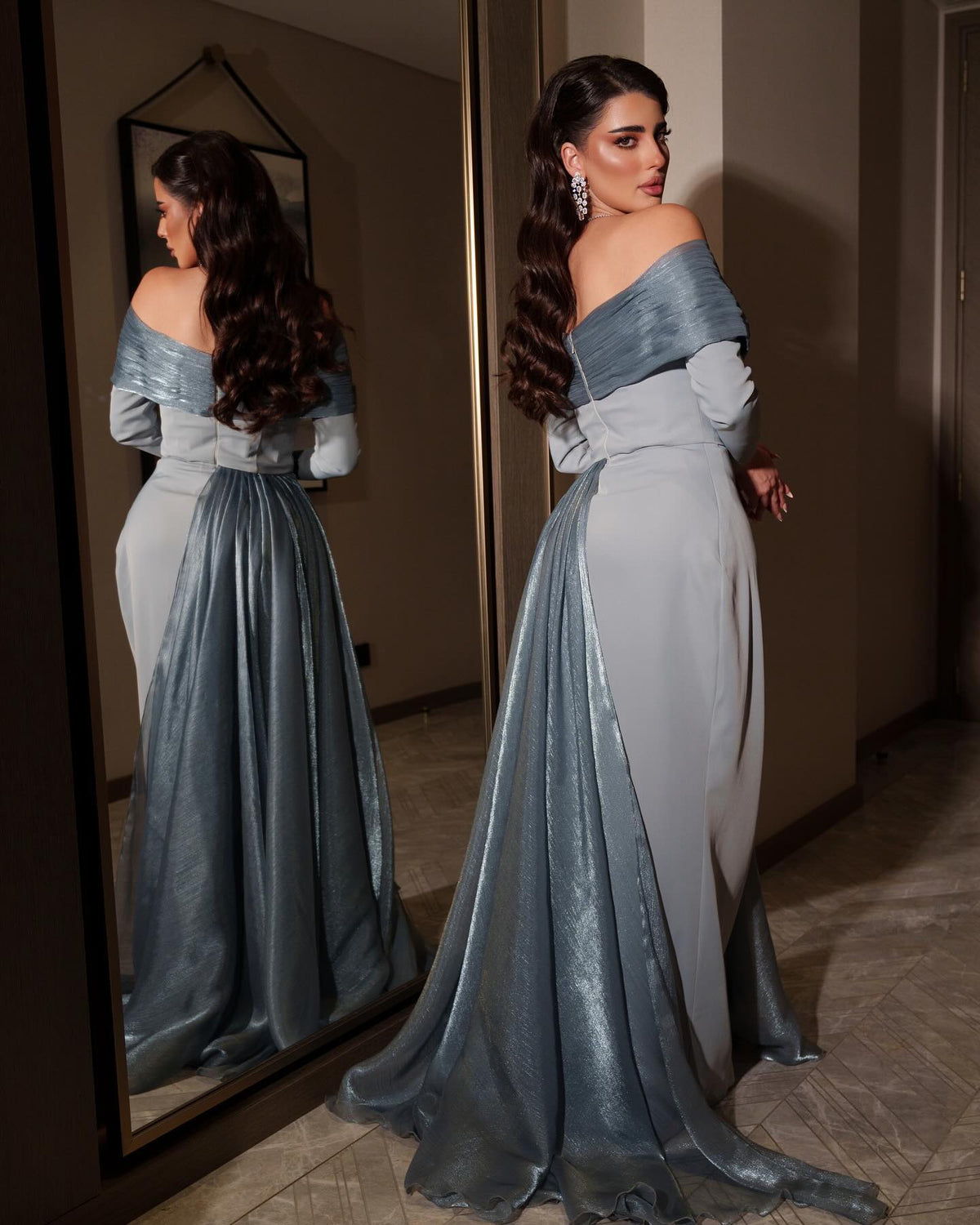 This stunning off shoulder blue evening dress features elegant pleats and a flowing overskirt, making it the perfect choice for a glamorous event. With a sophisticated design and high-quality craftsmanship, this dress will make you feel confident and stylish. Stand out from the crowd in this one-of-a-kind piece.