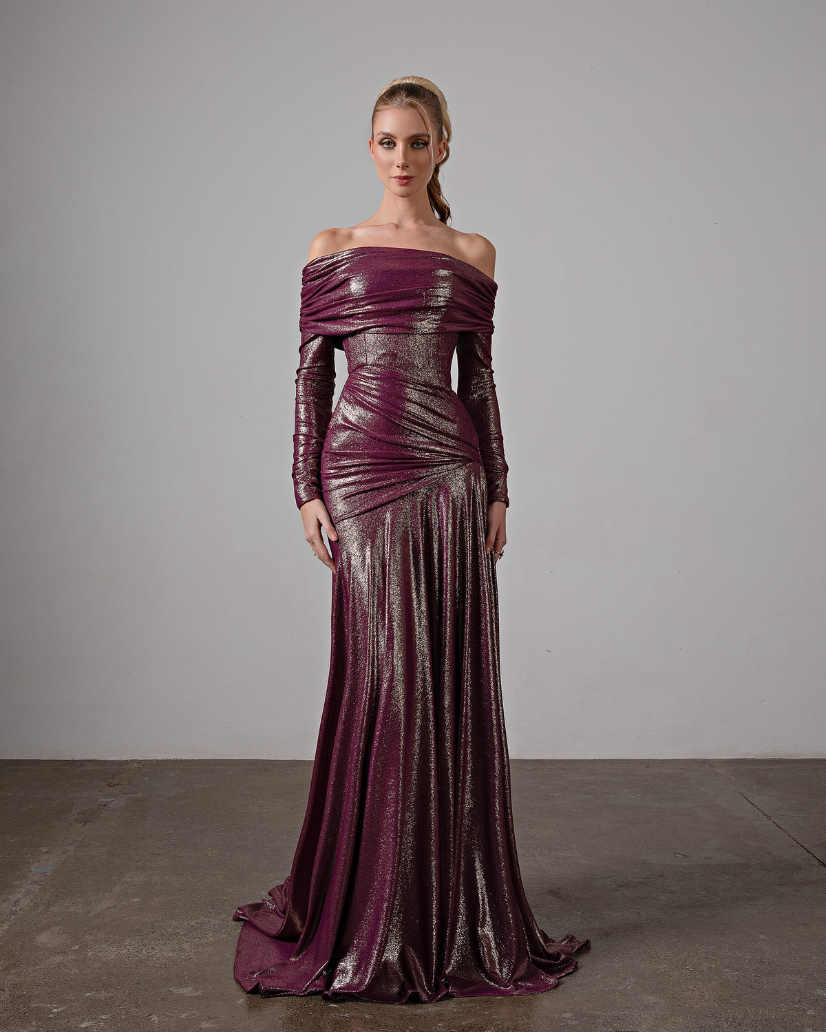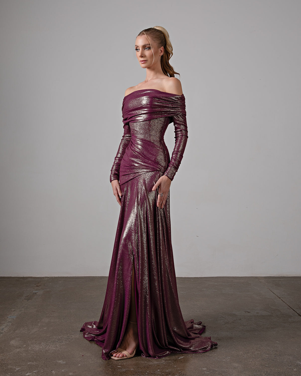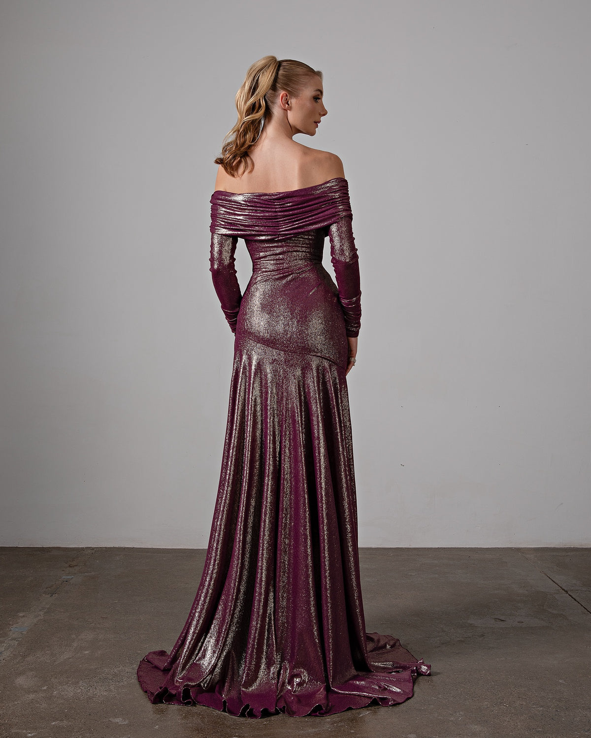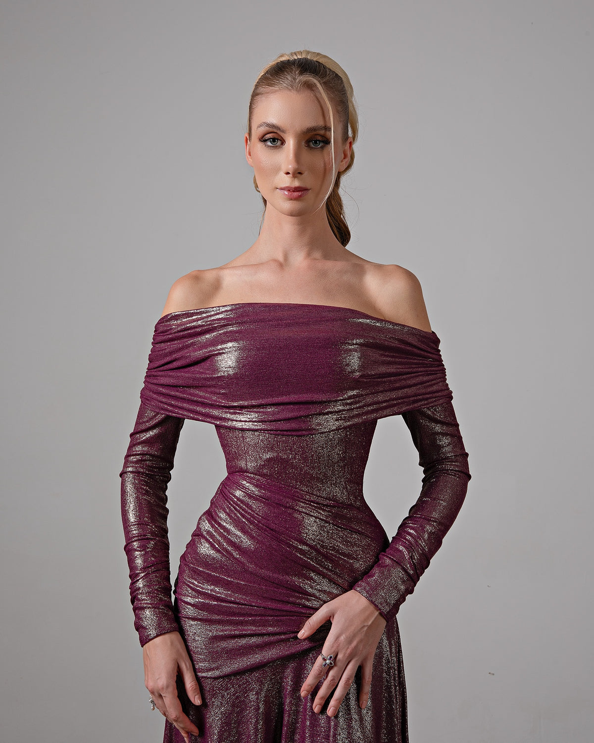This elegant off shoulder purple mermaid draped evening dress SF592 features a flattering silhouette that accentuates your curves. The off shoulder design adds a touch of sophistication, while the draping adds a touch of elegance. Perfect for a special evening event.