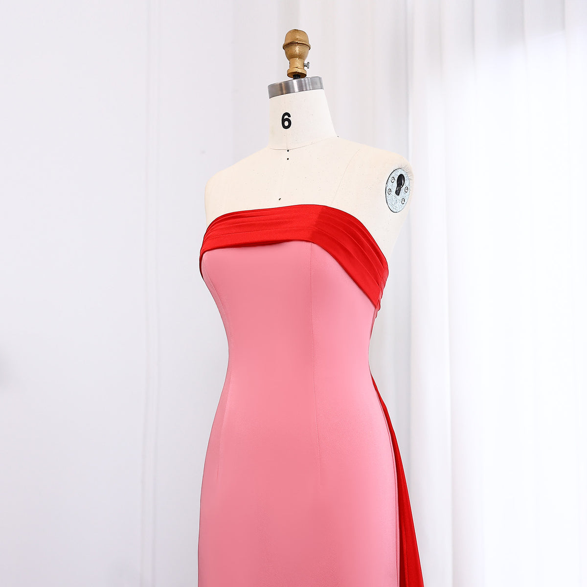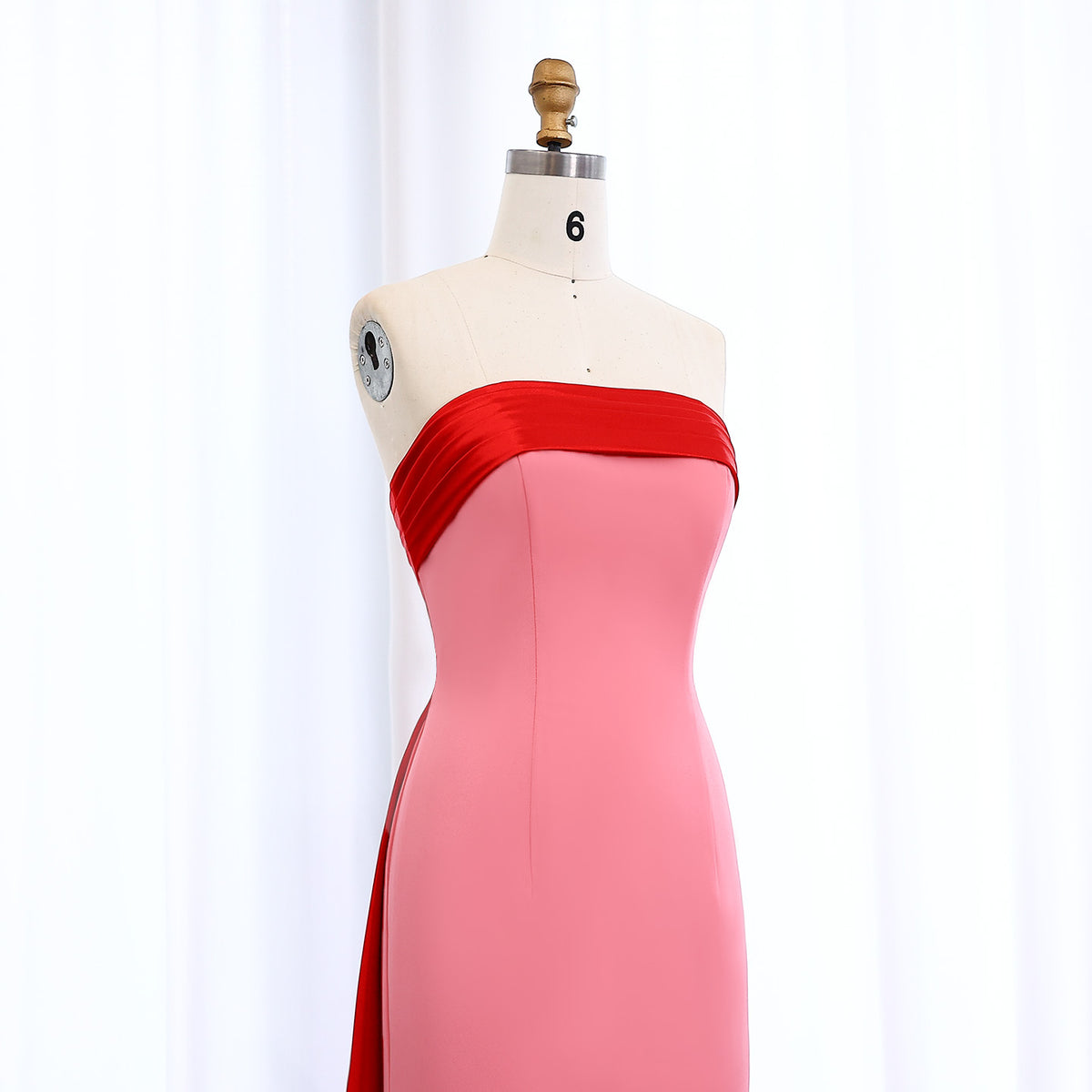This elegant pink and red strapless satin evening dress exudes sophistication and class. The overskirt adds a touch of drama to the timeless silhouette. Perfect for special occasions and formal events, this dress will make you feel confident and beautiful.