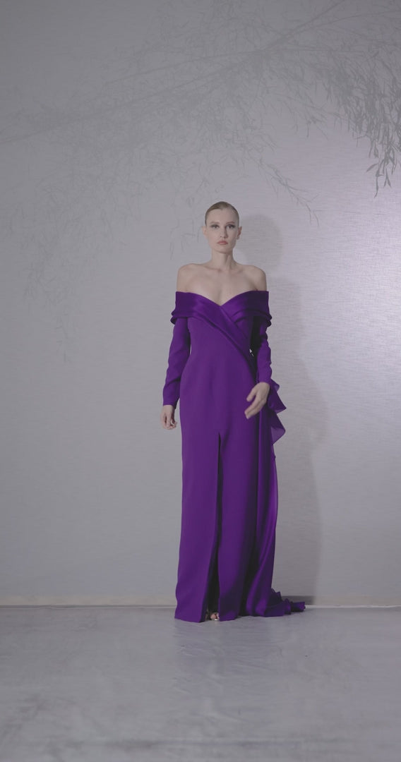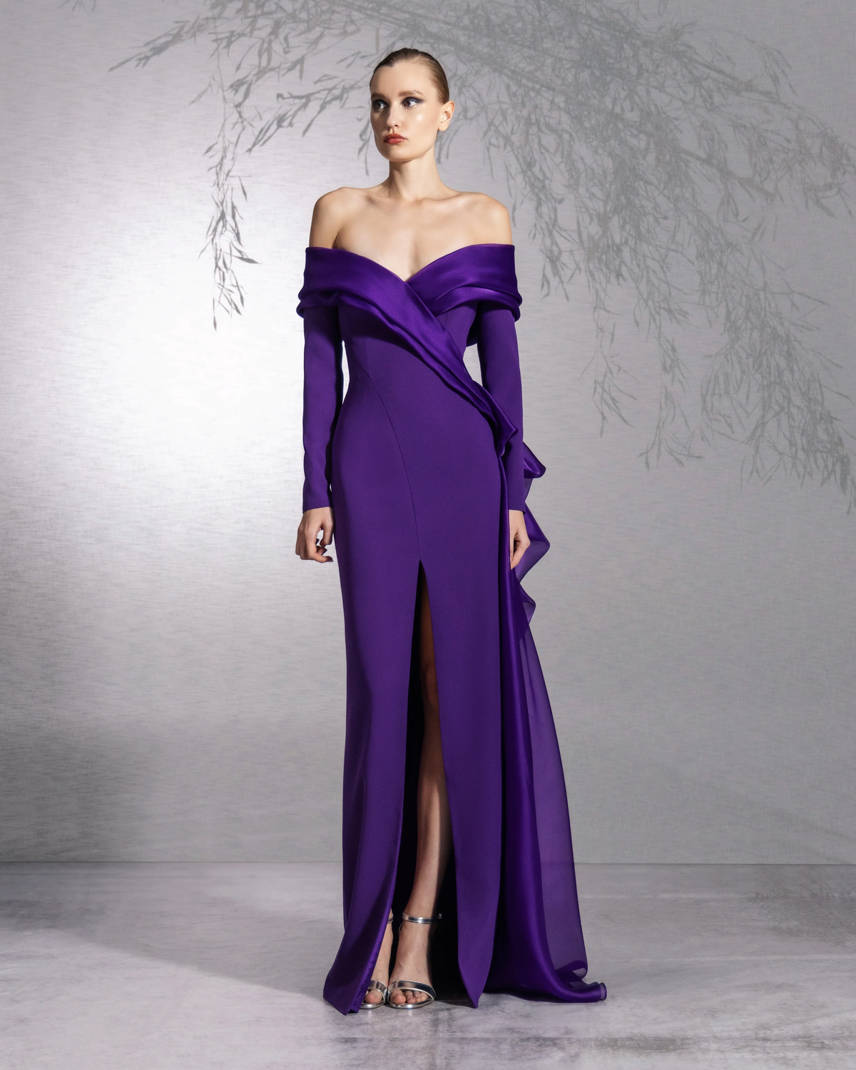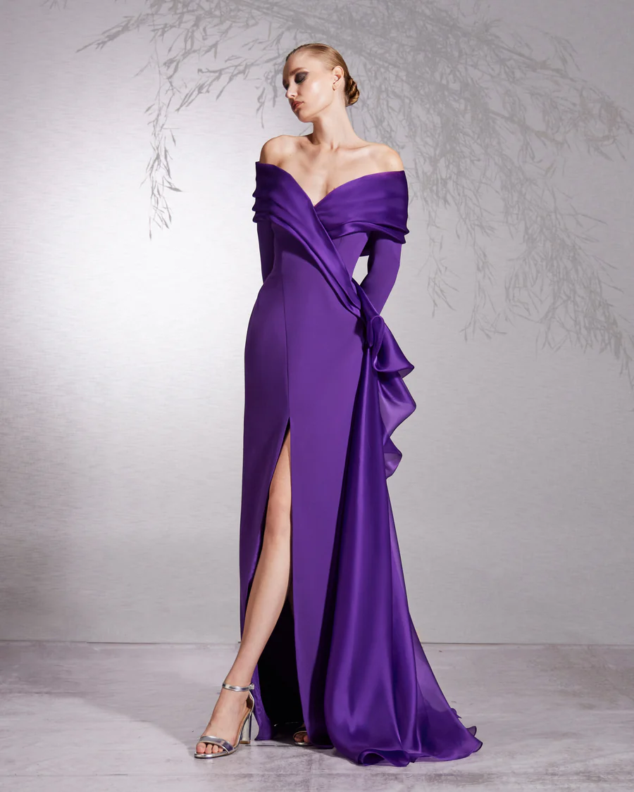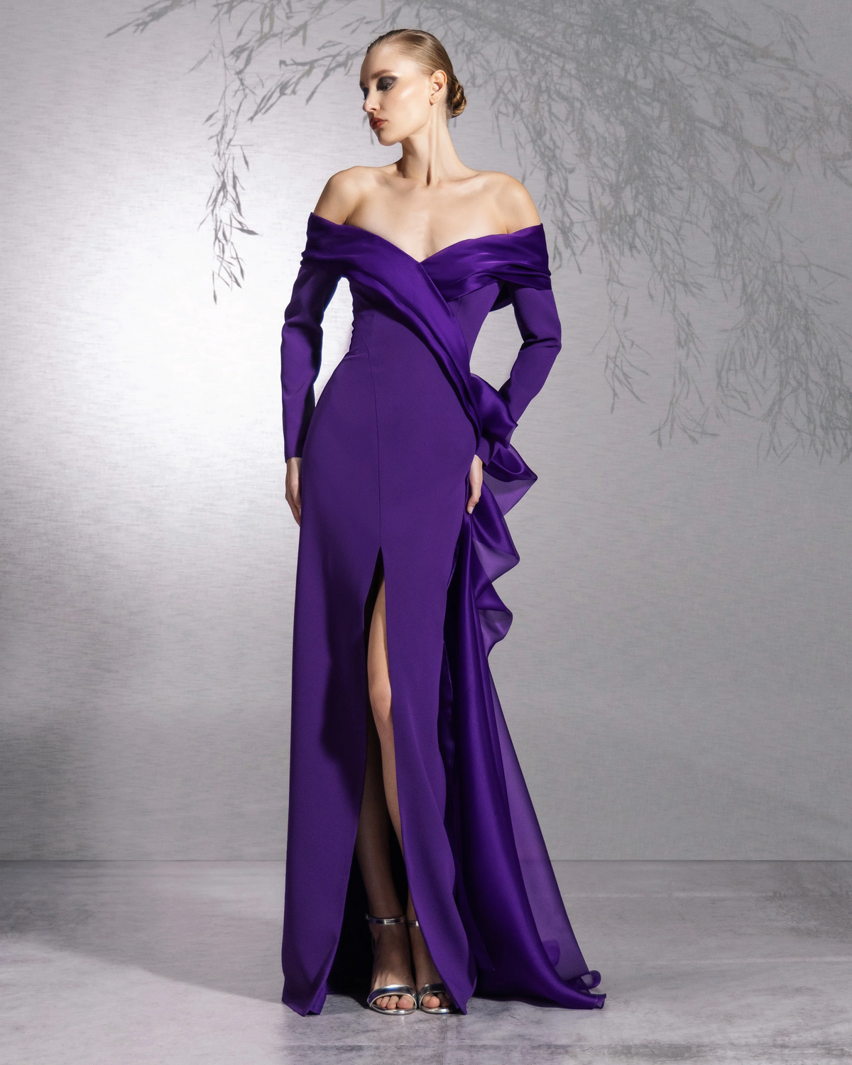 Expertly designed with an elegant off-shoulder neckline and a stunning overskirt, this purple evening dress will make a statement at any formal event. Made with quality materials, this dress not only provides a luxurious look but also ensures comfort and confidence all night long. Perfect for those who want to stand out with a touch of sophistication.