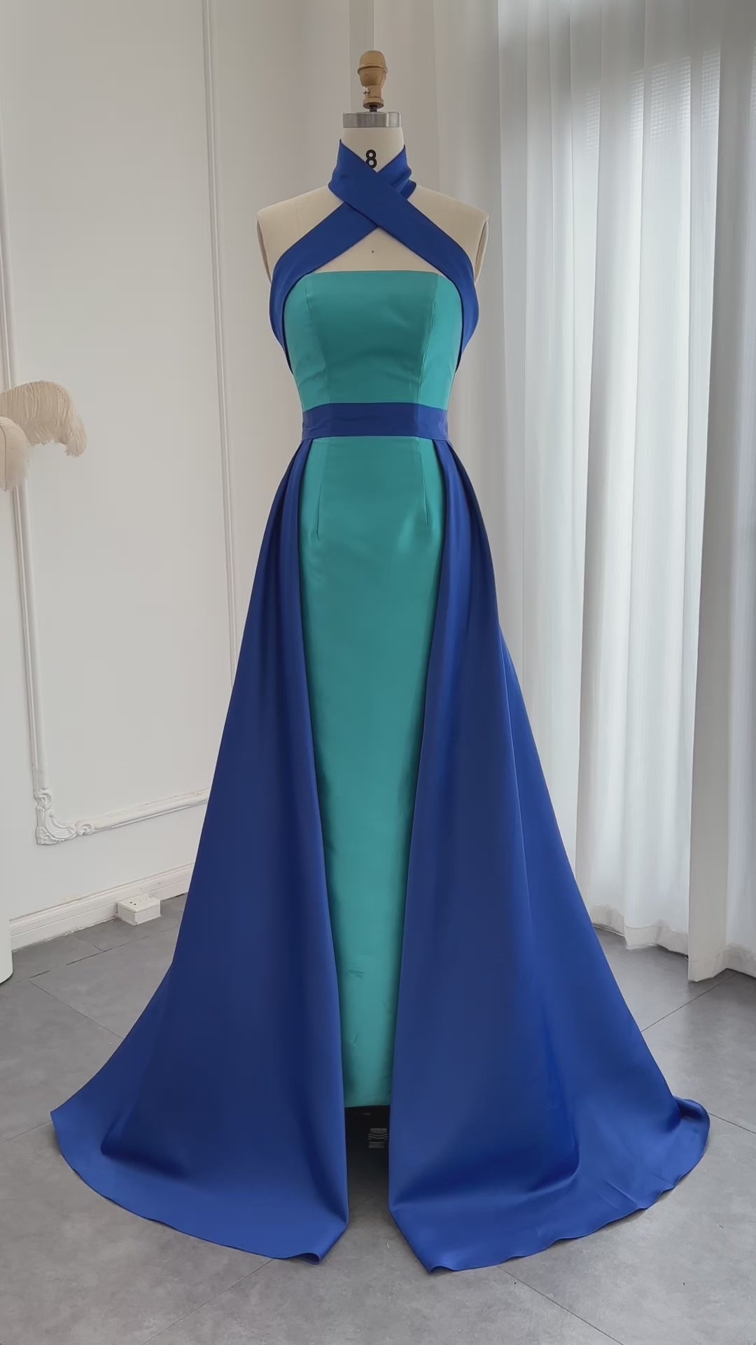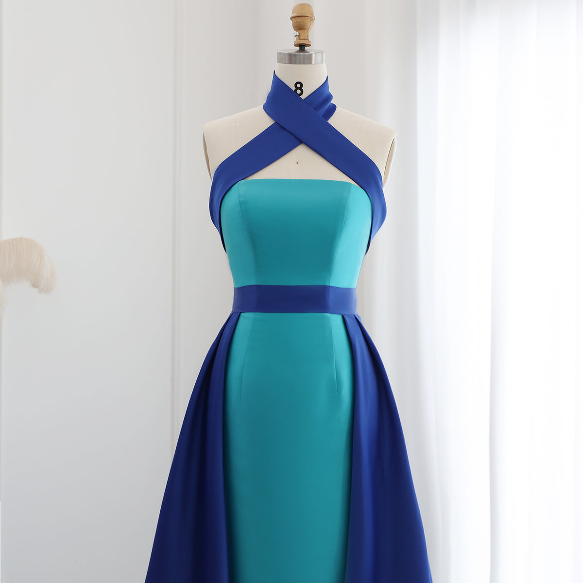 Elegant Royal Blue Contrast Turquoise Evening Dress with Overskirt SF012