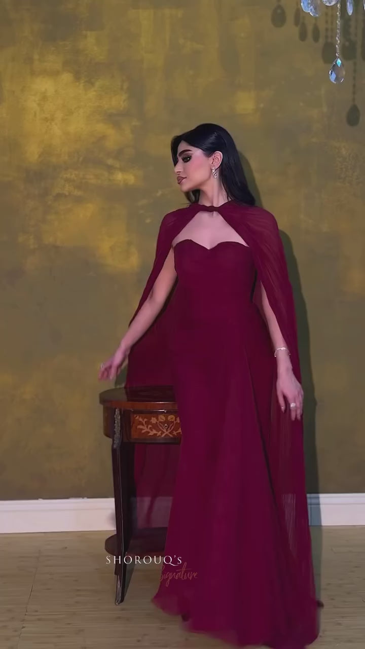 Enhance your evening look with our Elegant Wine Red Chiffon Evening Dress with Cape SF179. Made from premium chiffon, this dress exudes elegance and sophistication. The accompanying cape adds a touch of glamour while providing coverage. Perfect for any formal occasion, this dress will make you stand out in the crowd.