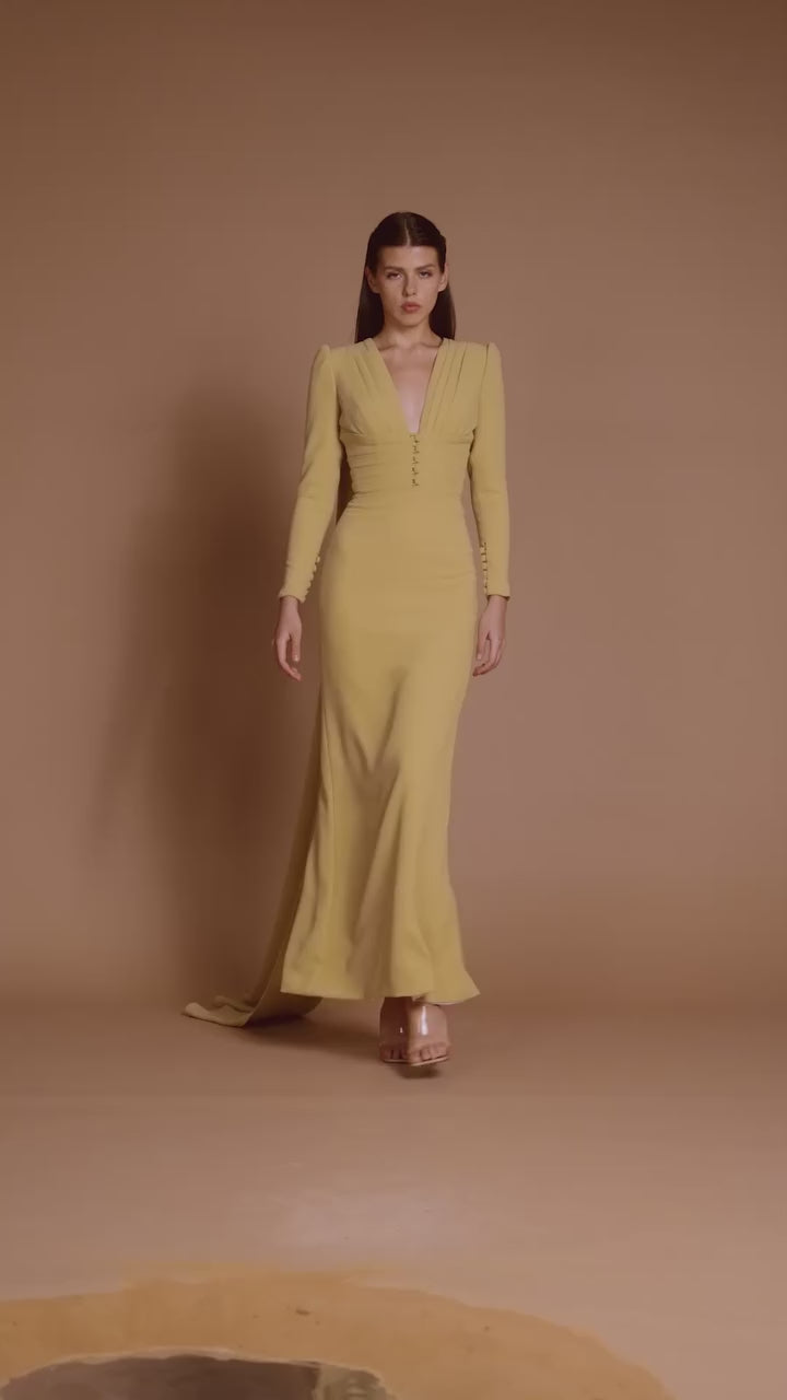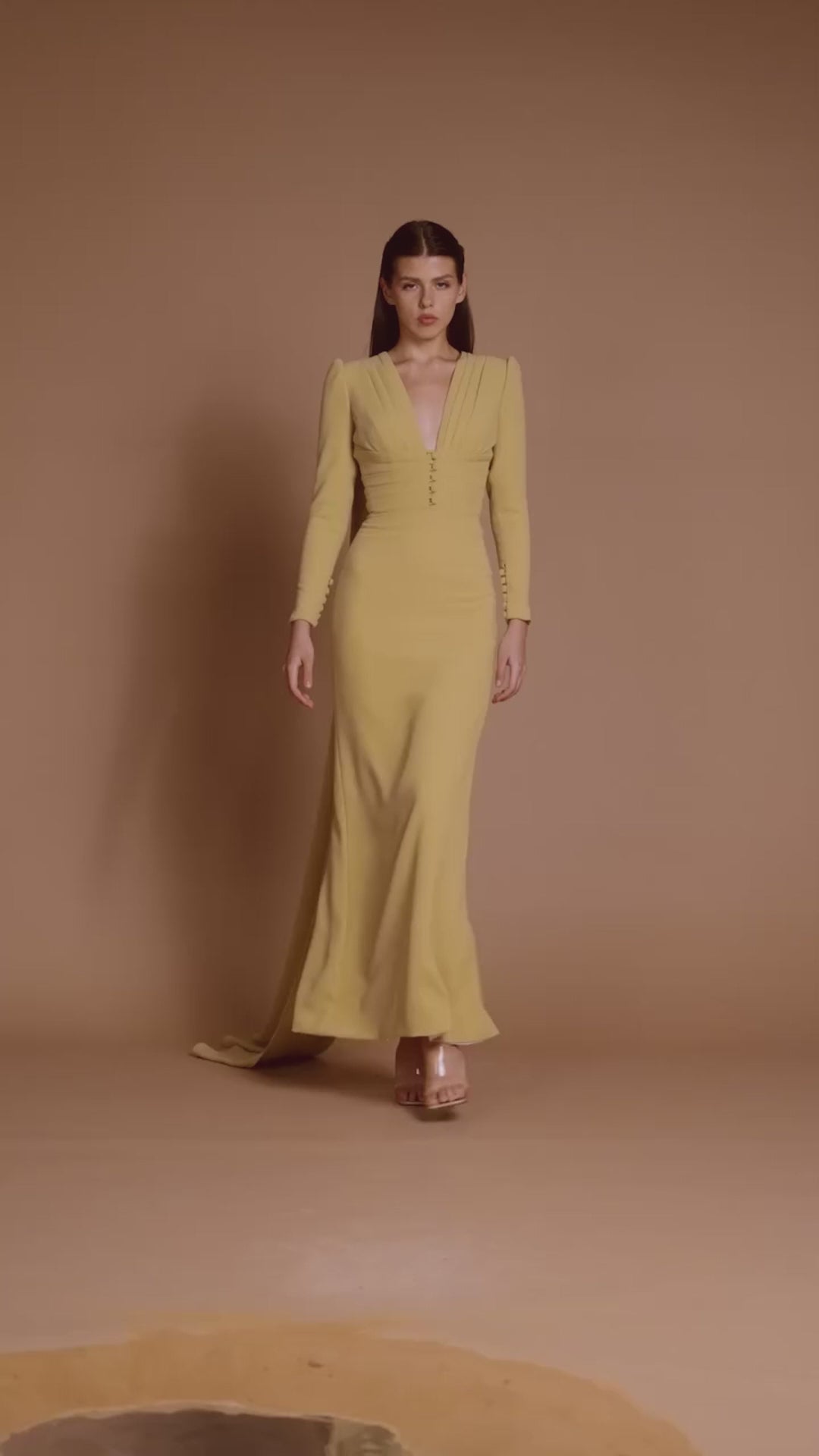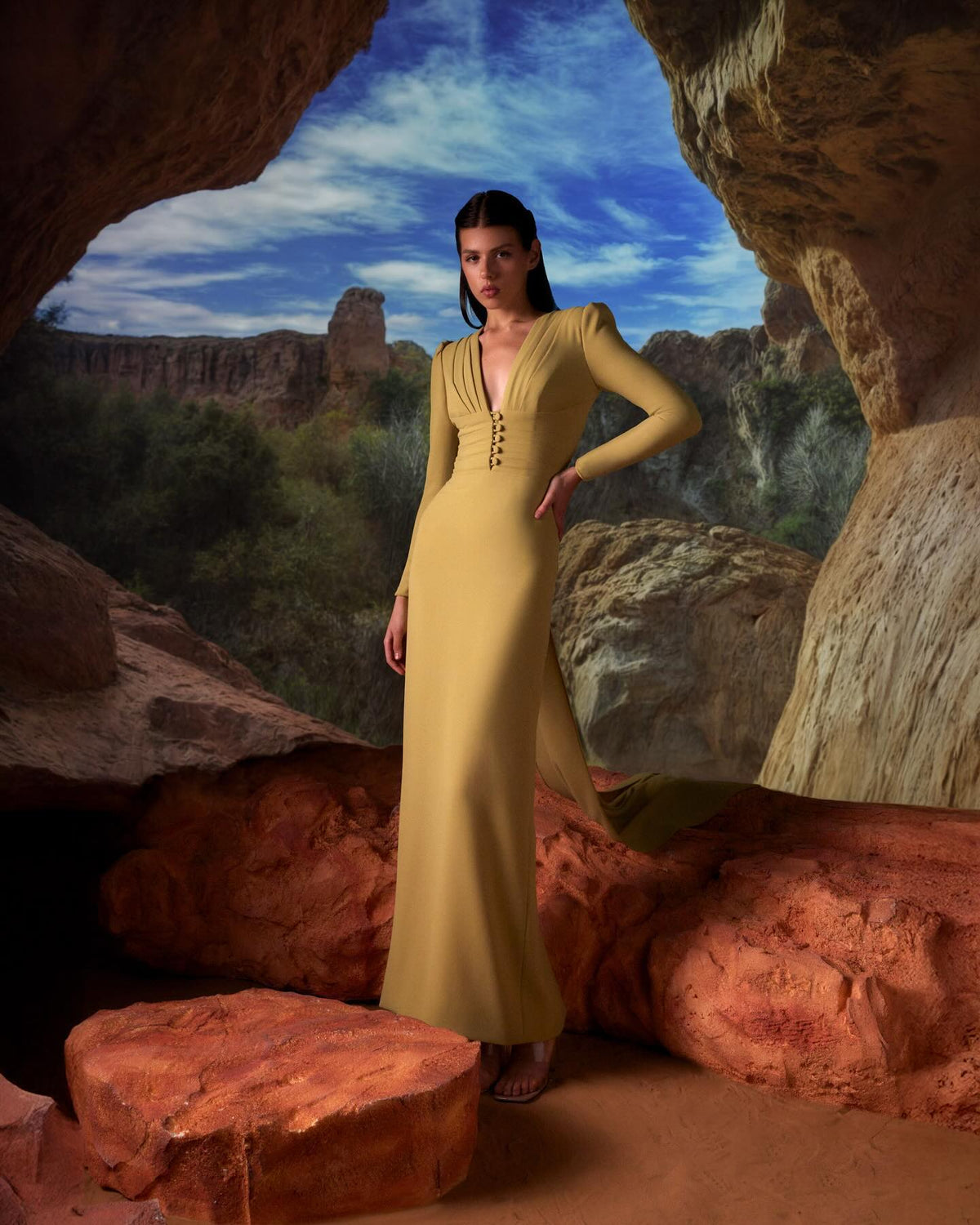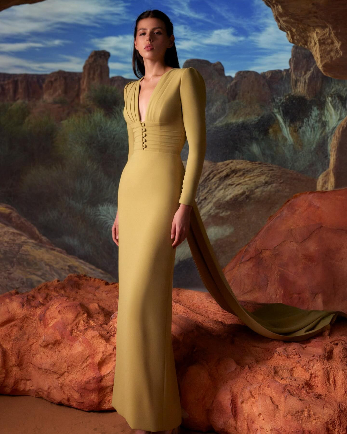 This elegant evening dress, SF173, is designed with long sleeves and a flattering v-neckline. The bright yellow color adds a touch of sophistication to your look. Made with high-quality materials, this dress is perfect for any special occasion. Look and feel your best with our Elegant Yellow Long Sleeves V-Neck Evening Dress SF173.
